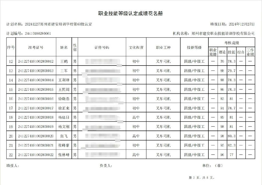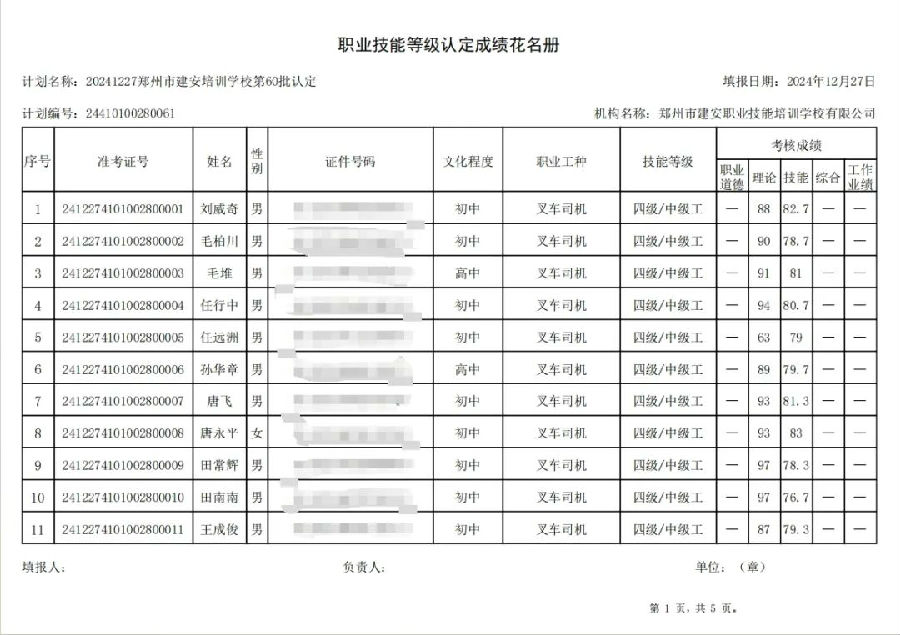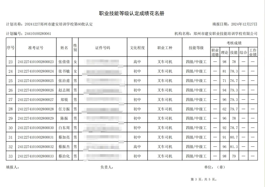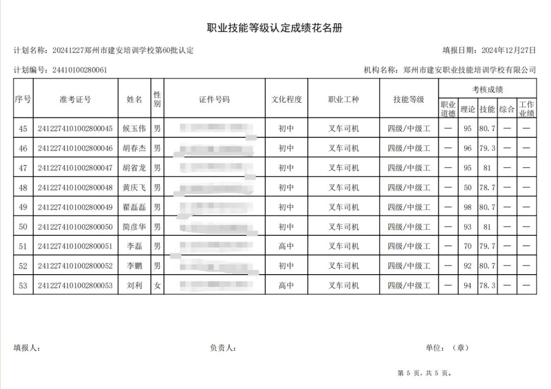 2024年12月27日,在郑州市建安职业技能培训学校进行的第60批次【叉车司机】职业技能等级认定考试,阅卷工作已结束,现将各位考生成绩予以公示,公示期为5天,公示期限为:2024年12月30日至2025年1月3日。