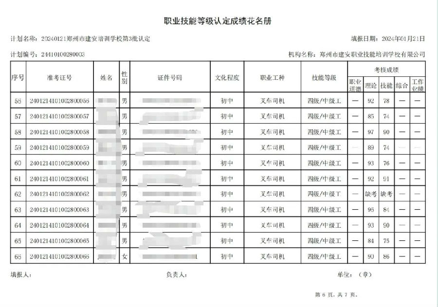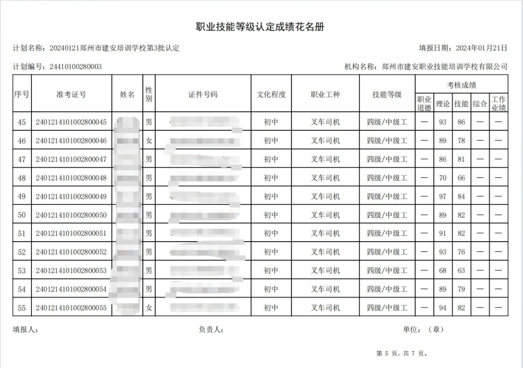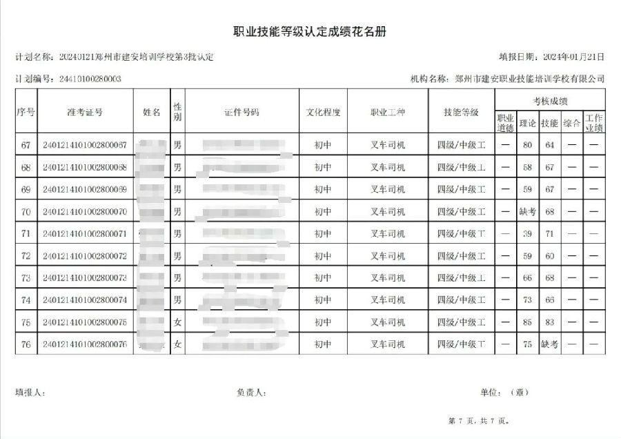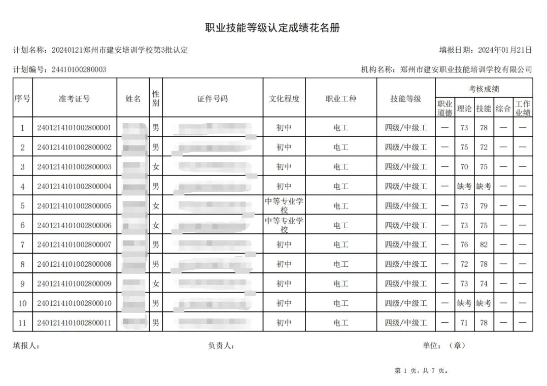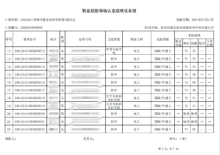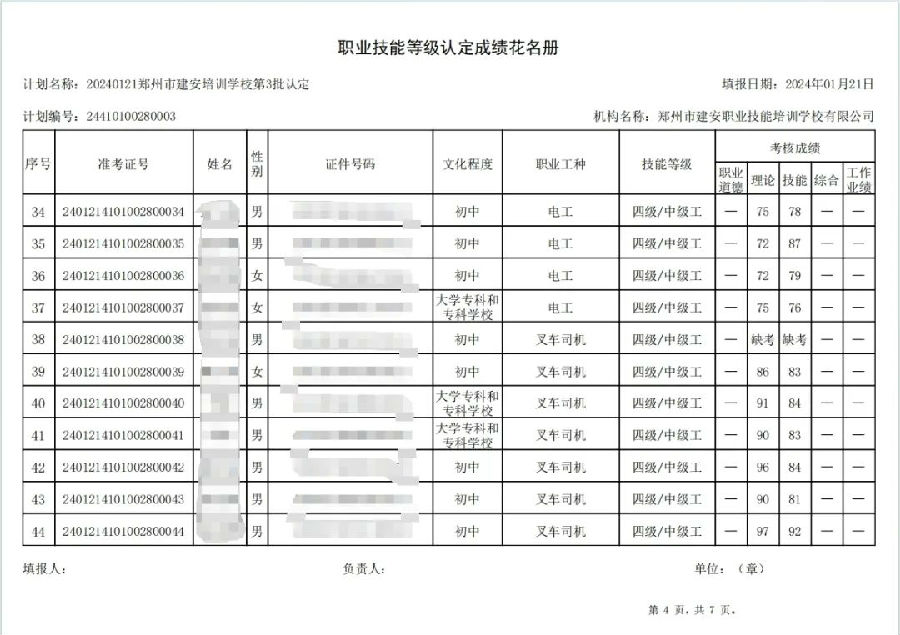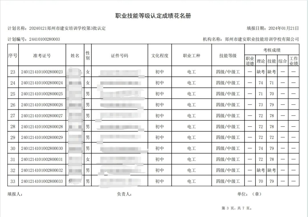 2024年1月21日,在郑州市建安职业技能培训学校进行的第3批次【电工】【叉车司机】职业技能等级认定考试,阅卷工作已结束,现将各位考生成绩予以公示,公示期为3天,公示期限为:2024年1月24日至2024年1月26日。