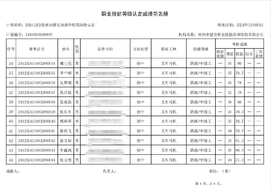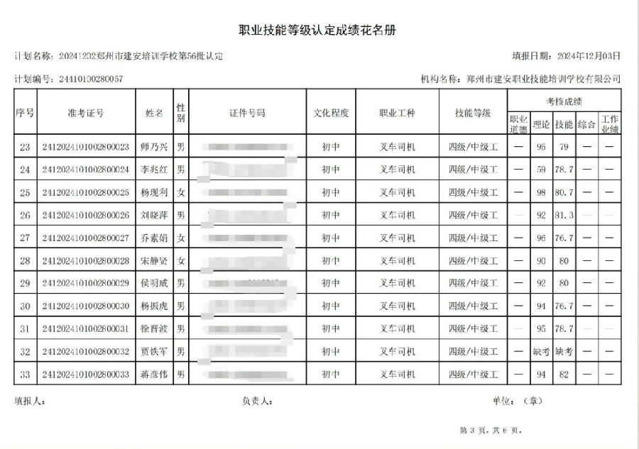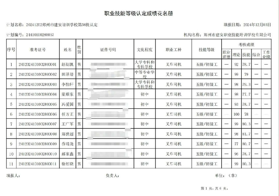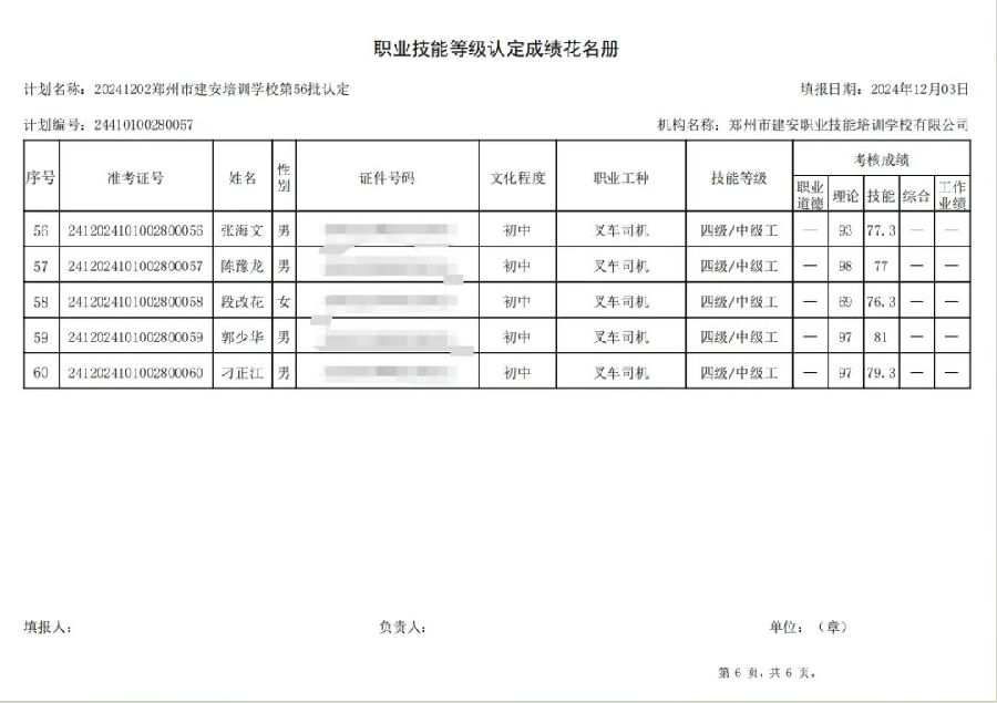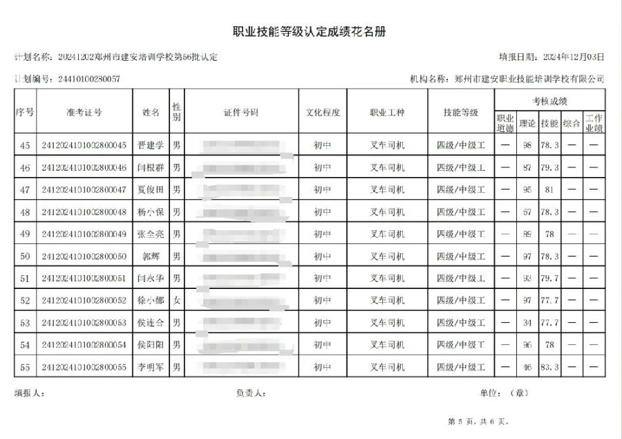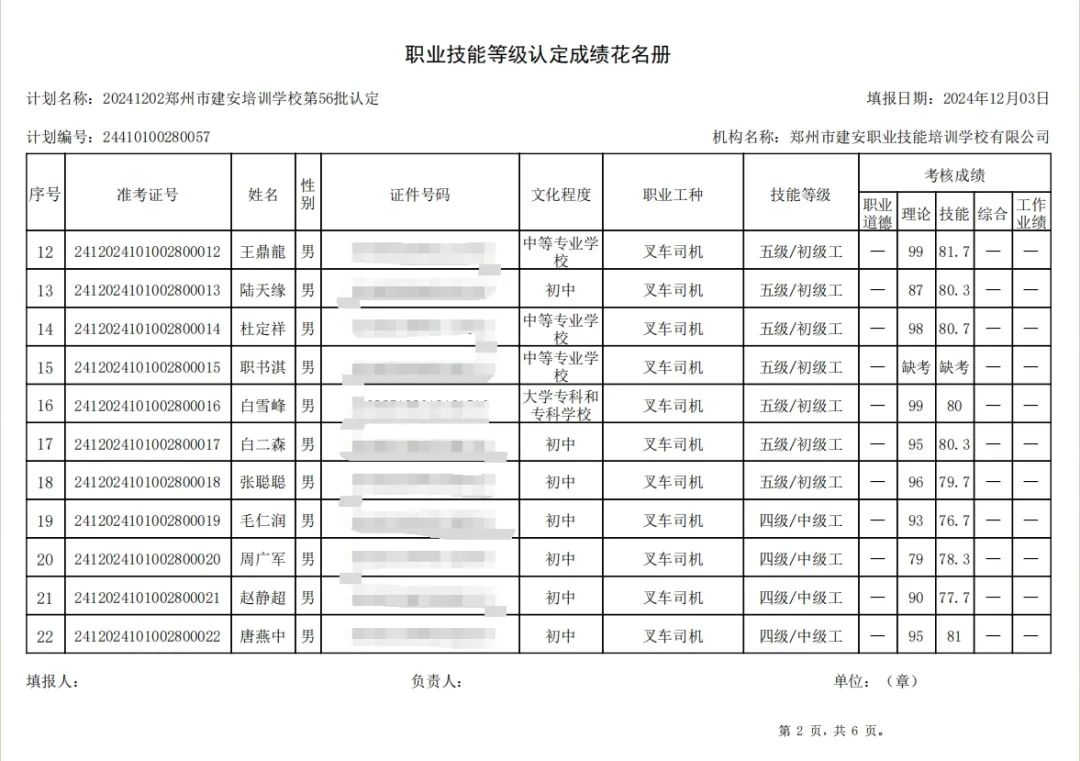 2024年12月2日,在郑州市建安职业技能培训学校进行的第56批次【叉车司机】职业技能等级认定考试,阅卷工作已结束,现将各位考生成绩予以公示,公示期为5天,公示期限为:2024年12月4日至2024年12月8日。