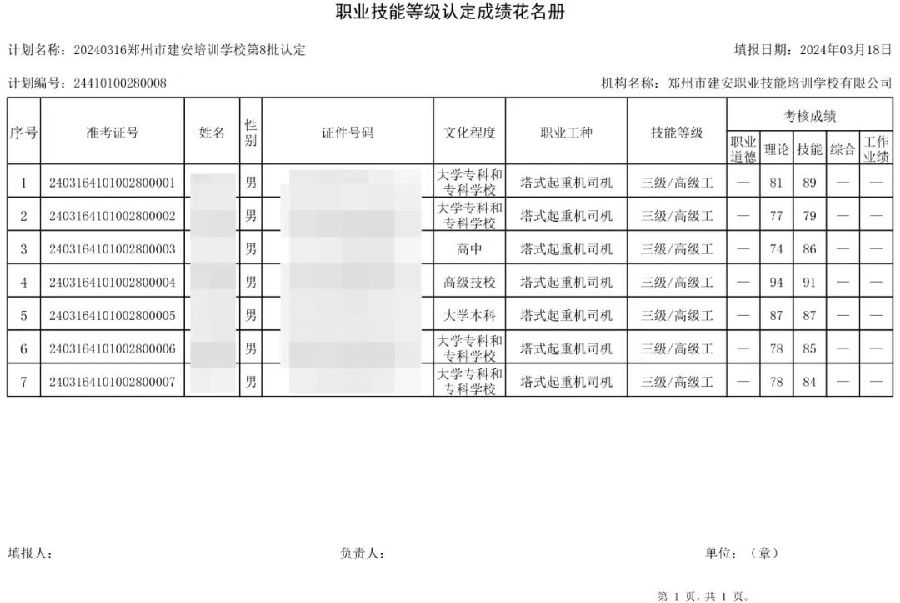 2024年3月16日,在郑州市建安职业技能培训学校进行的第8批次【塔式起重机司机】职业技能等级认定考试,阅卷工作已结束,现将各位考生成绩予以公示,公示期为3天,公示期限为:2024年3月18日至2024年3月20日。