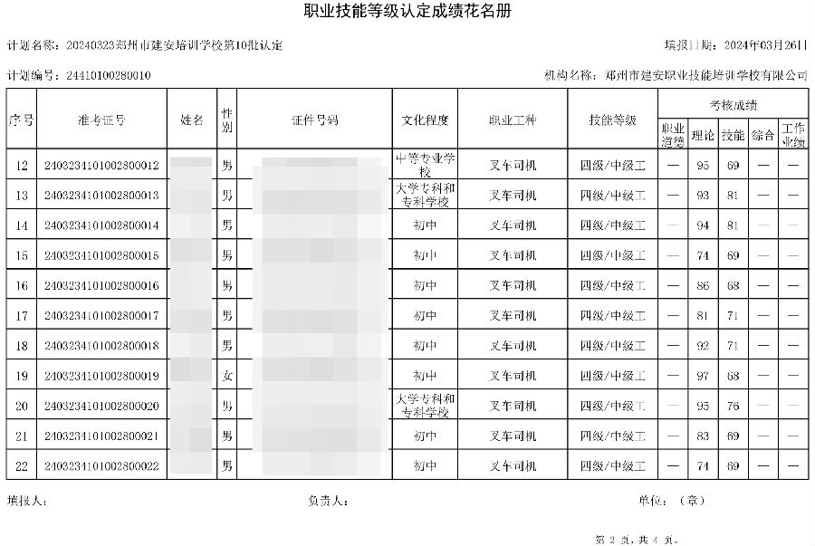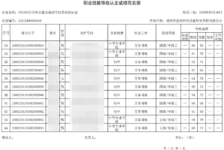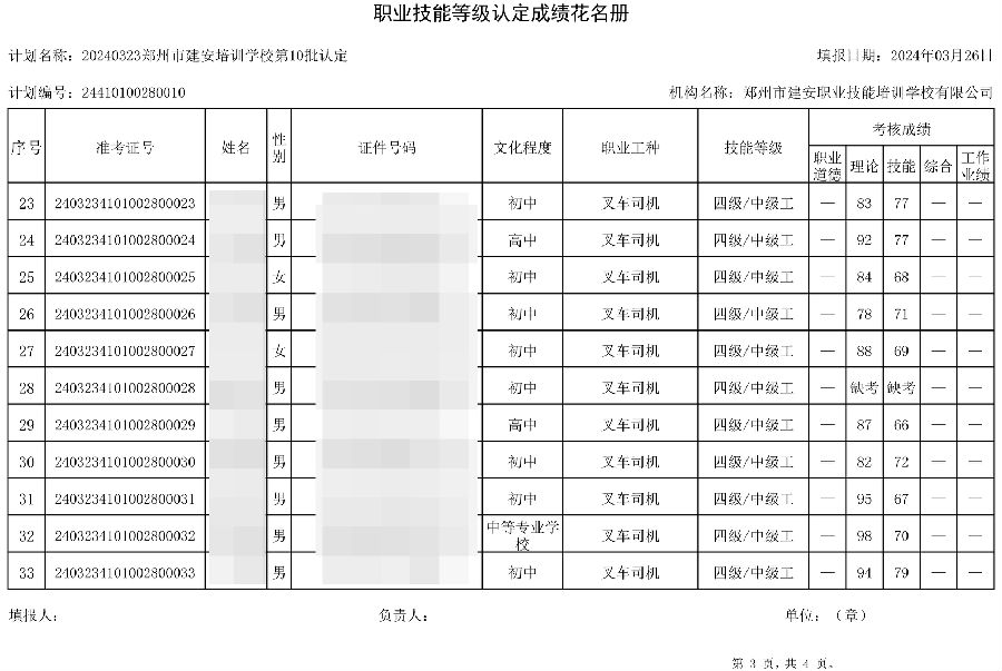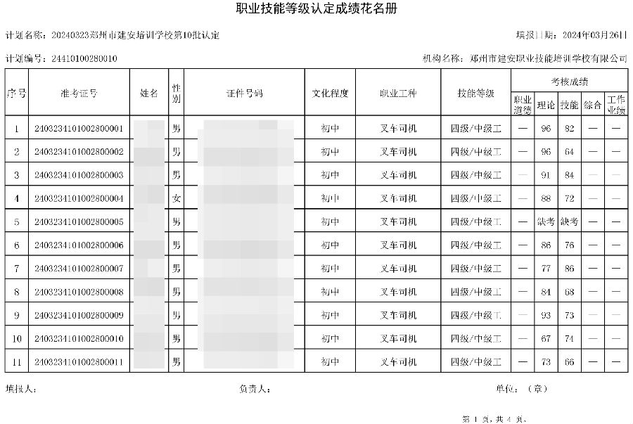 2024年3月23日,在郑州市建安职业技能培训学校进行的第10批次【叉车司机】职业技能等级认定考试,阅卷工作已结束,现将各位考生成绩予以公示,公示期为3天,公示期限为:2024年3月27日至2024年3月29日。