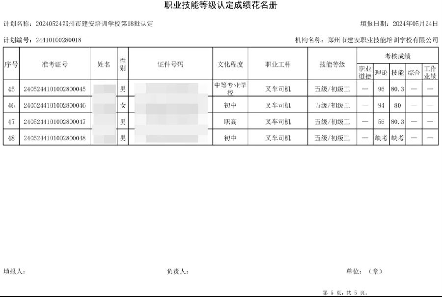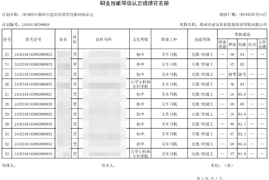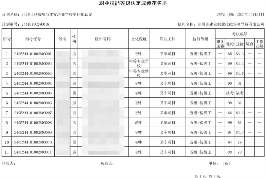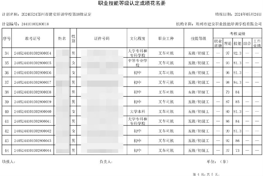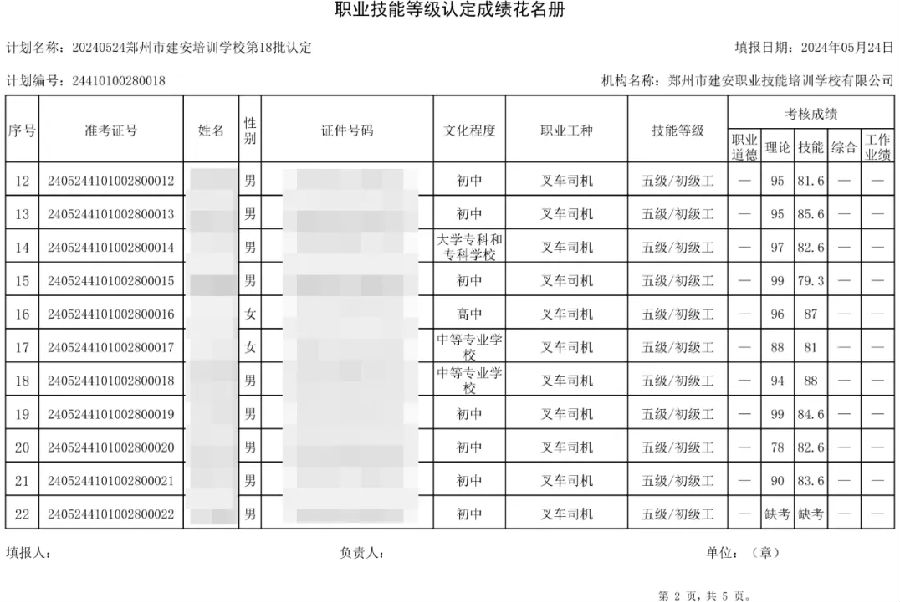 2024年5月24日,在郑州市建安职业技能培训学校进行的第18批次【叉车司机】职业技能等级认定考试,阅卷工作已结束,现将各位考生成绩予以公示,公示期为5天,公示期限为:2024年5月25日至2024年5月29日。