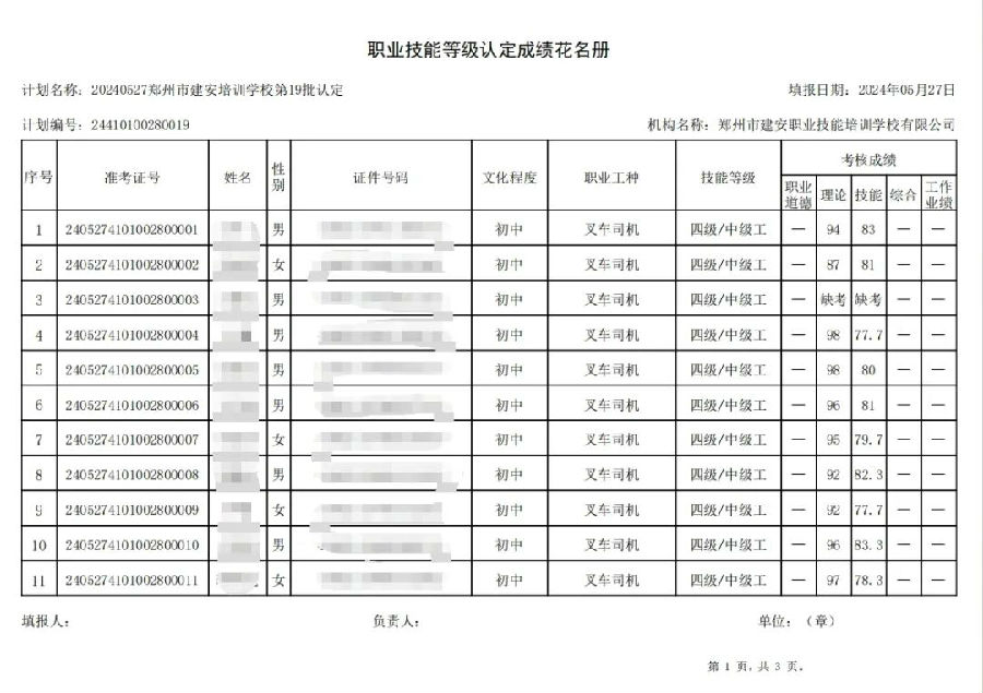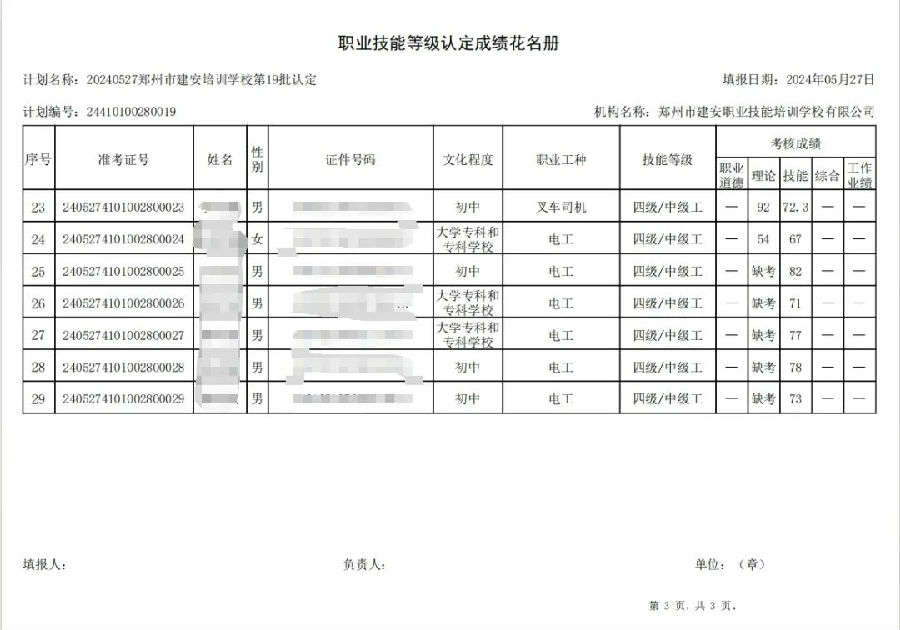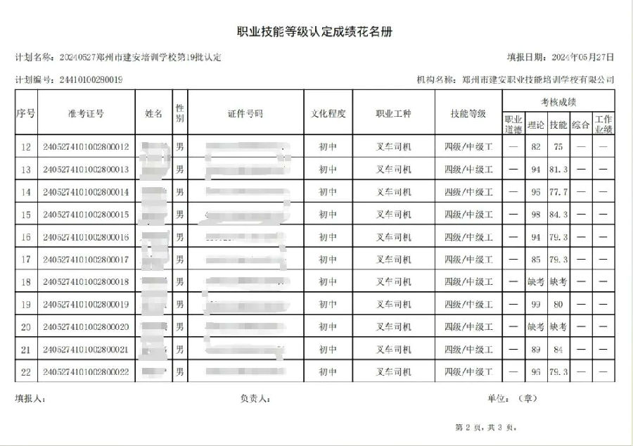 2024年5月27日,在郑州市建安职业技能培训学校进行的第19批次【叉车司机】【电工】职业技能等级认定考试,阅卷工作已结束,现将各位考生成绩予以公示,公示期为5天,公示期限为:2024年5月29日至2024年6月2日。