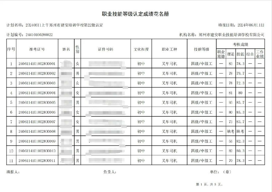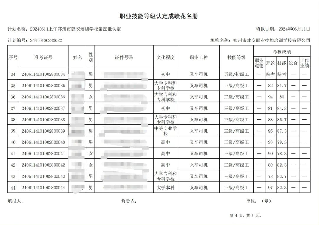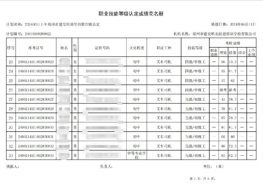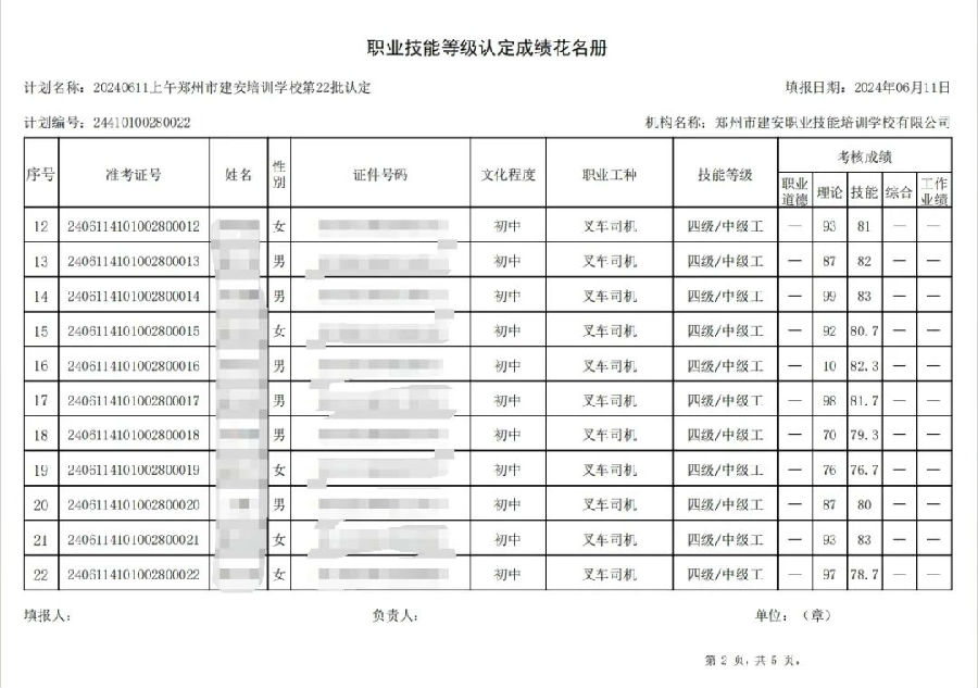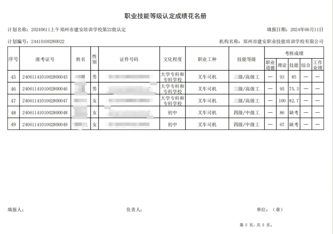 2024年6月11日上午,在郑州市建安职业技能培训学校进行的第22批次【叉车司机】职业技能等级认定考试,阅卷工作已结束,现将各位考生成绩予以公示,公示期为5天,公示期限为:2024年6月13日至2024年6月17日。