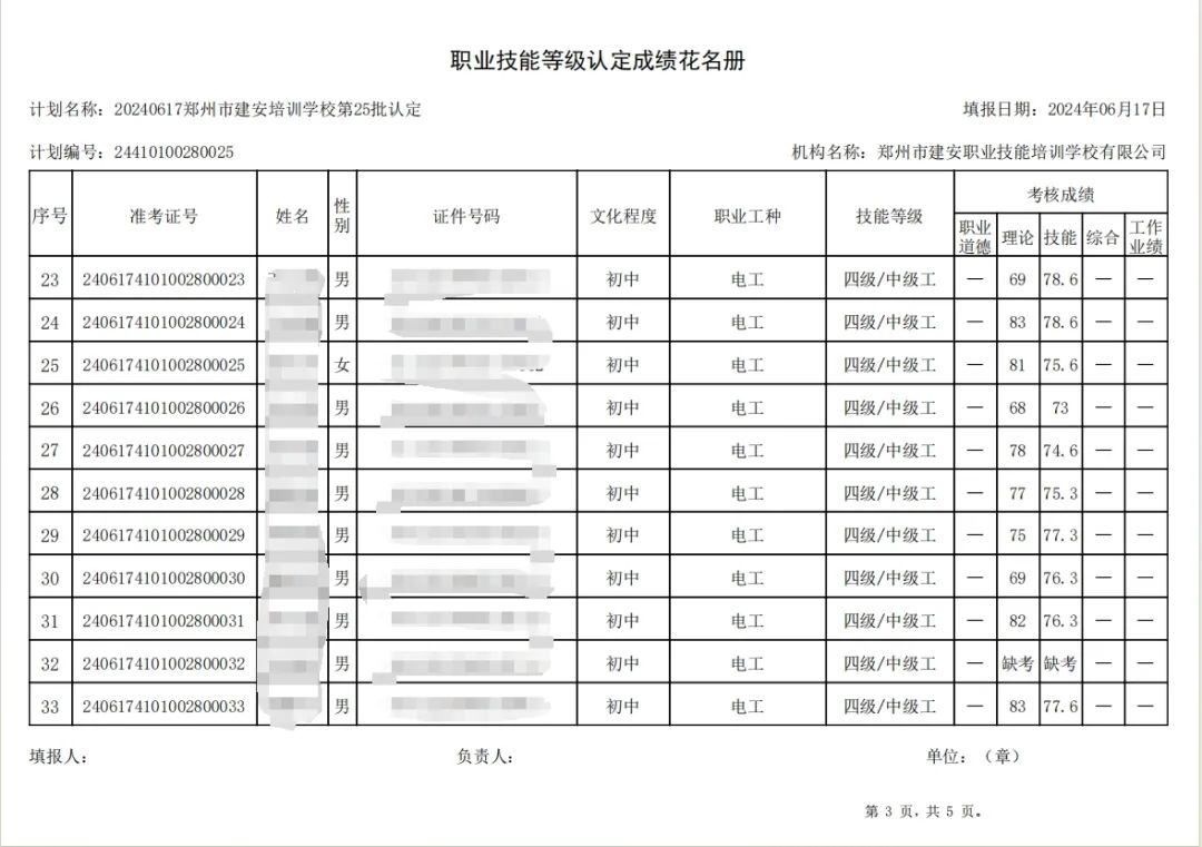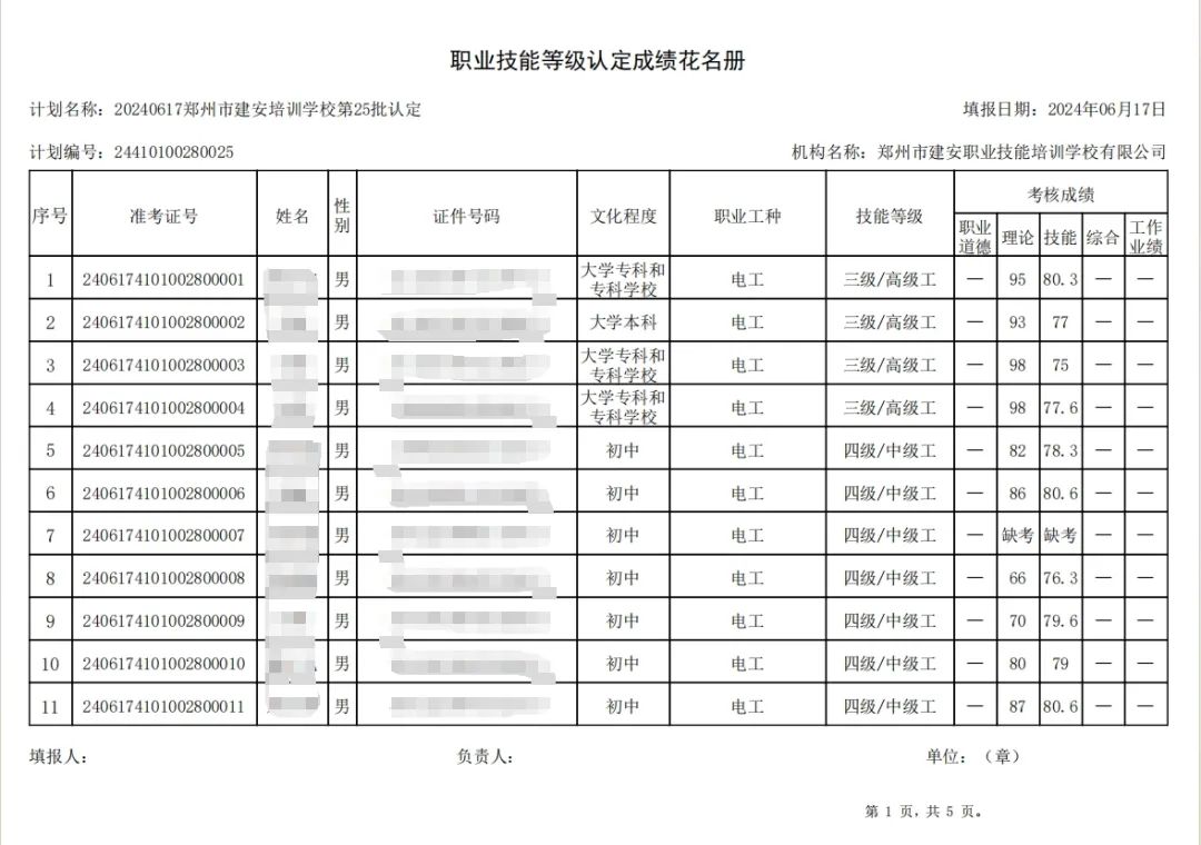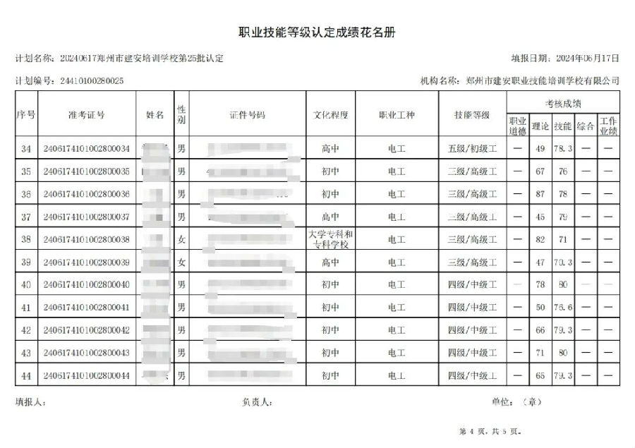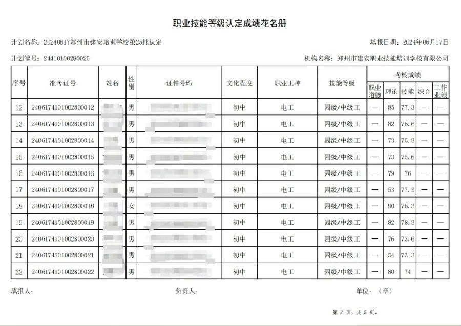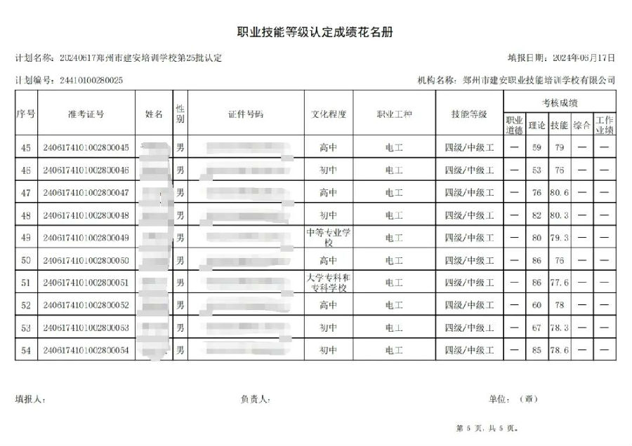 2024年6月17日,在郑州市建安职业技能培训学校进行的第25批次【电工】职业技能等级认定考试,阅卷工作已结束,现将各位考生成绩予以公示,公示期为5天,公示期限为:2024年6月19日至2024年6月23日。