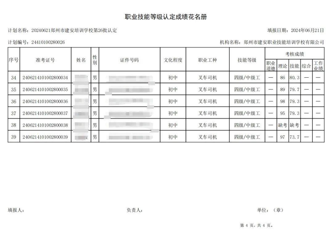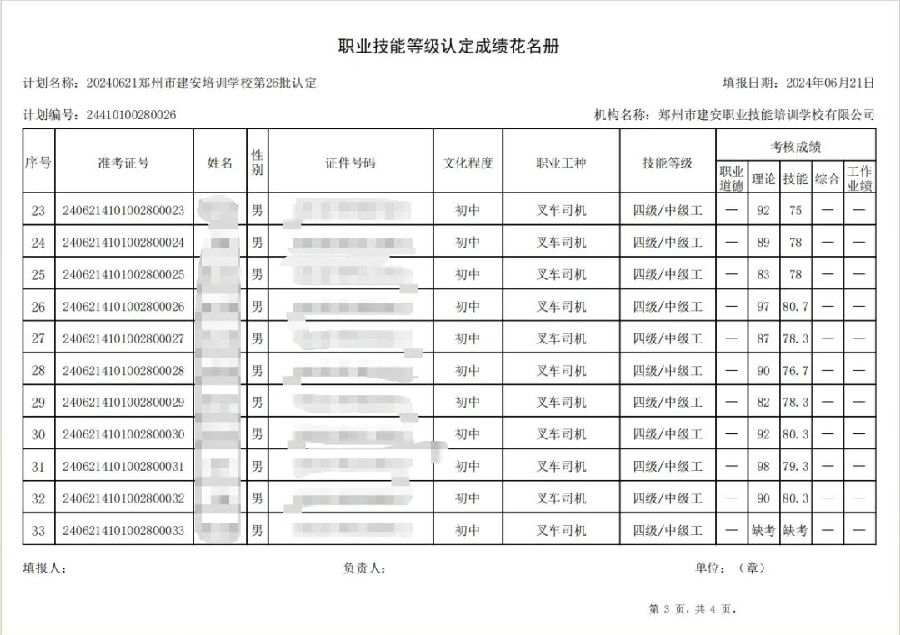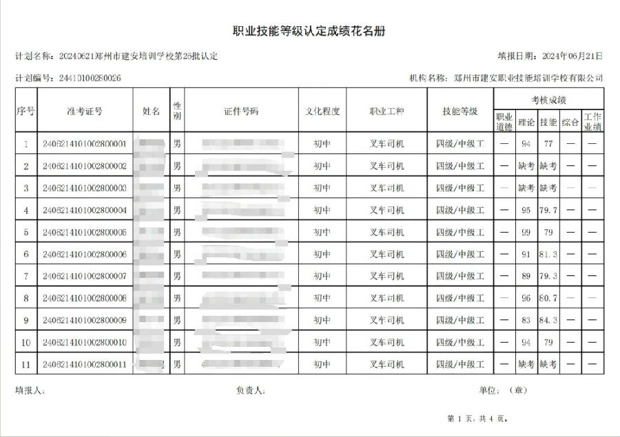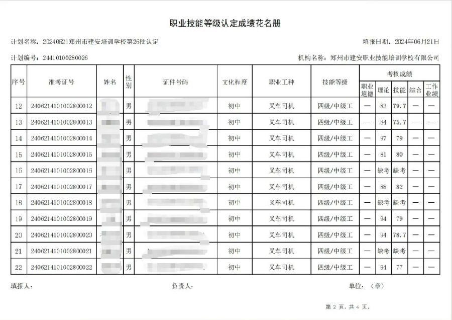 2024年6月21日,在郑州市建安职业技能培训学校进行的第26批次【叉车司机】职业技能等级认定考试,阅卷工作已结束,现将各位考生成绩予以公示,公示期为5天,公示期限为:2024年6月22日至2024年6月26日。