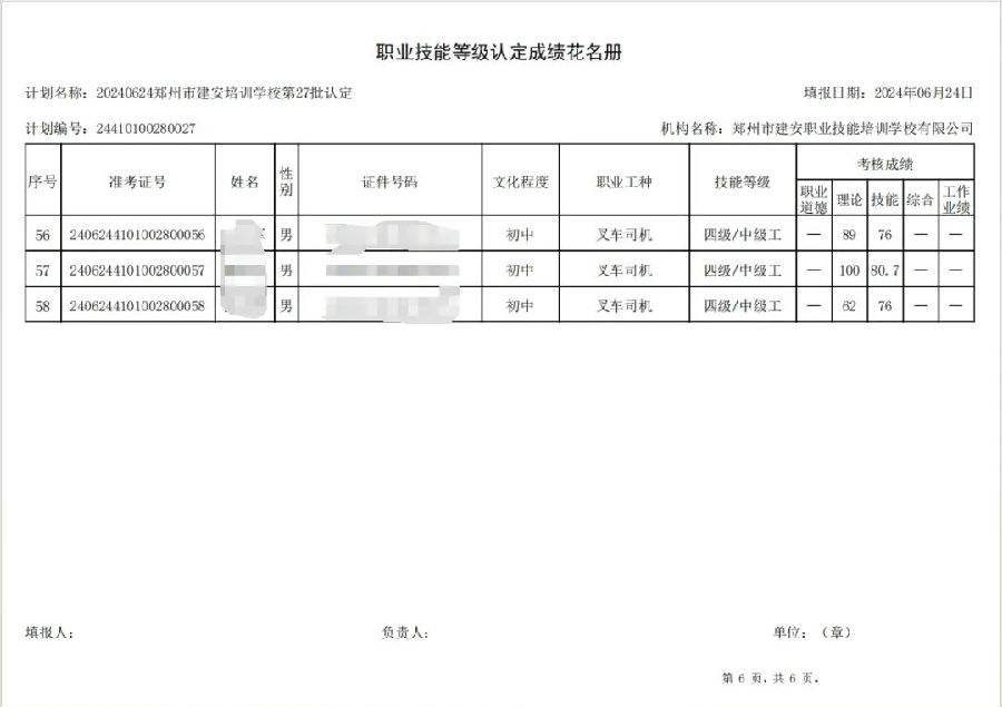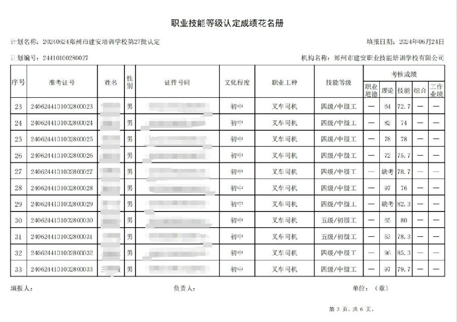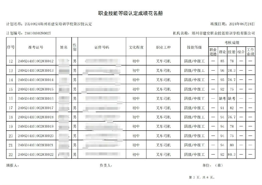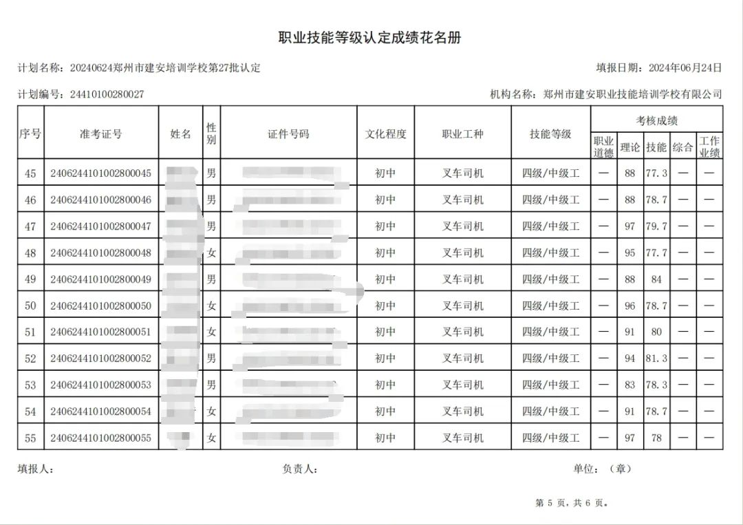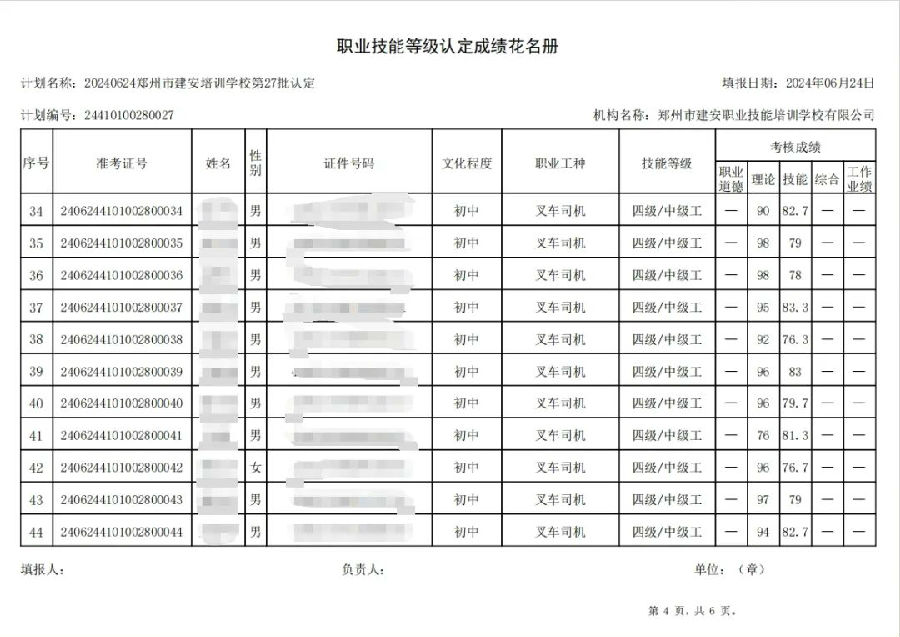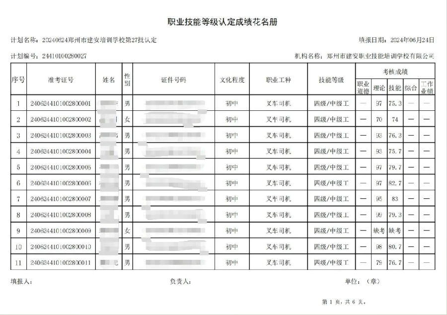 2024年6月24日,在郑州市建安职业技能培训学校进行的第27批次【叉车司机】职业技能等级认定考试,阅卷工作已结束,现将各位考生成绩予以公示,公示期为5天,公示期限为:2024年6月26日至2024年6月30日。