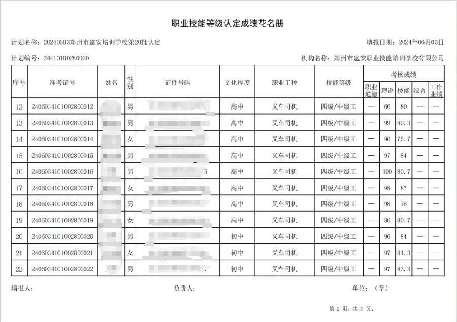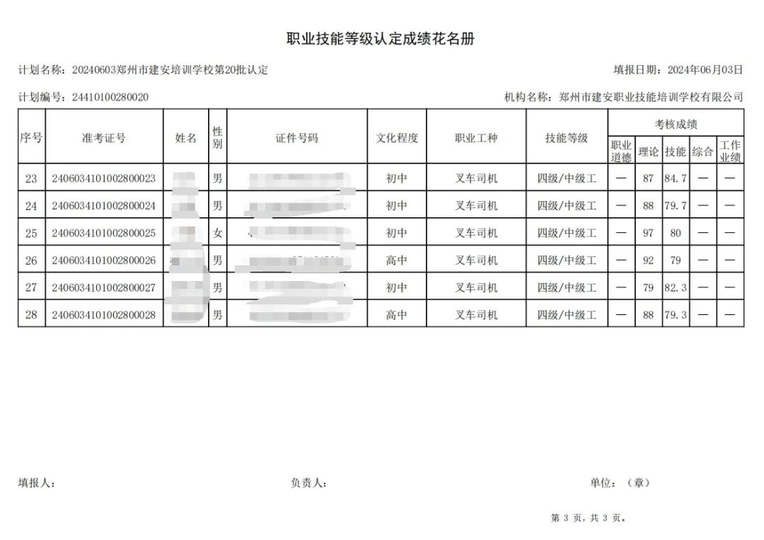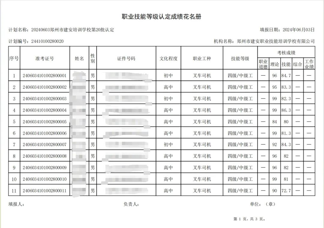 2024年6月3日,在郑州市建安职业技能培训学校进行的第20批次【叉车司机】职业技能等级认定考试,阅卷工作已结束,现将各位考生成绩予以公示,公示期为5天,公示期限为:2024年6月3日至2024年6月7日。