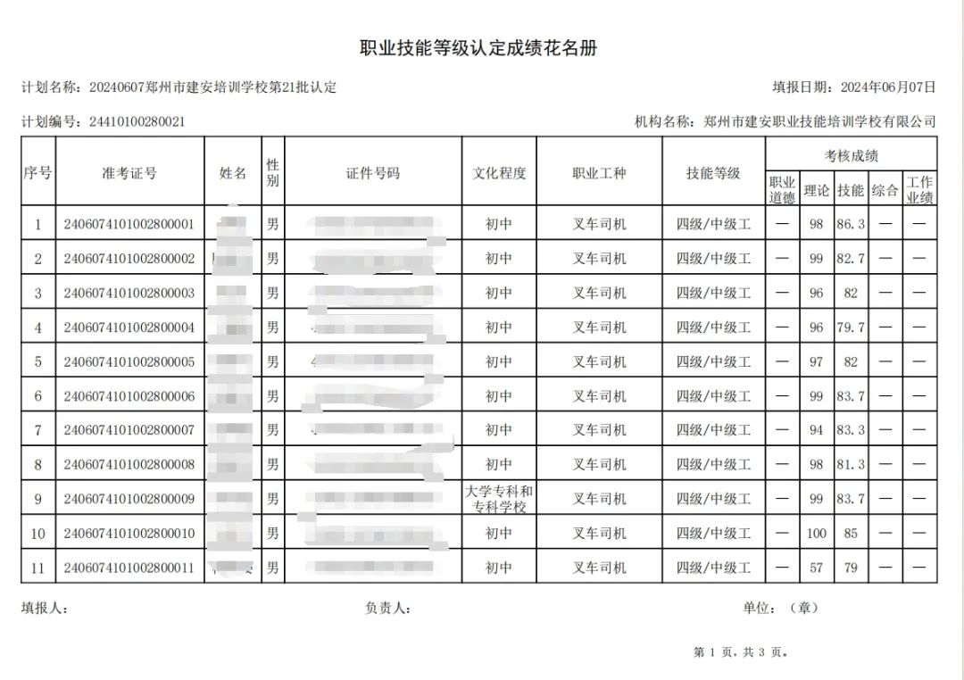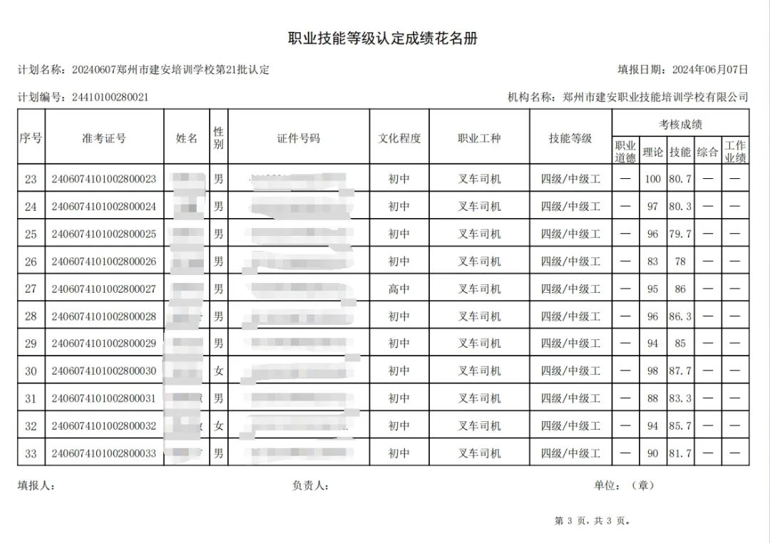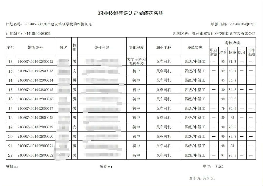 2024年6月7日,在郑州市建安职业技能培训学校进行的第21批次【叉车司机】职业技能等级认定考试,阅卷工作已结束,现将各位考生成绩予以公示,公示期为5天,公示期限为:2024年6月7日至2024年6月11日。