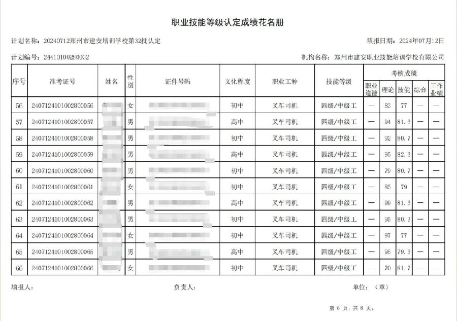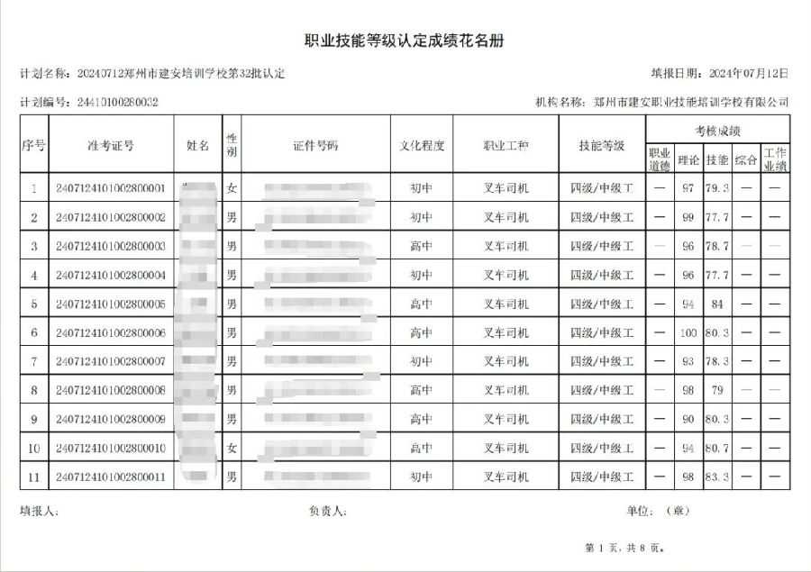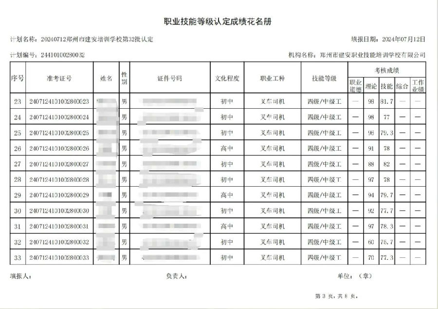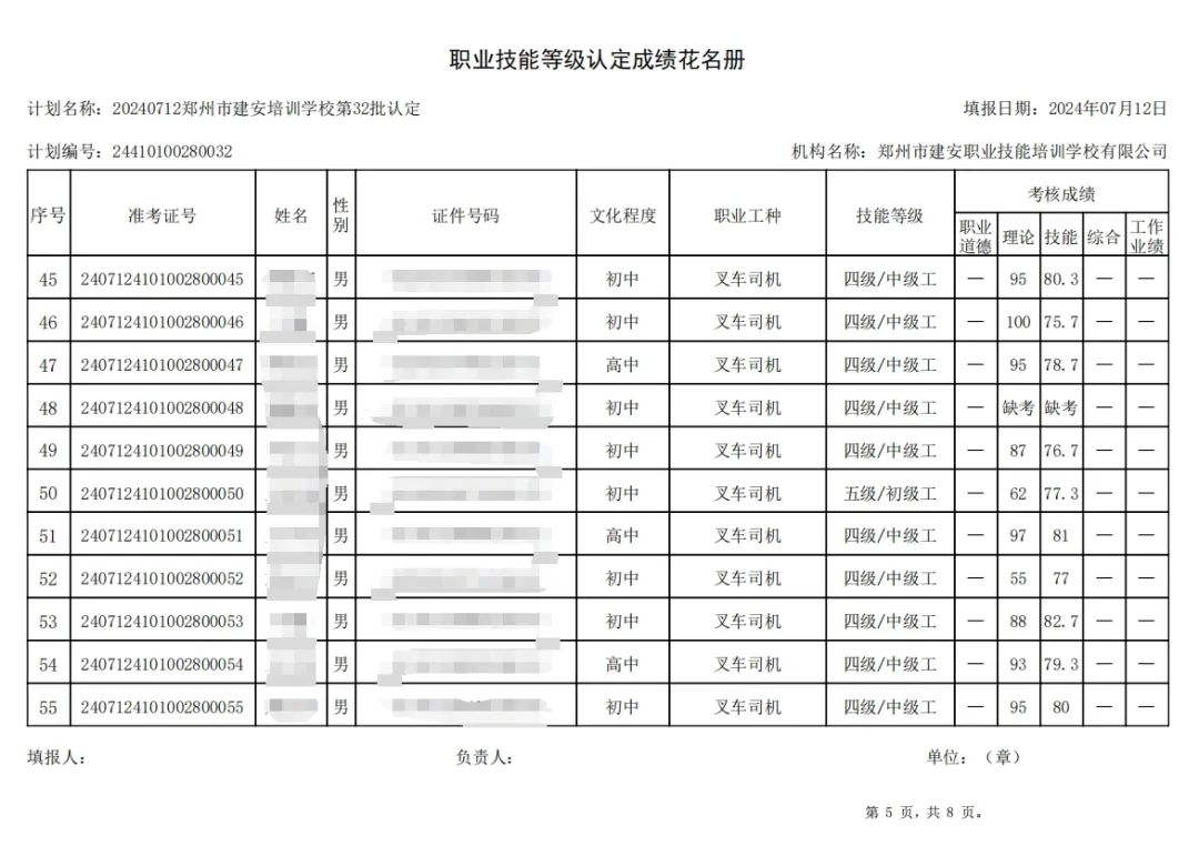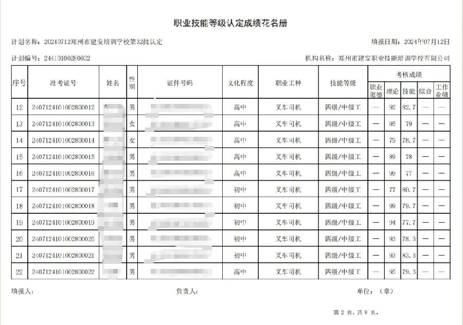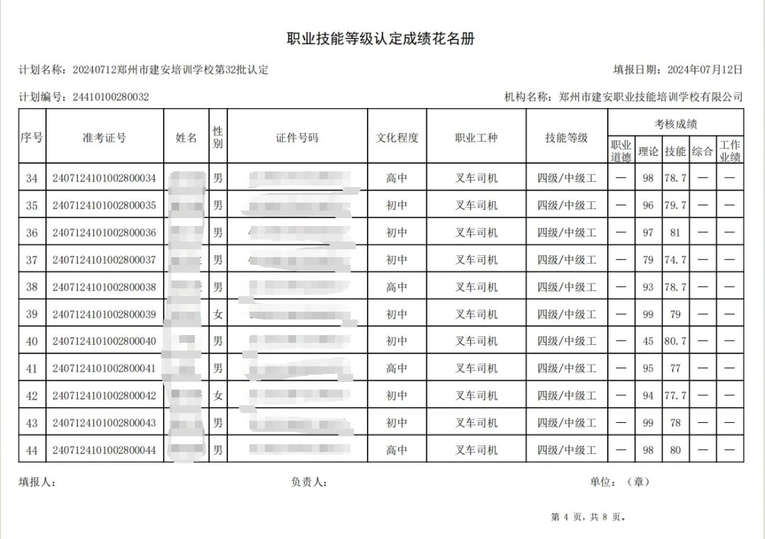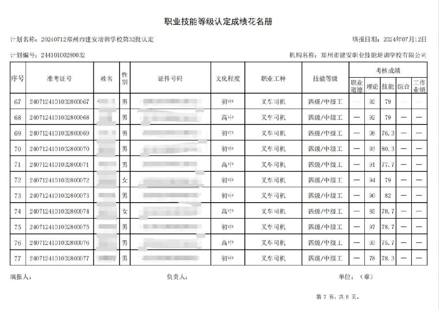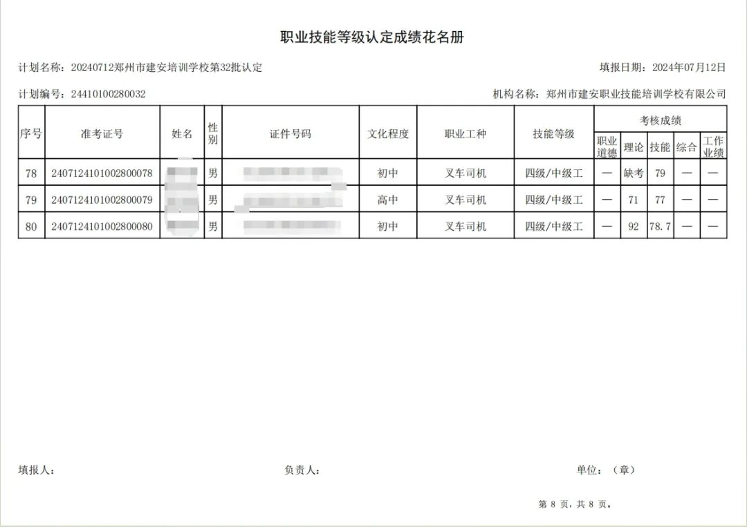 2024年7月12日,在郑州市建安职业技能培训学校进行的第32批次【叉车司机】职业技能等级认定考试,阅卷工作已结束,现将各位考生成绩予以公示,公示期为5天,公示期限为:2024年7月17日至2024年7月21日。