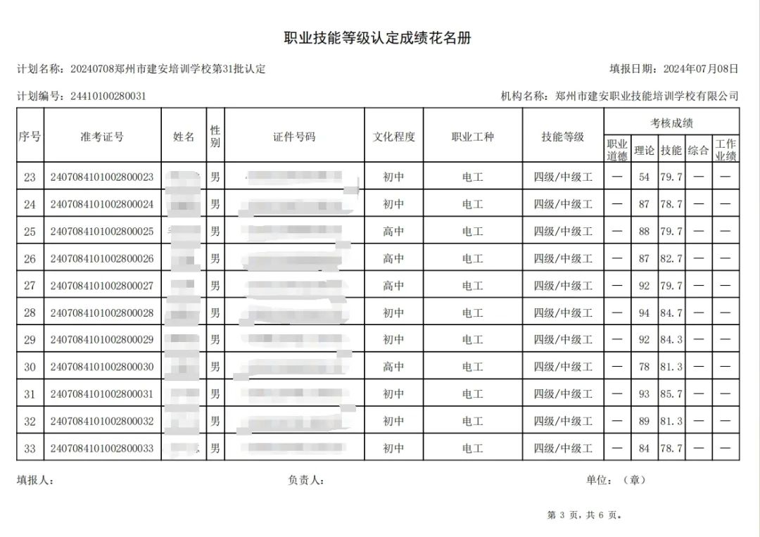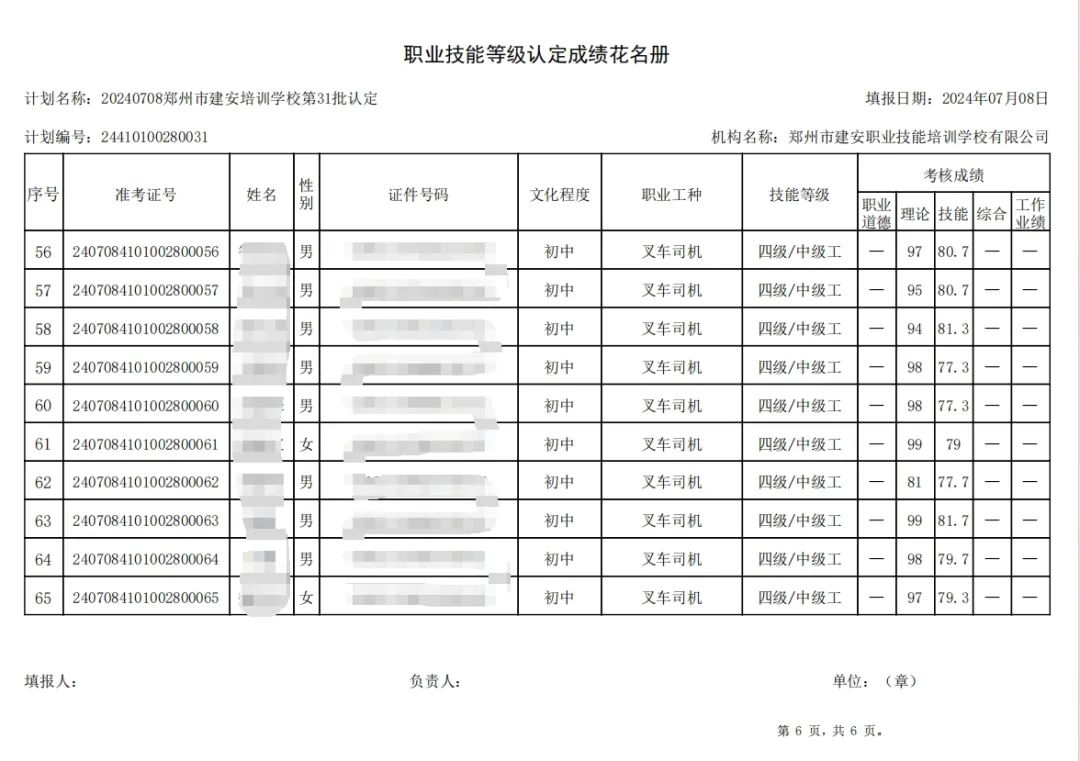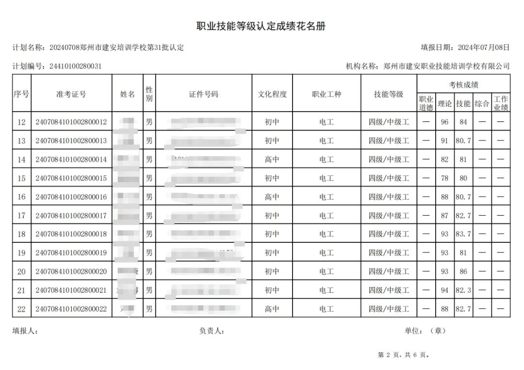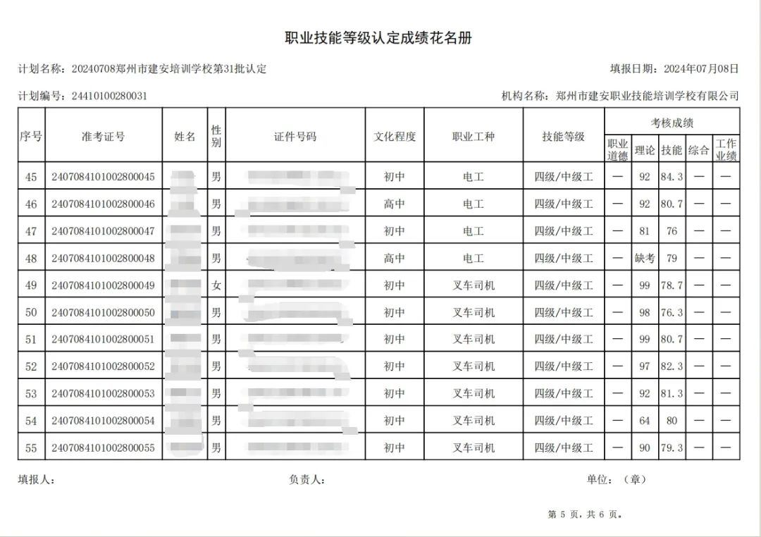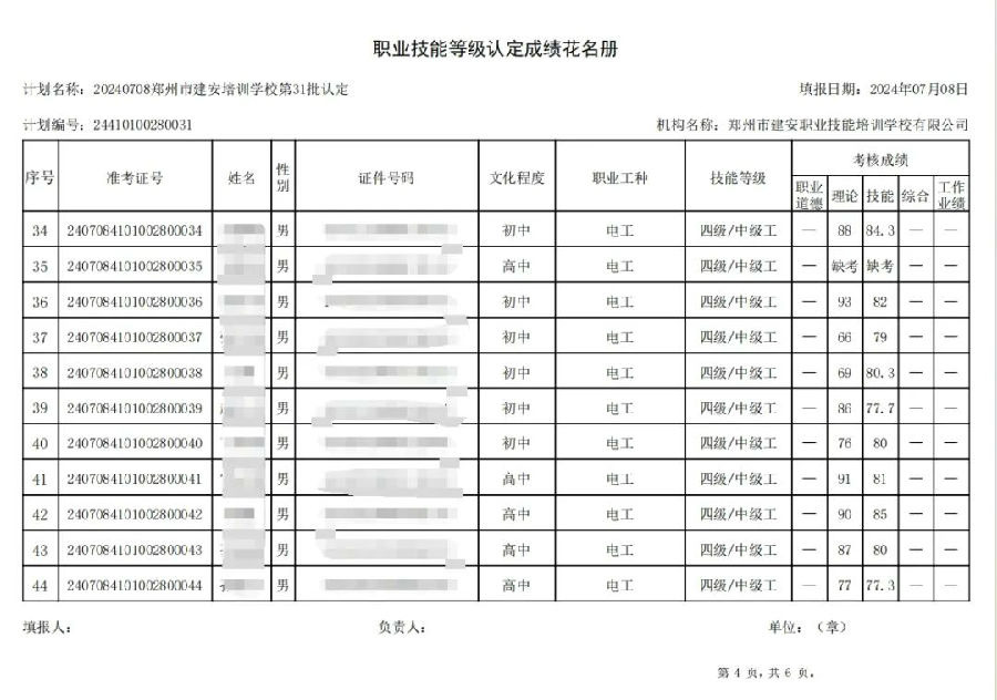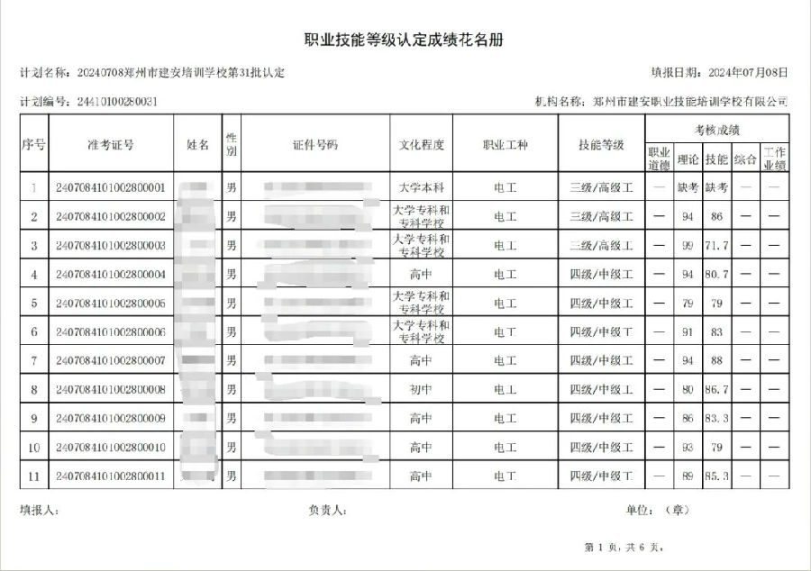 2024年7月8日,在郑州市建安职业技能培训学校进行的第31批次【电工】【叉车司机】职业技能等级认定考试,阅卷工作已结束,现将各位考生成绩予以公示,公示期为5天,公示期限为:2024年7月9日至2024年7月13日。