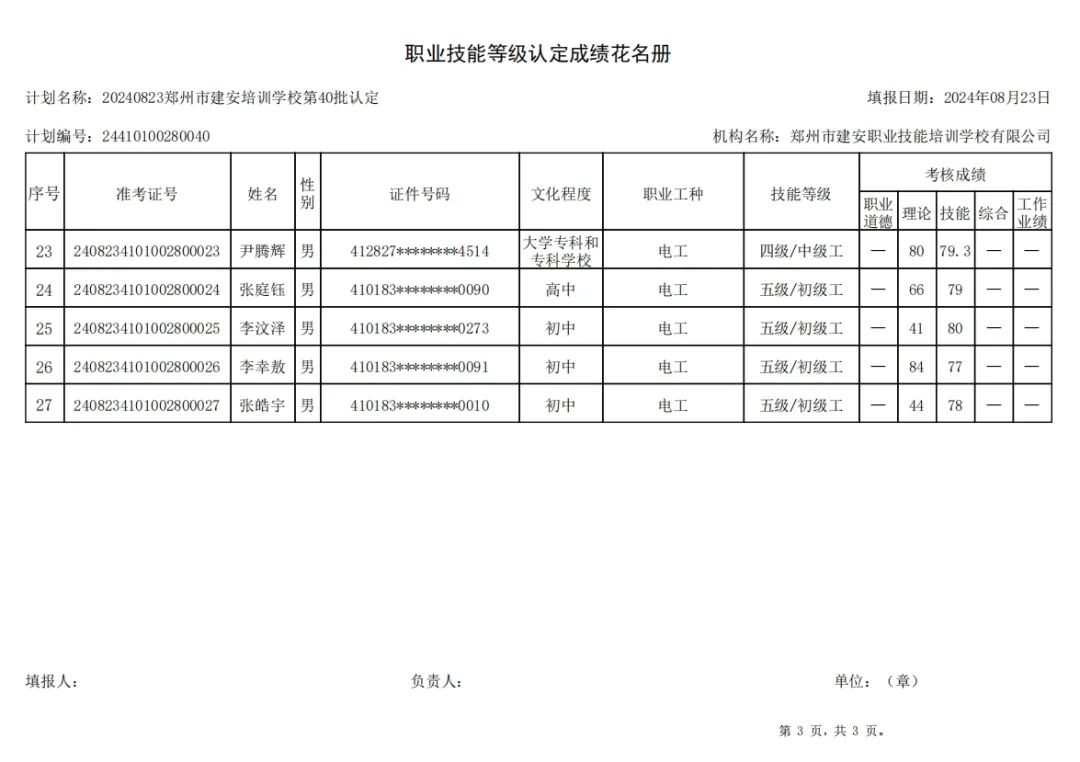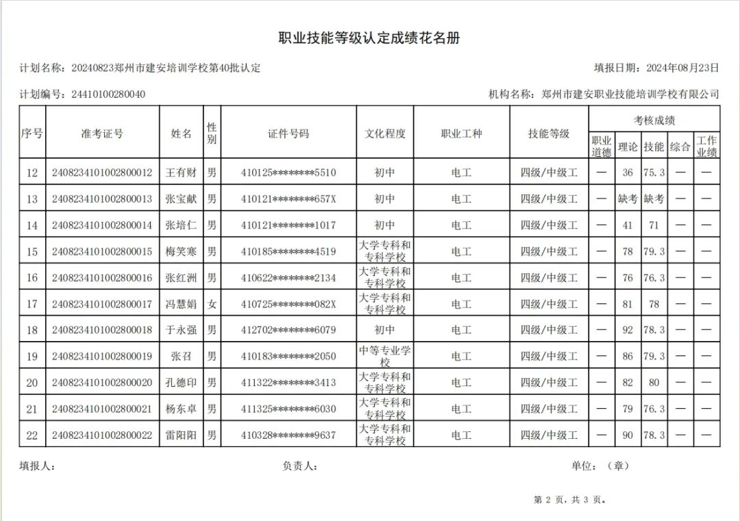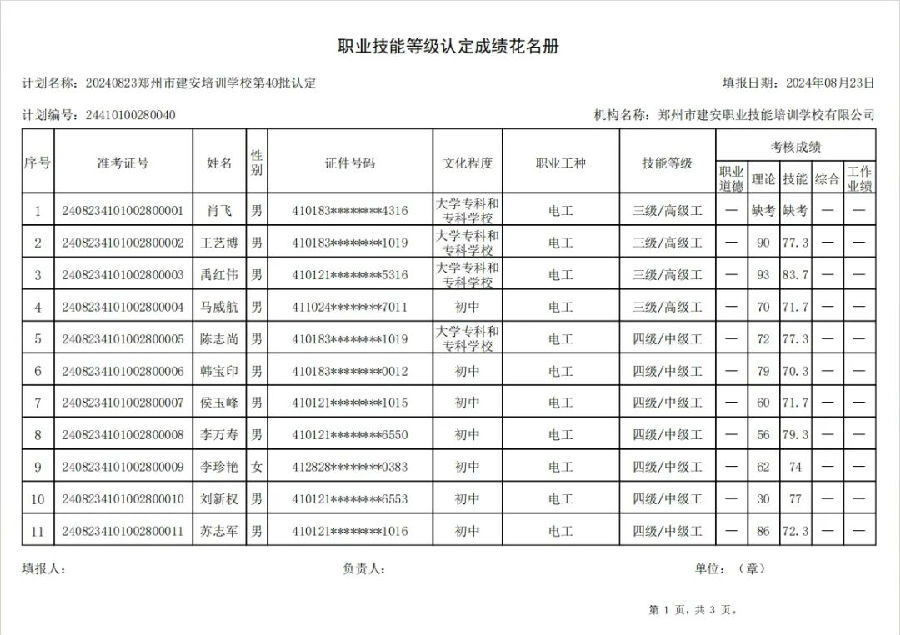 2024年8月23日,在郑州市建安职业技能培训学校进行的第40批次【电工】职业技能等级认定考试,阅卷工作已结束,现将各位考生成绩予以公示,公示期为5天,公示期限为:2024年8月24日至2024年8月28日。若考生对自己的成绩有异议,请于公示期内(上午8:30至12点,下午13:30到18:00)携带本人身份证,到郑州市高新区玉兰街83号建安职业技能培训学校申请成绩复核。以上,逾期不再受理。
