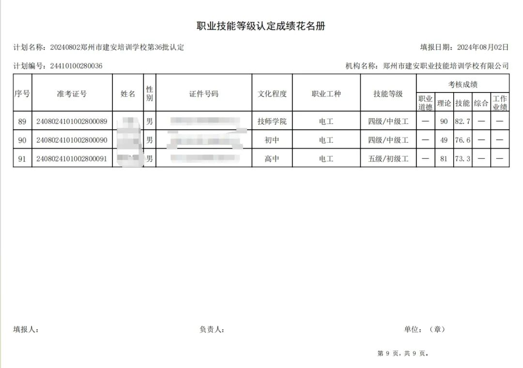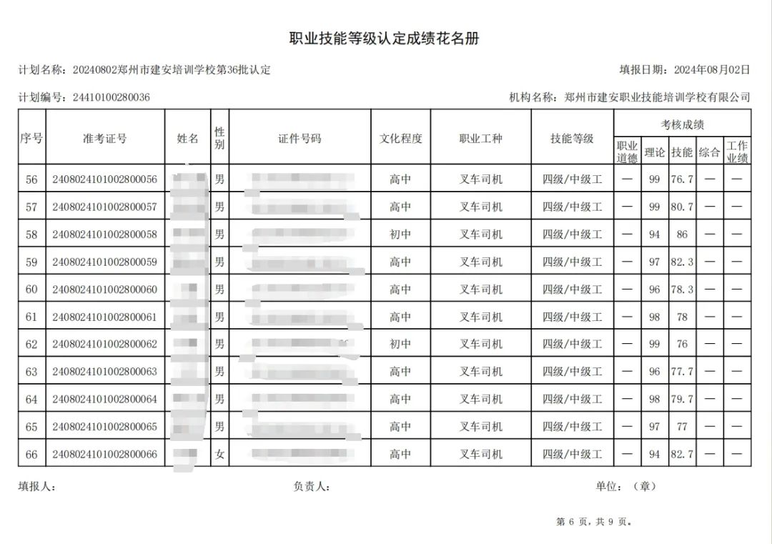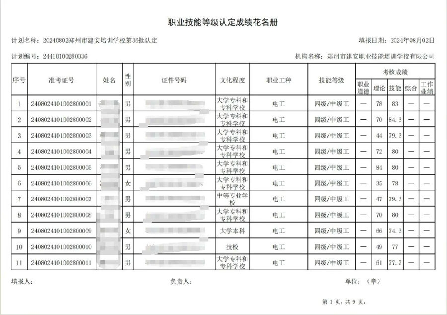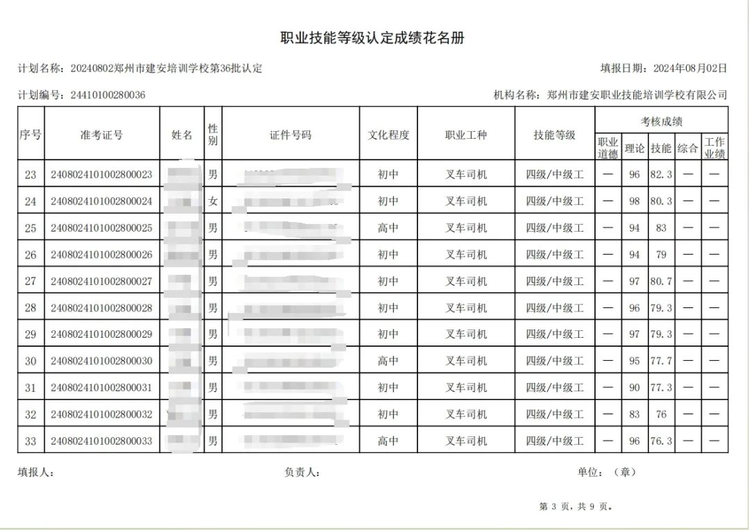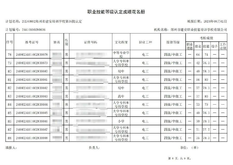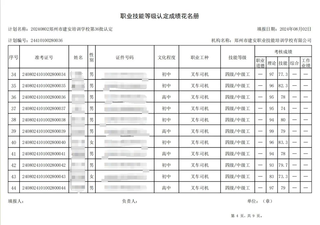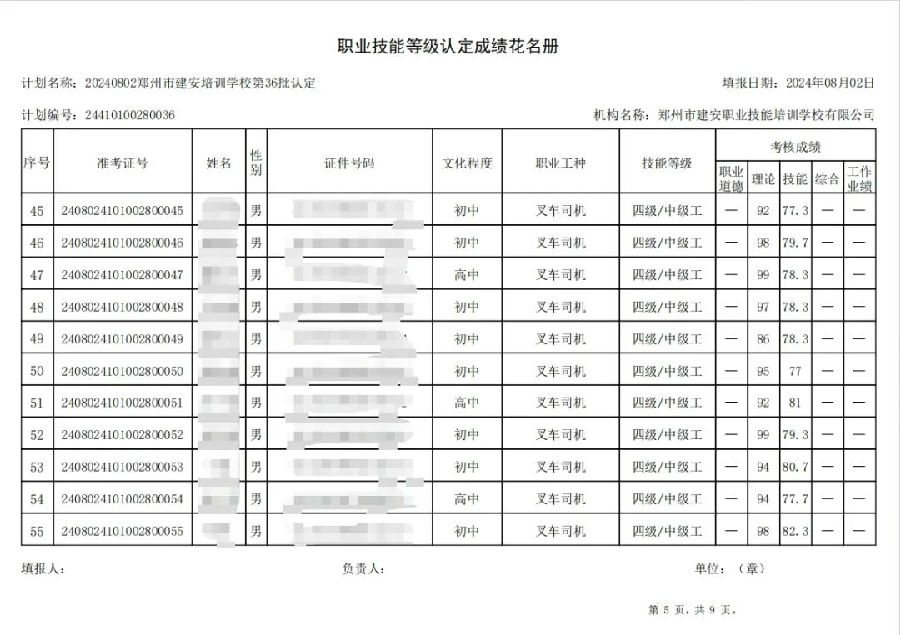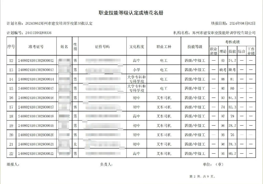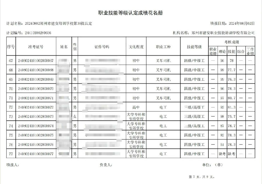 2024年8月2日,在郑州市建安职业技能培训学校进行的第36批次【叉车司机】【电工】职业技能等级认定考试,阅卷工作已结束,现将各位考生成绩予以公示,公示期为5天,公示期限为:2024年8月6日至2024年8月10日。