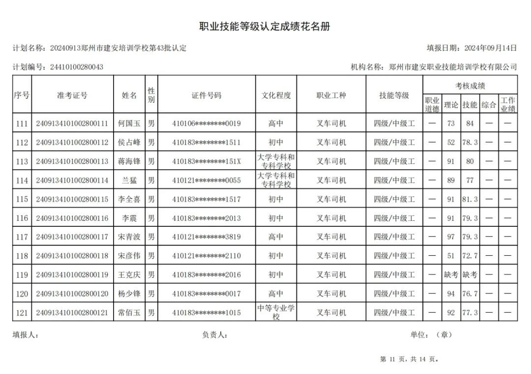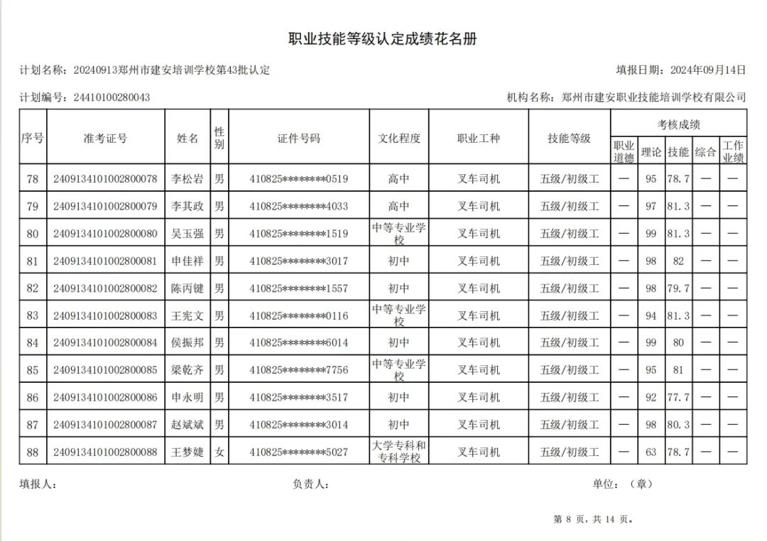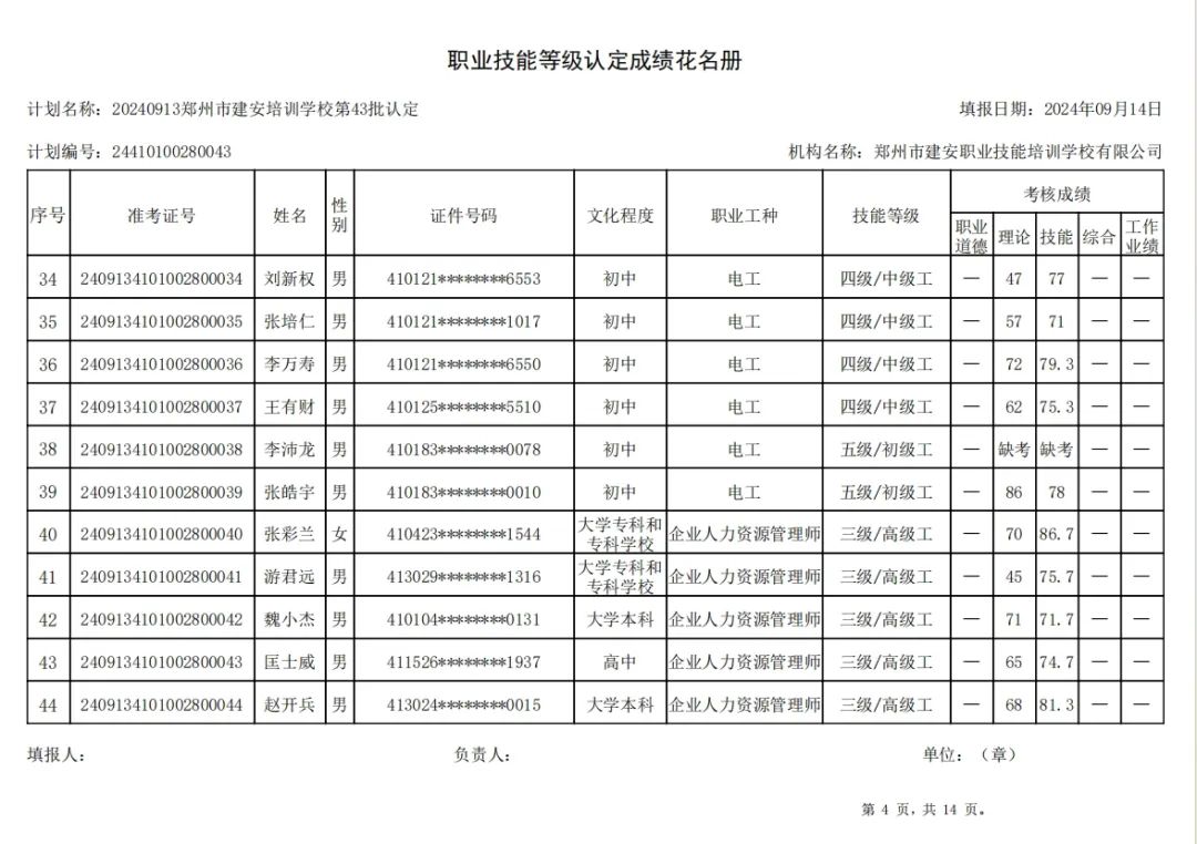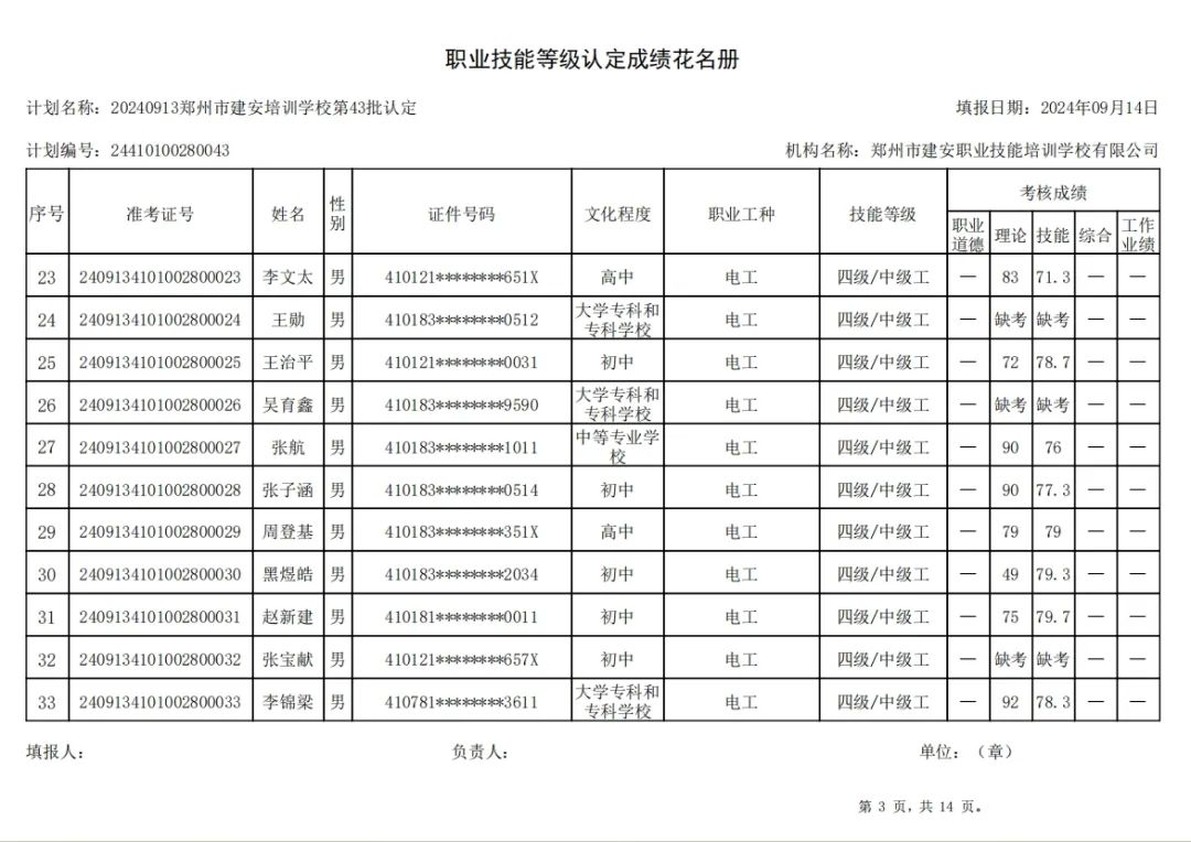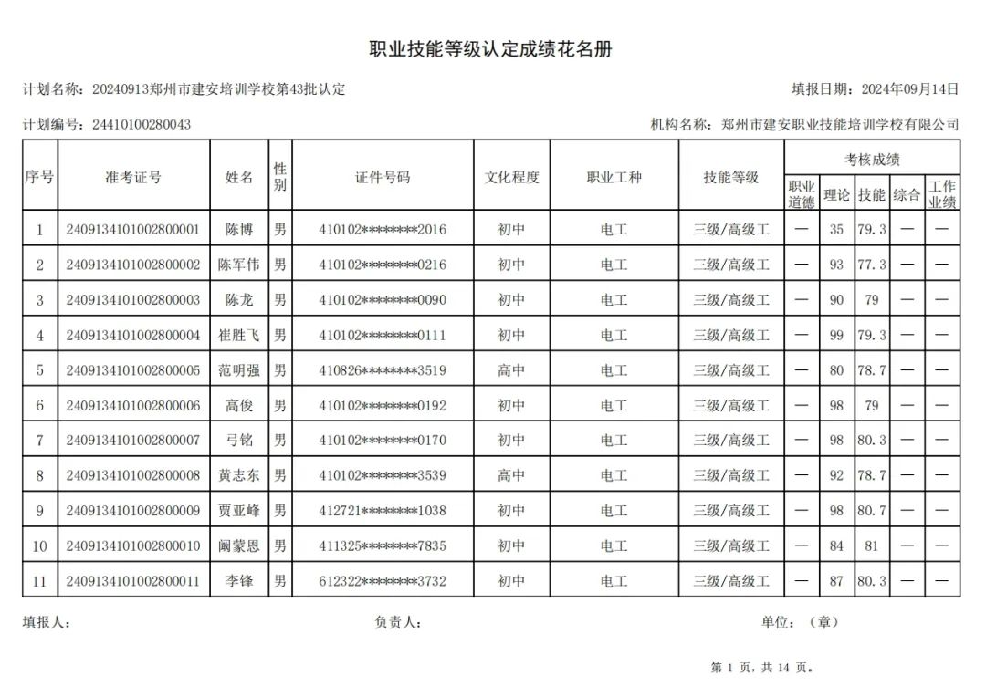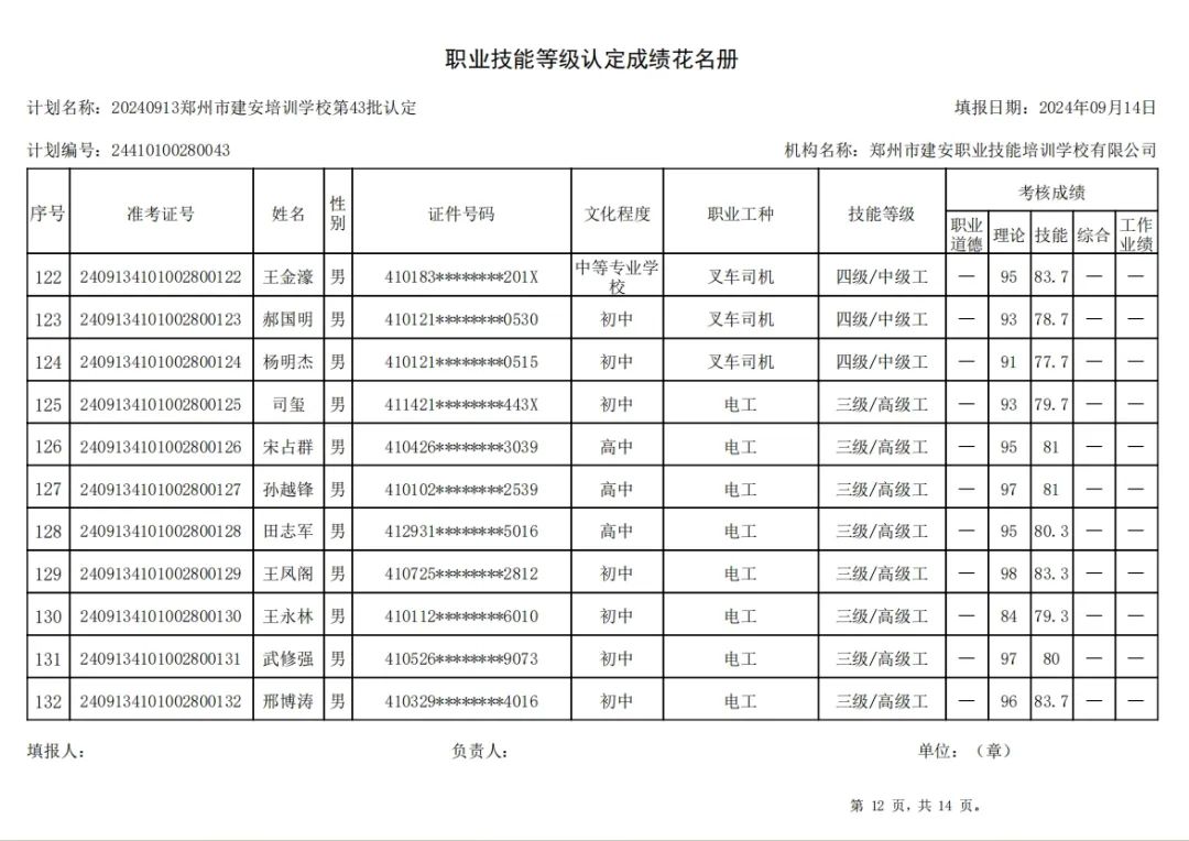 2024年9月13日,在郑州市建安职业技能培训学校进行的第43批次【电工】【叉车司机】【企业人力资源管理师】职业技能等级认定考试,阅卷工作已结束,现将各位考生成绩予以公示,公示期为5天,公示期限为:2024年9月14日至2024年9月18日。