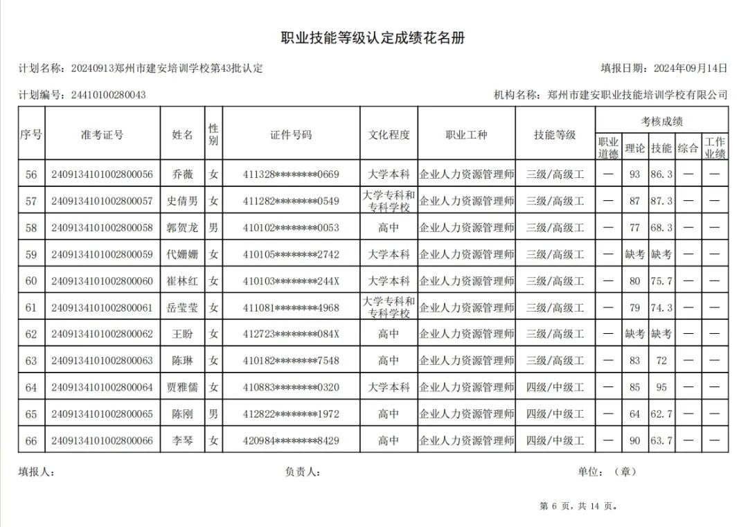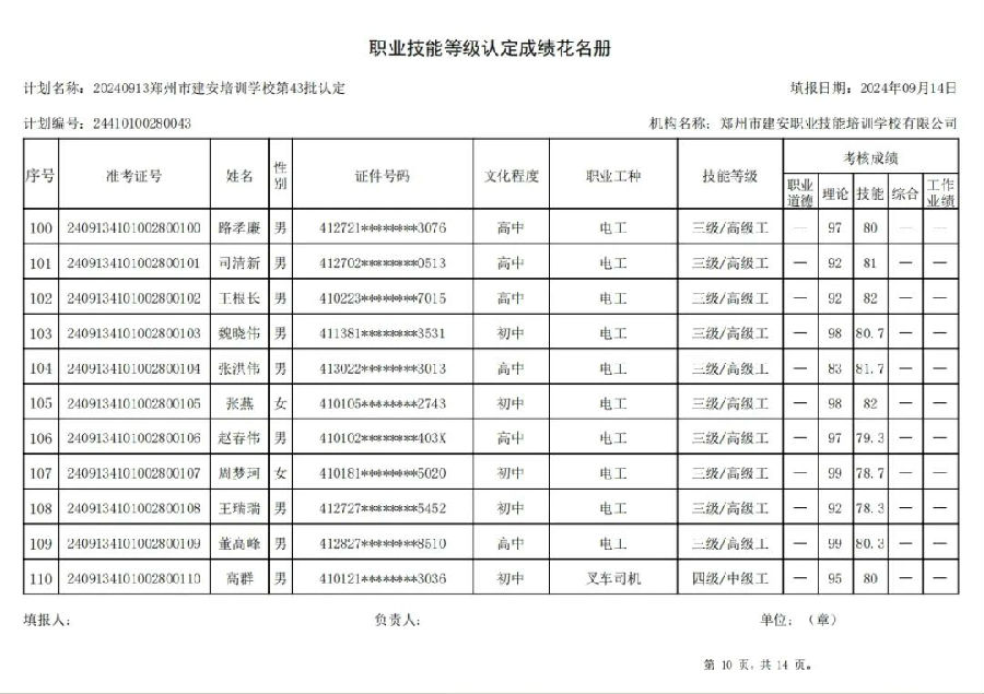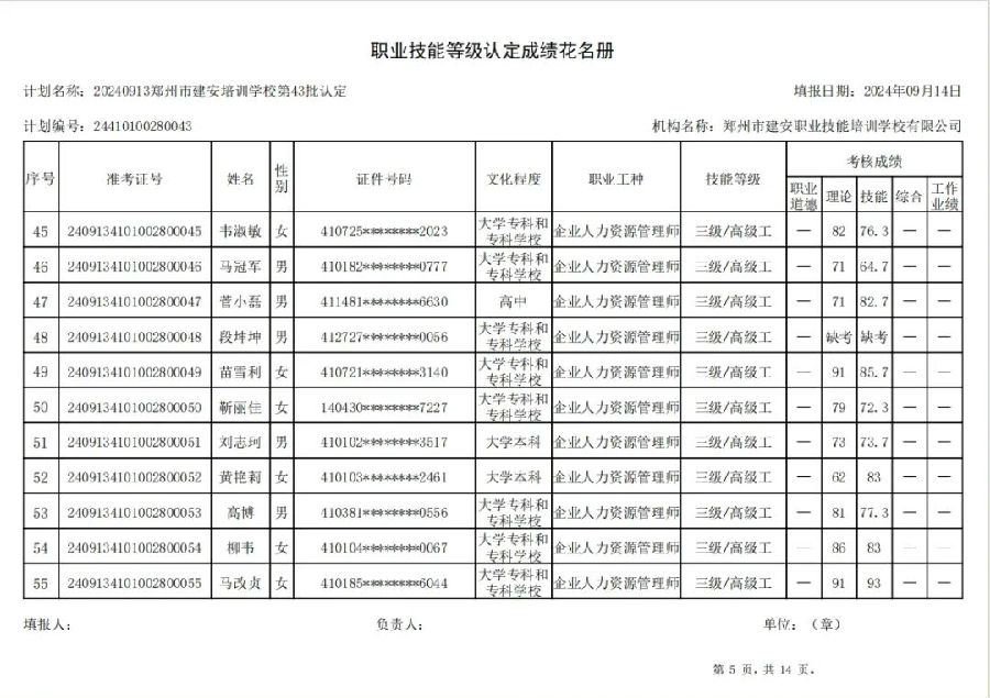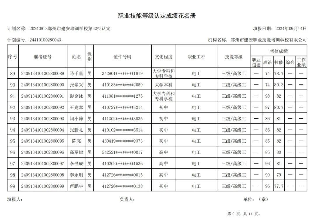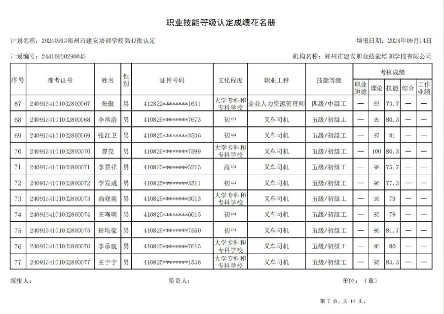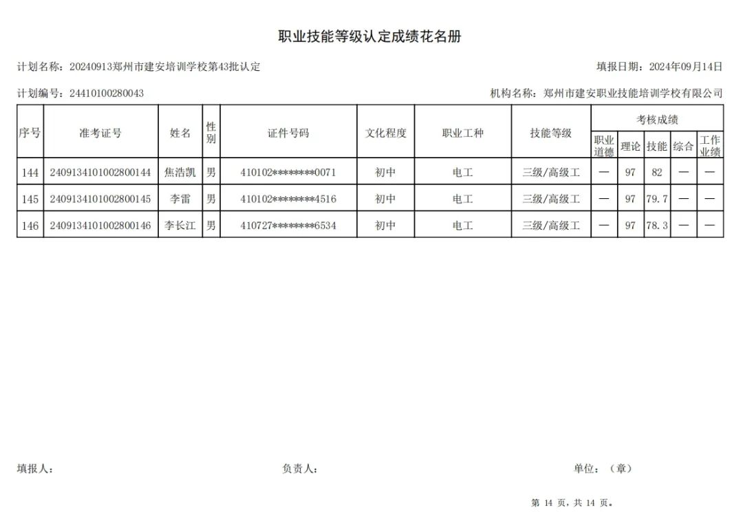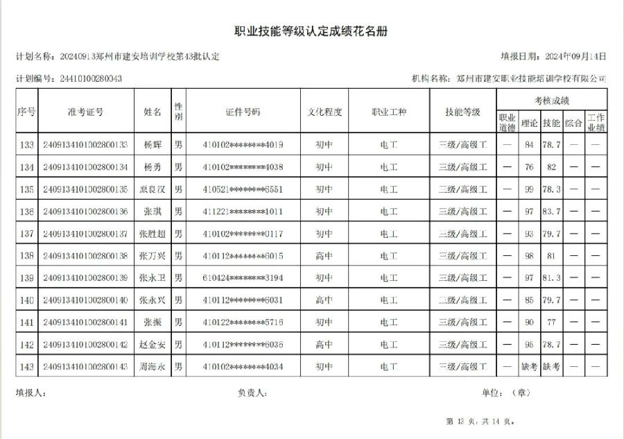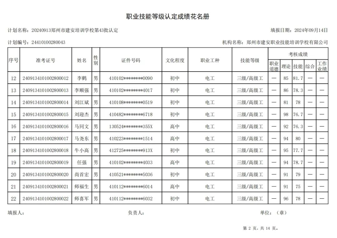 2024年9月13日,在郑州市建安职业技能培训学校进行的第43批次【电工】【叉车司机】【企业人力资源管理师】职业技能等级认定考试,阅卷工作已结束,现将各位考生成绩予以公示,公示期为5天,公示期限为:2024年9月14日至2024年9月18日。