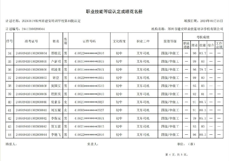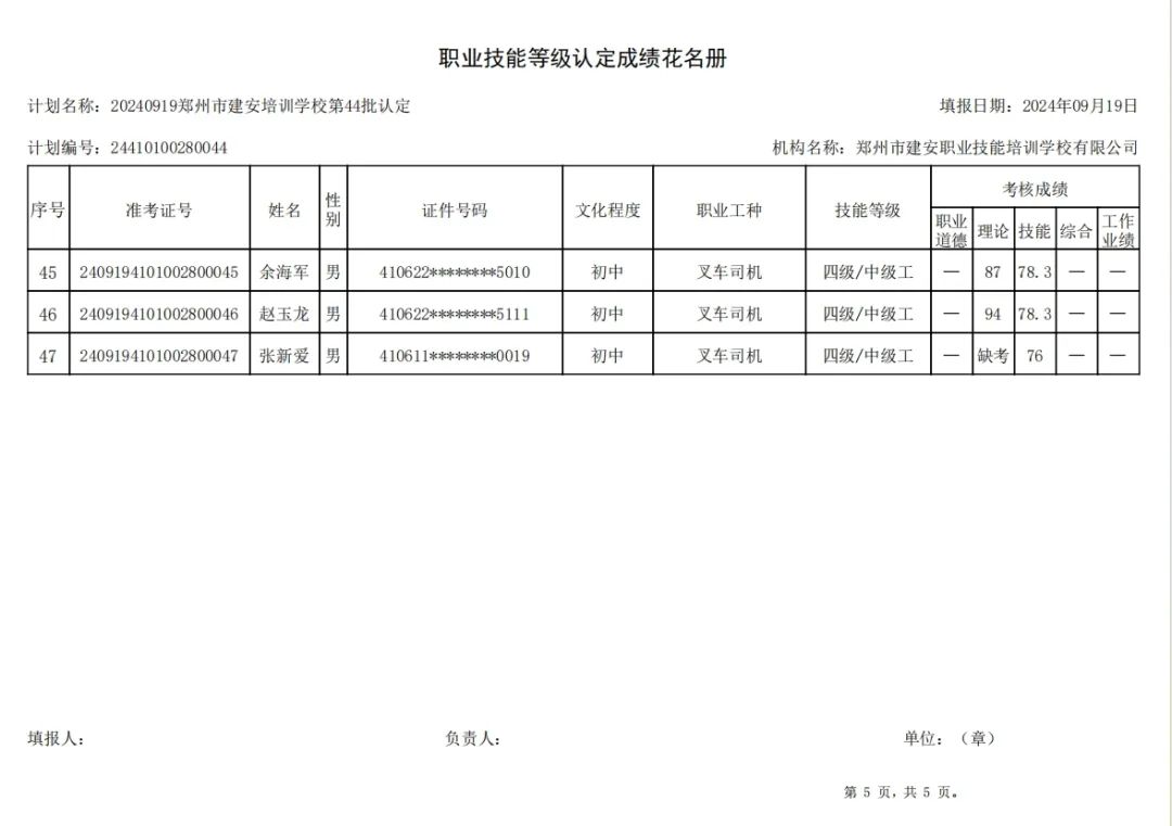 2024年9月19日,在郑州市建安职业技能培训学校进行的第44批次【叉车司机】职业技能等级认定考试,阅卷工作已结束,现将各位考生成绩予以公示,公示期为5天,公示期限为:2024年9月20日至2024年9月24日。