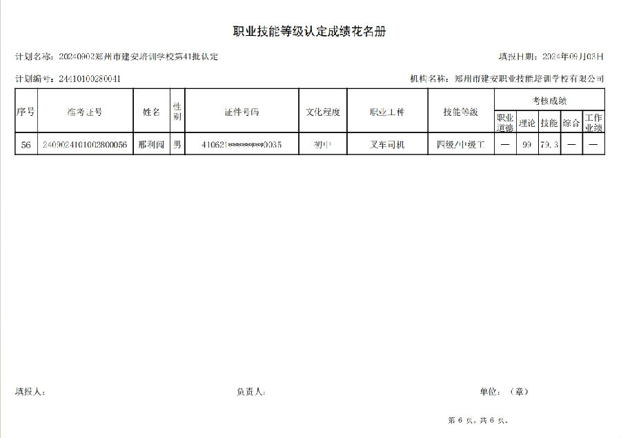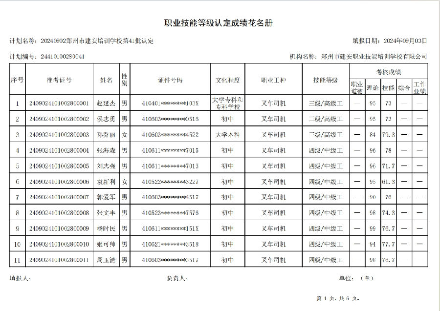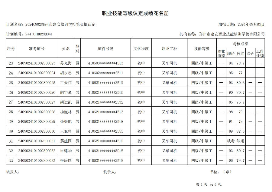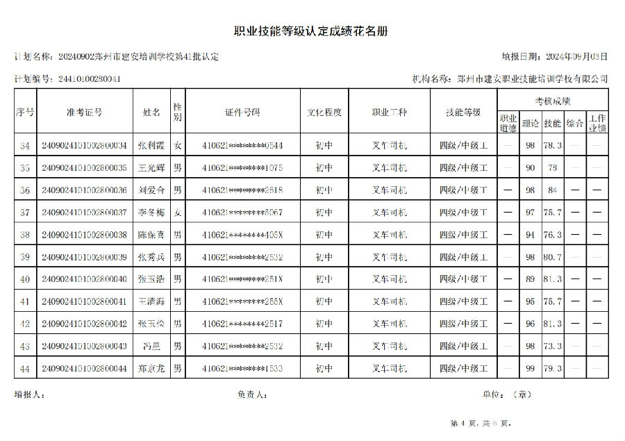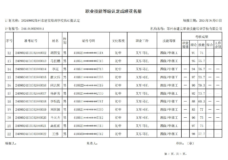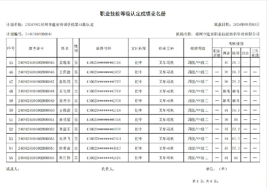 2024年9月2日,在郑州市建安职业技能培训学校进行的第41批次【叉车司机】职业技能等级认定考试,阅卷工作已结束,现将各位考生成绩予以公示,公示期为5天,公示期限为:2024年9月3日至2024年9月7日。