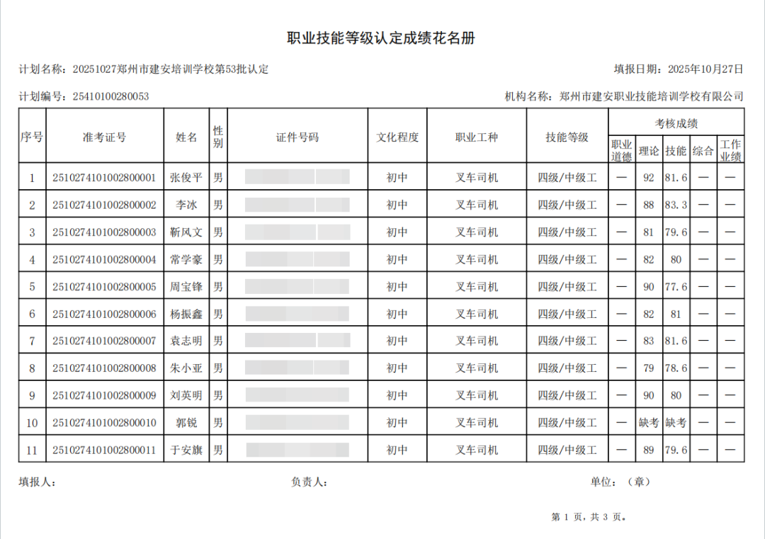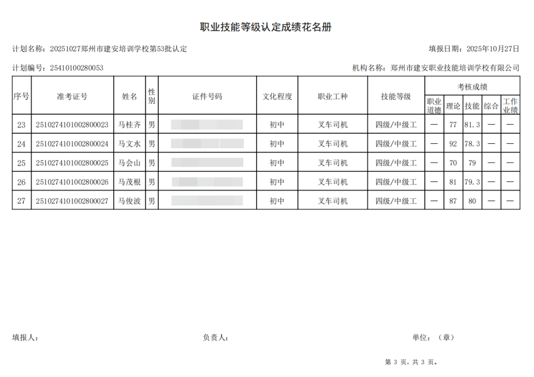 2025年10月27日,在郑州市建安职业技能培训学校进行的第53批【叉车司机】职业技能等级认定考试,阅卷工作已结束,现将各位考生成绩予以公示,公示期为5天,公示期限为:2025年10月28日至2025年11月1日。