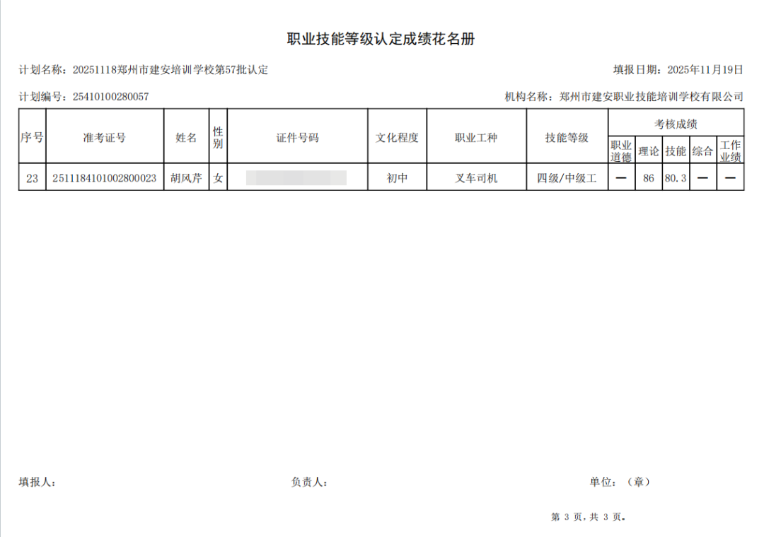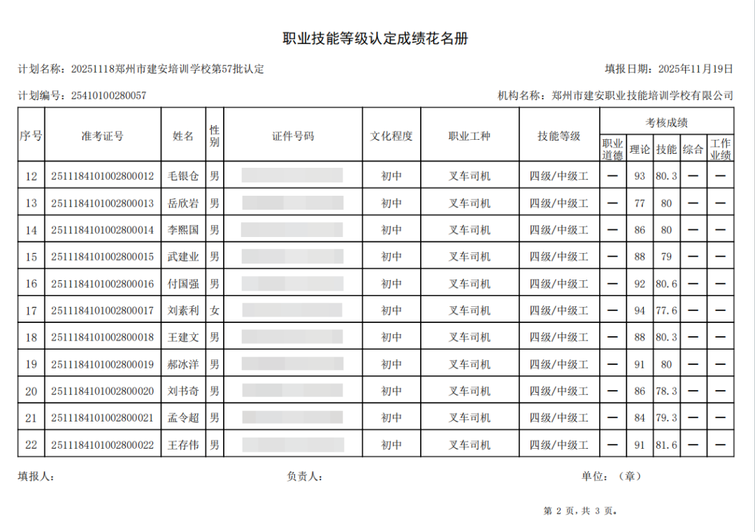 2025年11月18日,在郑州市建安职业技能培训学校进行的第57批【叉车司机】职业技能等级认定考试,阅卷工作已结束,现将各位考生成绩予以公示,公示期为5天,公示期限为:2025年11月25日至2025年11月29日。