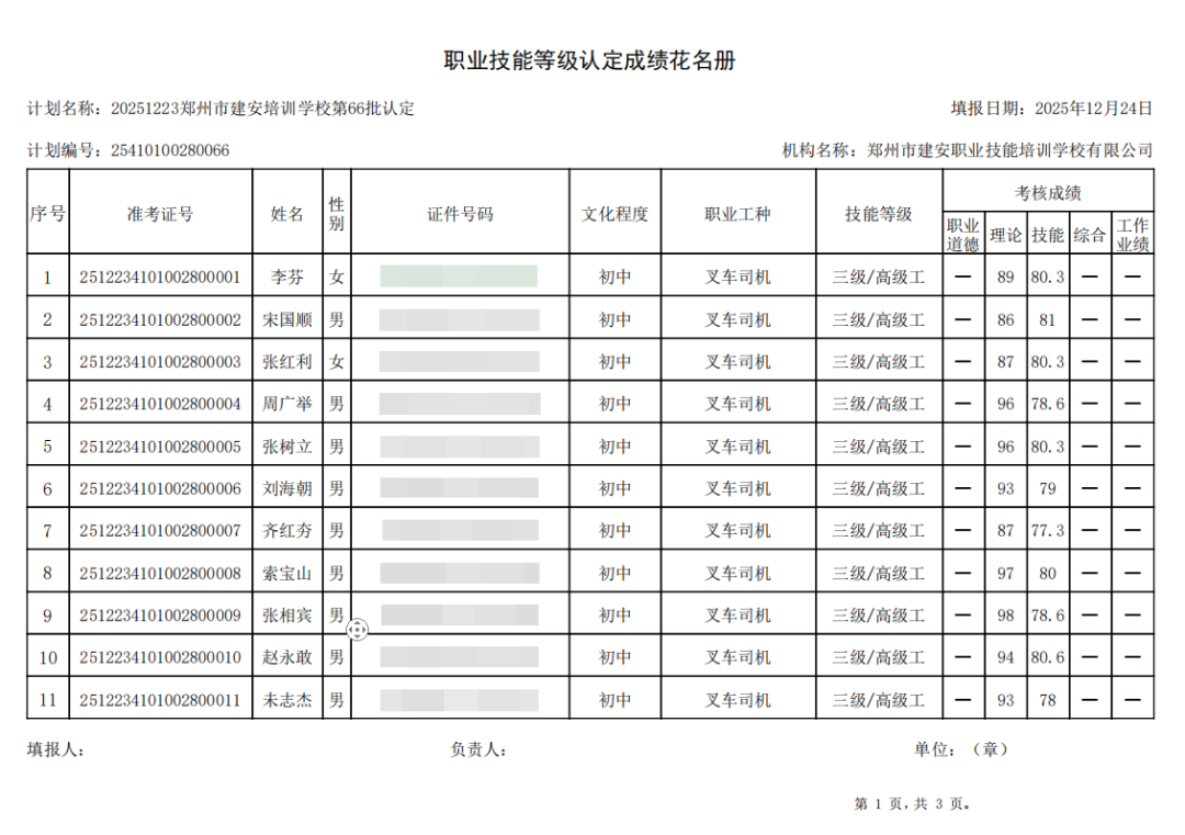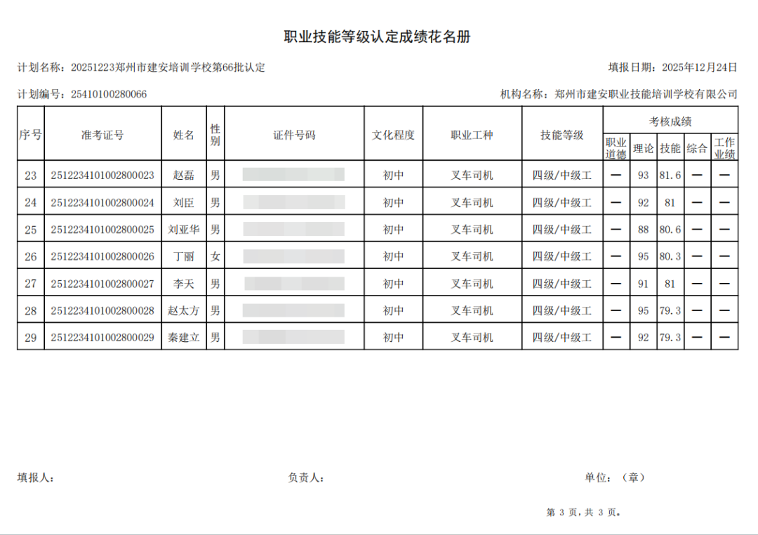 2025年12月23日,在郑州市建安职业技能培训学校进行的第66批【叉车司机】职业技能等级认定考试,阅卷工作已结束,现将各位考生成绩予以公示,公示期为5天,公示期限为:2025年12月24日至2025年12月28日。