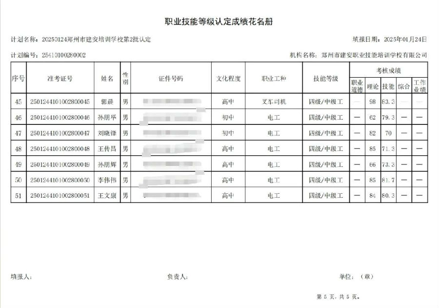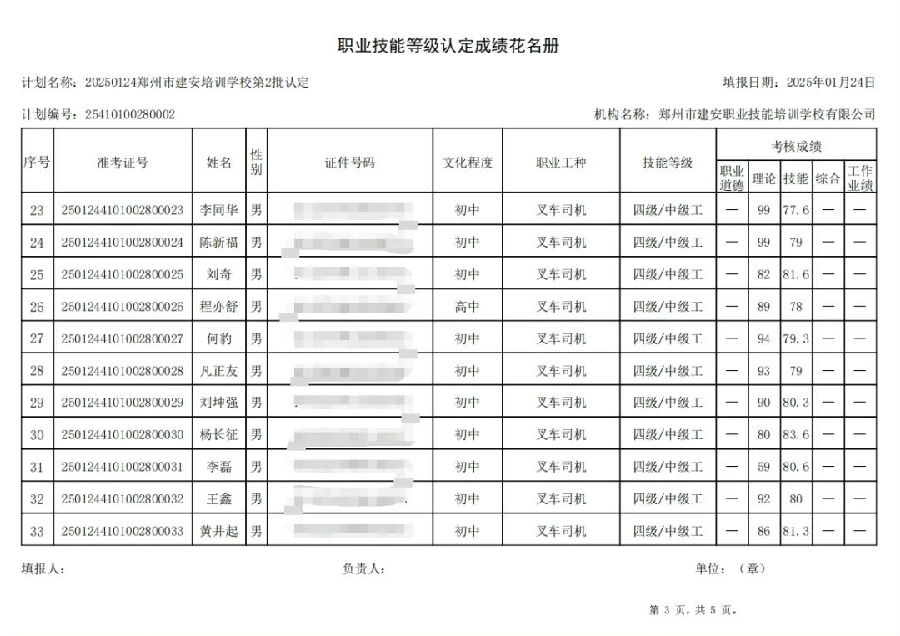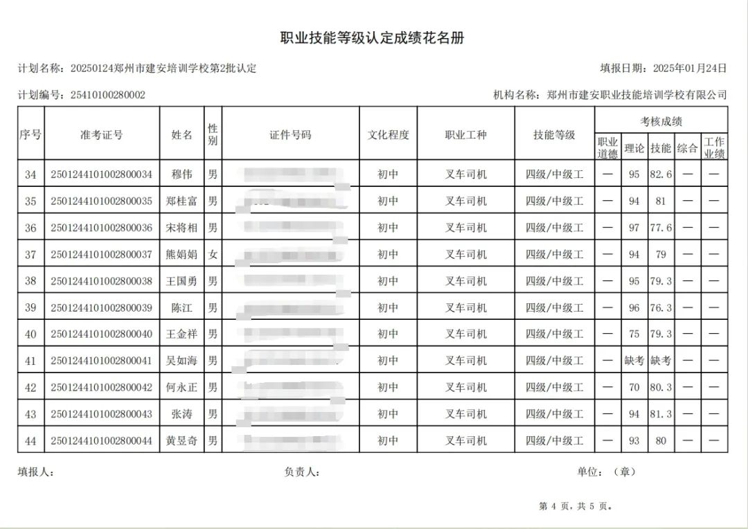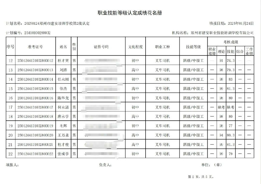 2025年1月24日,在郑州市建安职业技能培训学校进行的第2批次【叉车司机】【电工】职业技能等级认定考试,阅卷工作已结束,现将各位考生成绩予以公示,公示期为5天,公示期限为:2025年1月24日至2025年1月28日。