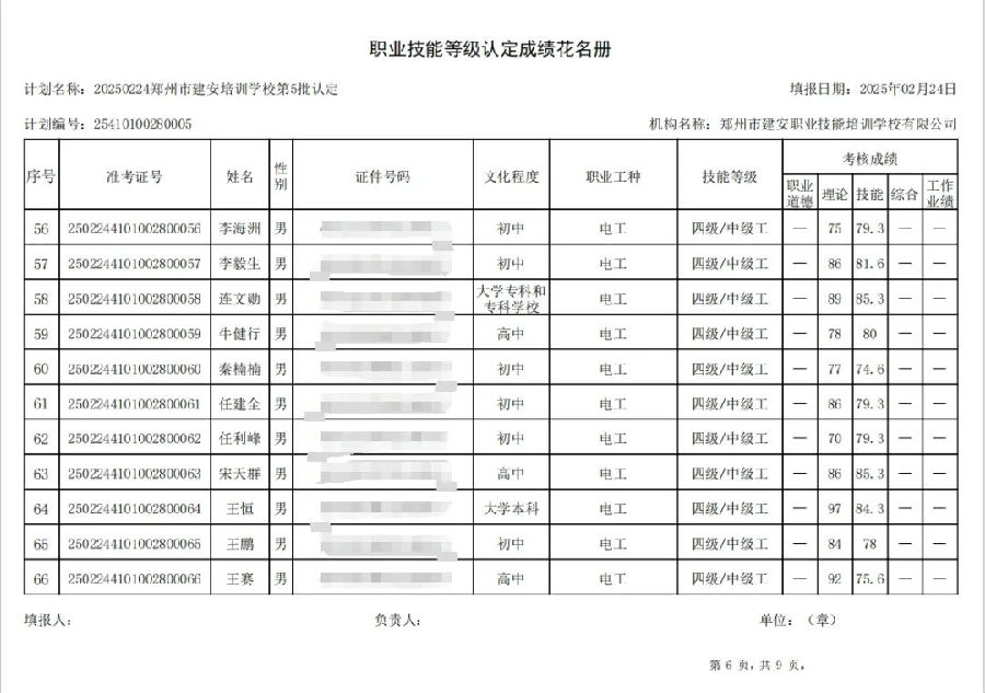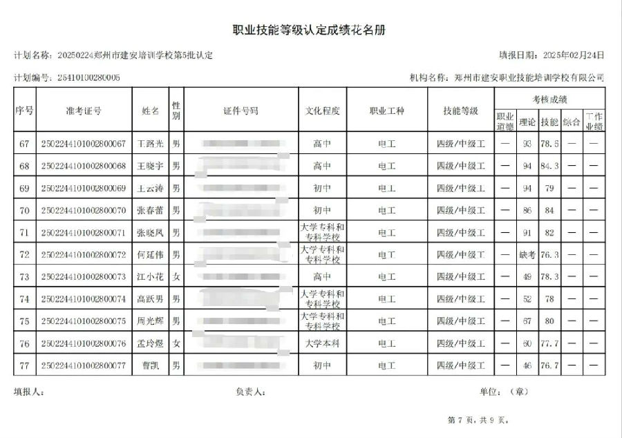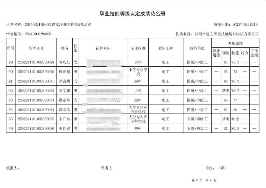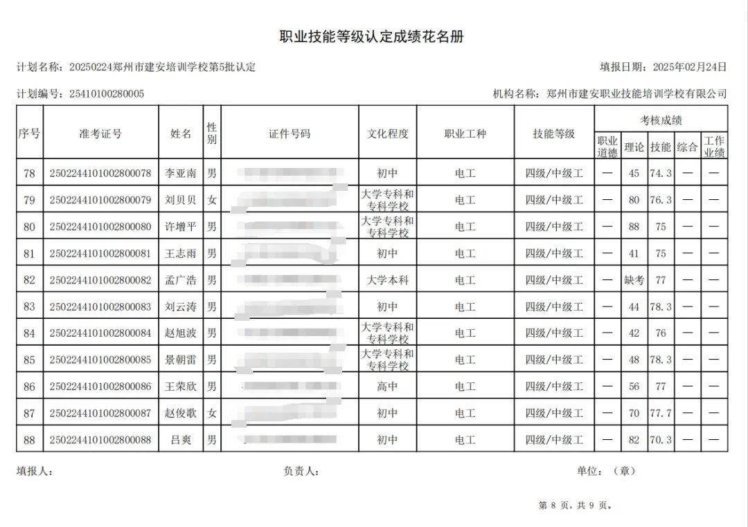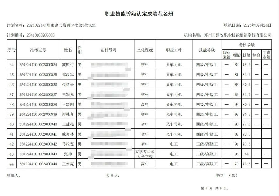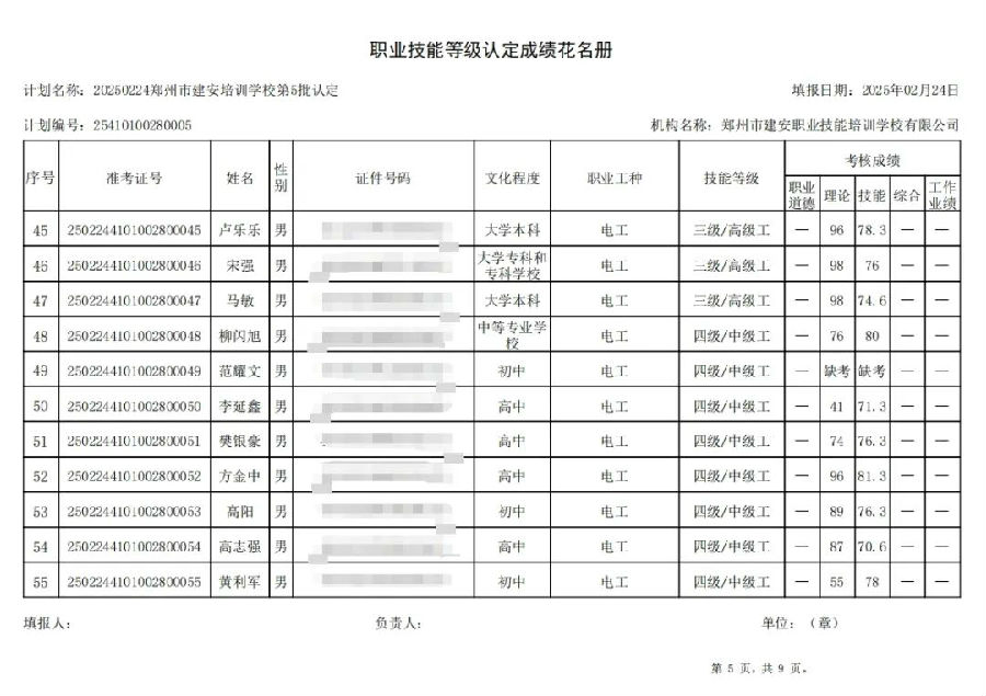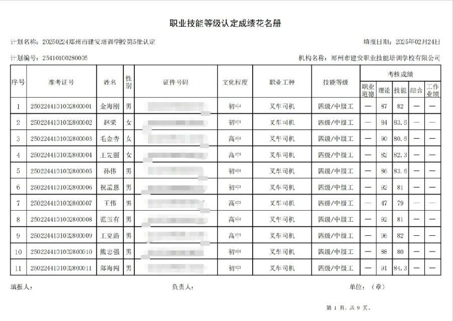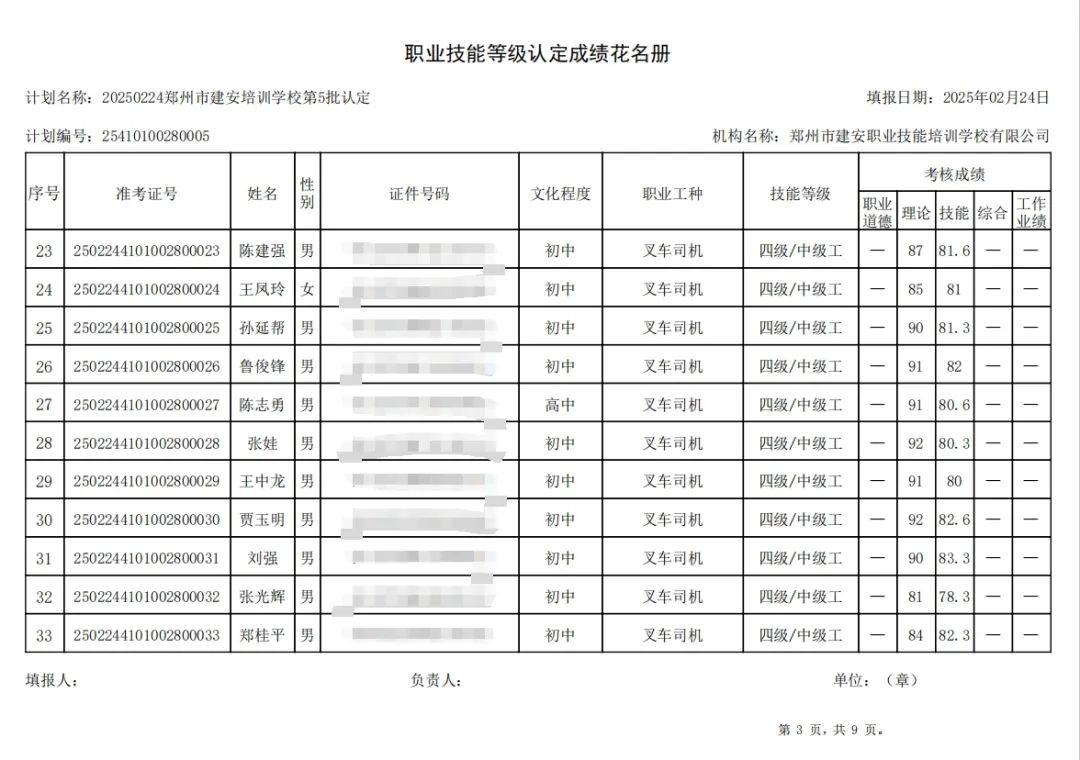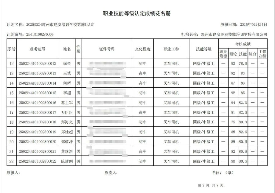 2025年2月24日,在郑州市建安职业技能培训学校进行的第5批次【叉车司机】【电工】职业技能等级认定考试,阅卷工作已结束,现将各位考生成绩予以公示,公示期为5天,公示期限为:2025年2月25日至2025年3月1日。