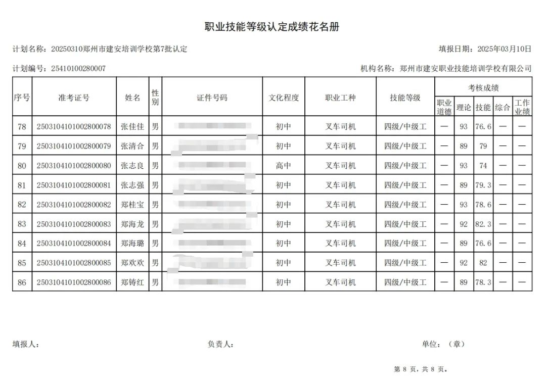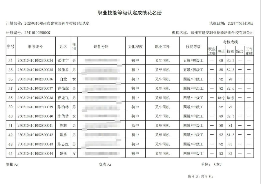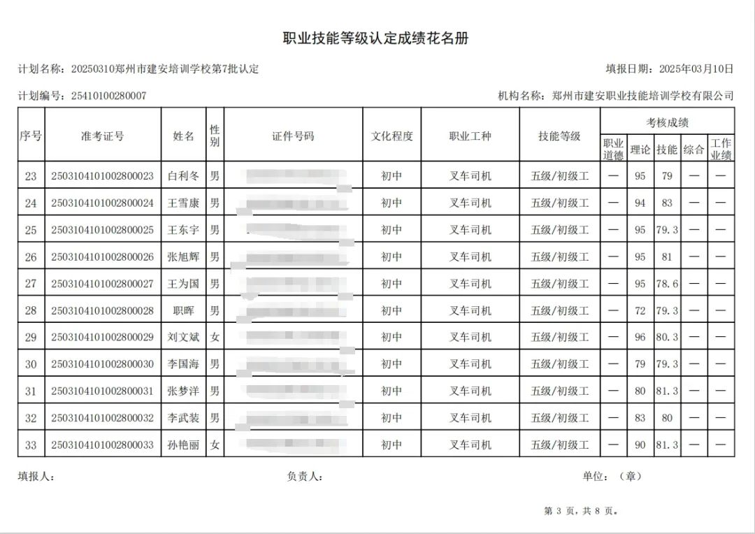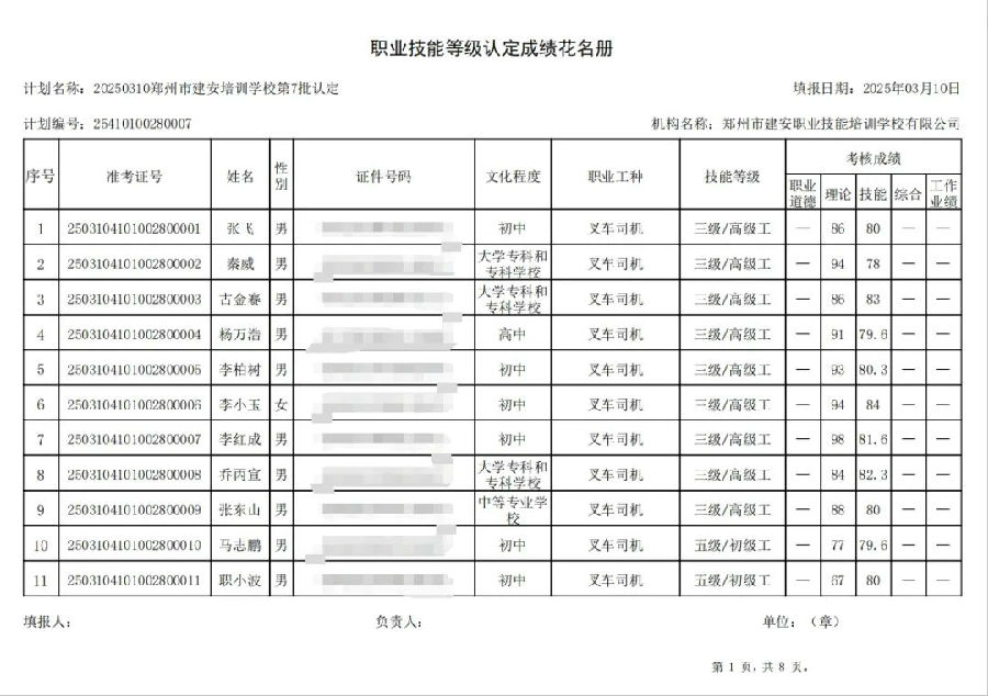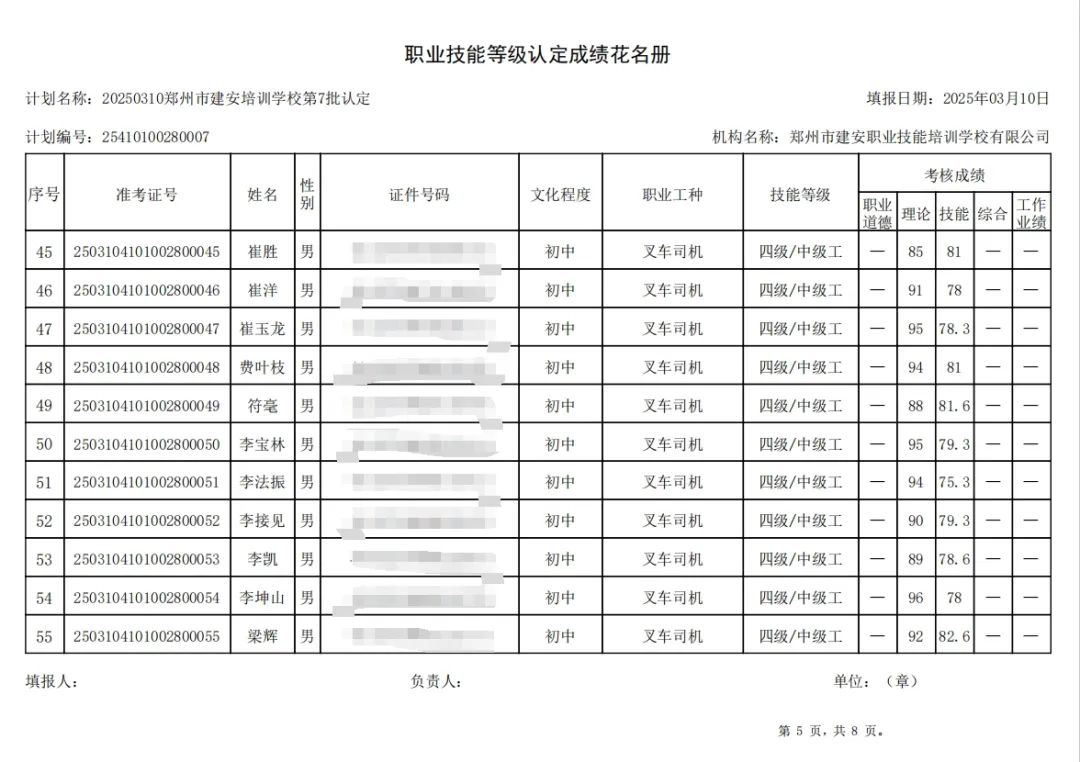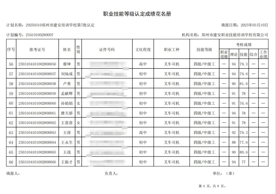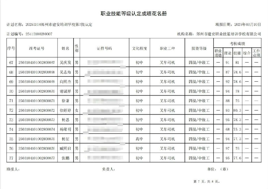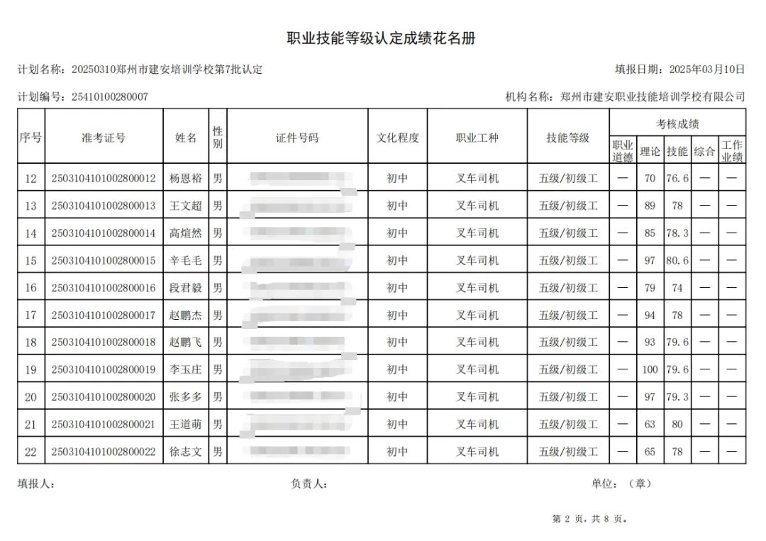 2025年3月10日,在郑州市建安职业技能培训学校进行的第7批次【叉车司机】职业技能等级认定考试,阅卷工作已结束,现将各位考生成绩予以公示,公示期为5天,公示期限为:2025年3月11日至2025年3月15日。