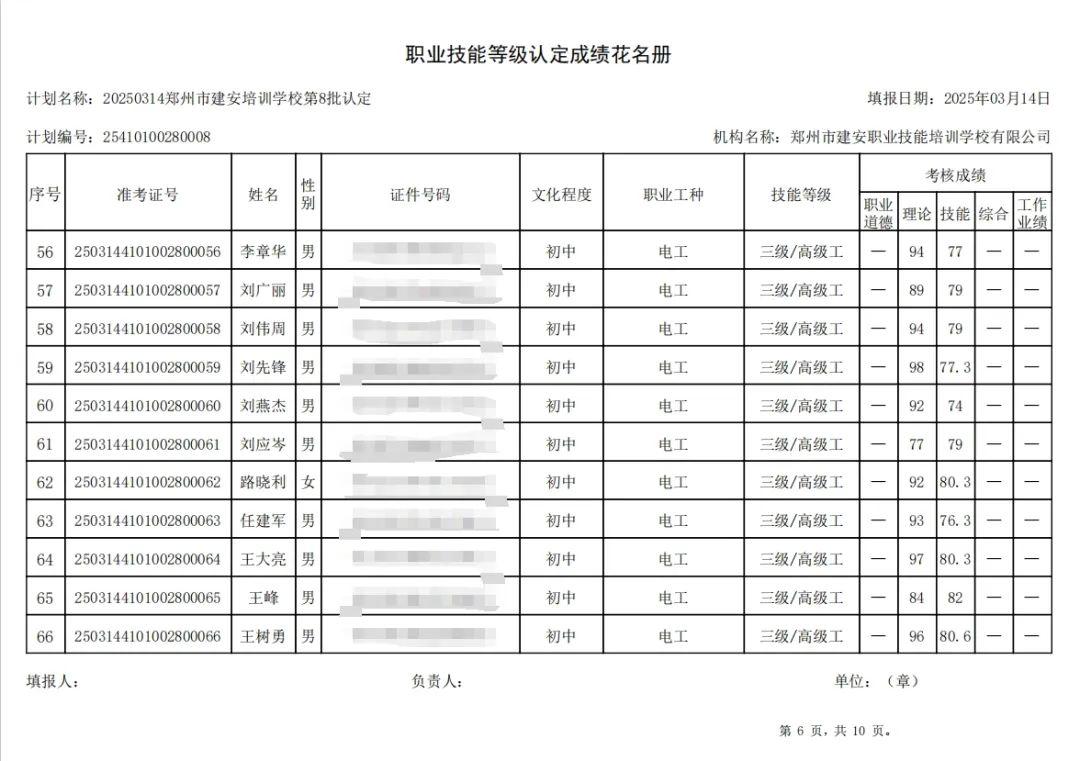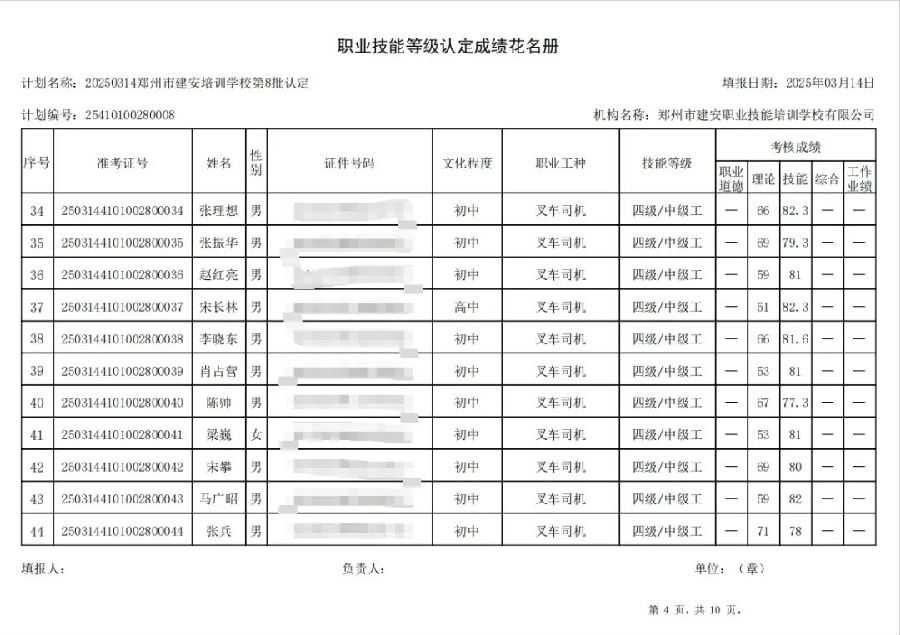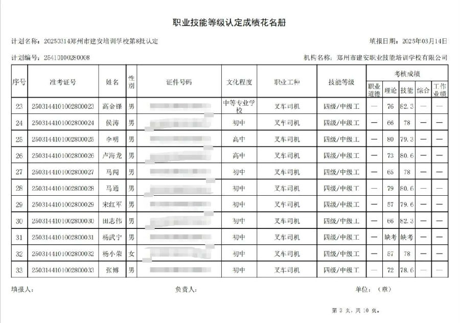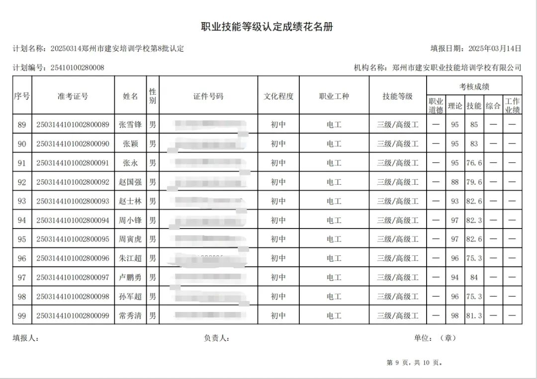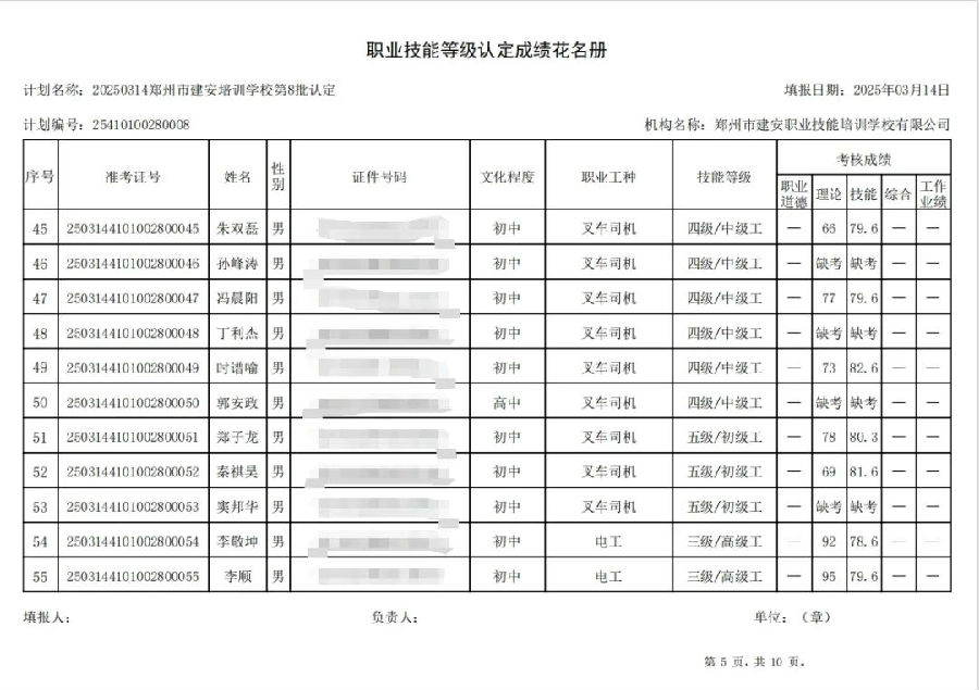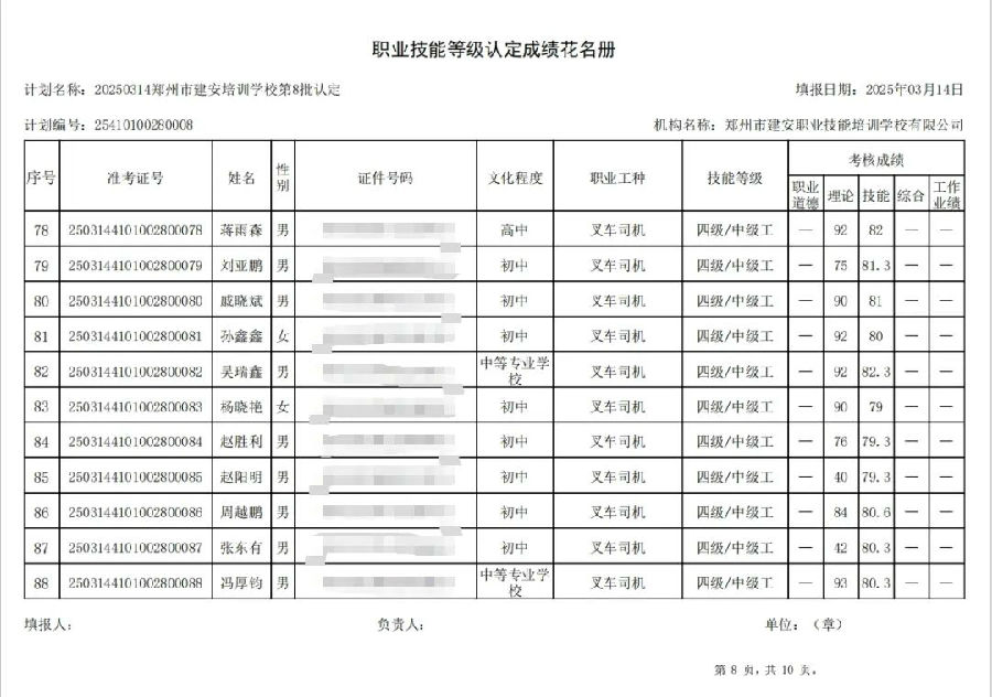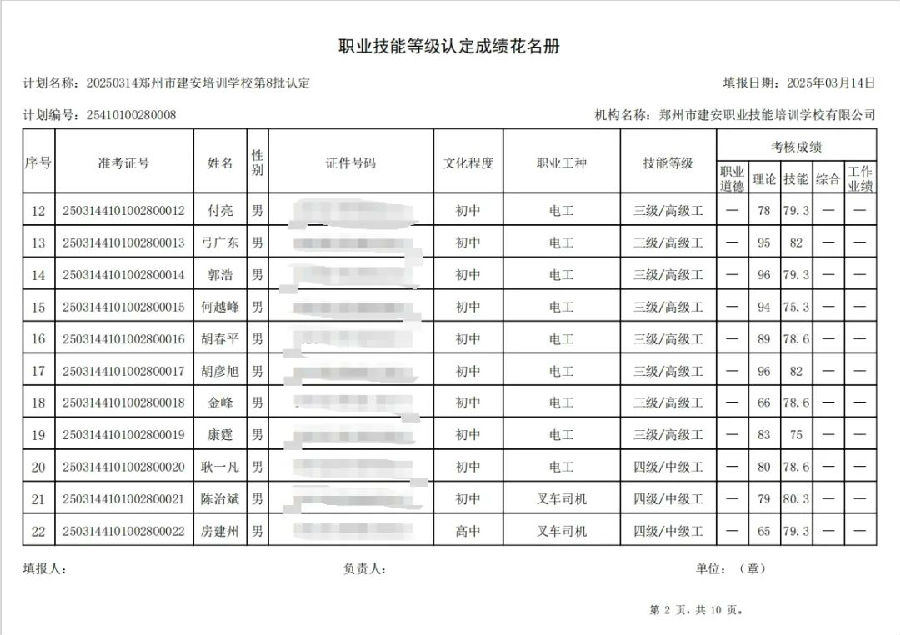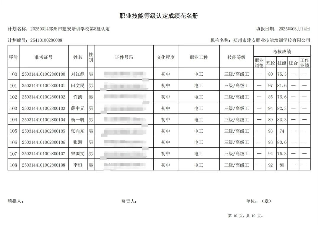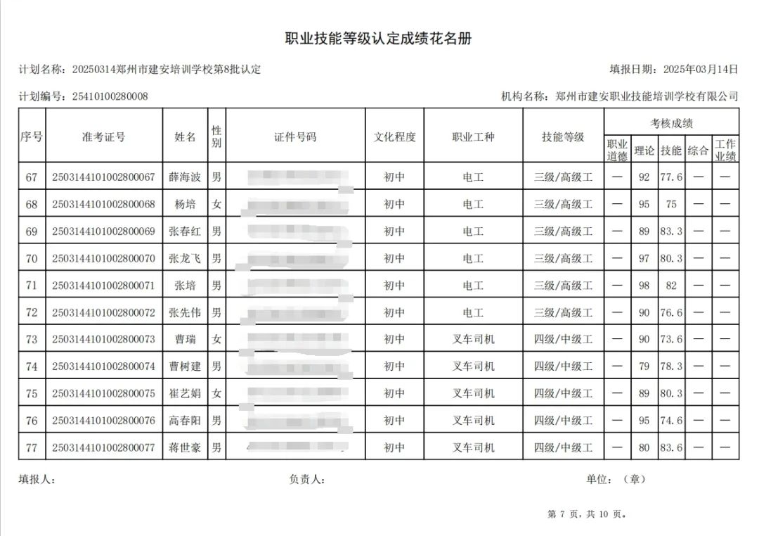 2025年3月14日,在郑州市建安职业技能培训学校进行的第8批次【叉车司机】【电工】职业技能等级认定考试,阅卷工作已结束,现将各位考生成绩予以公示,公示期为5天,公示期限为:2025年3月19日至2025年3月23日。