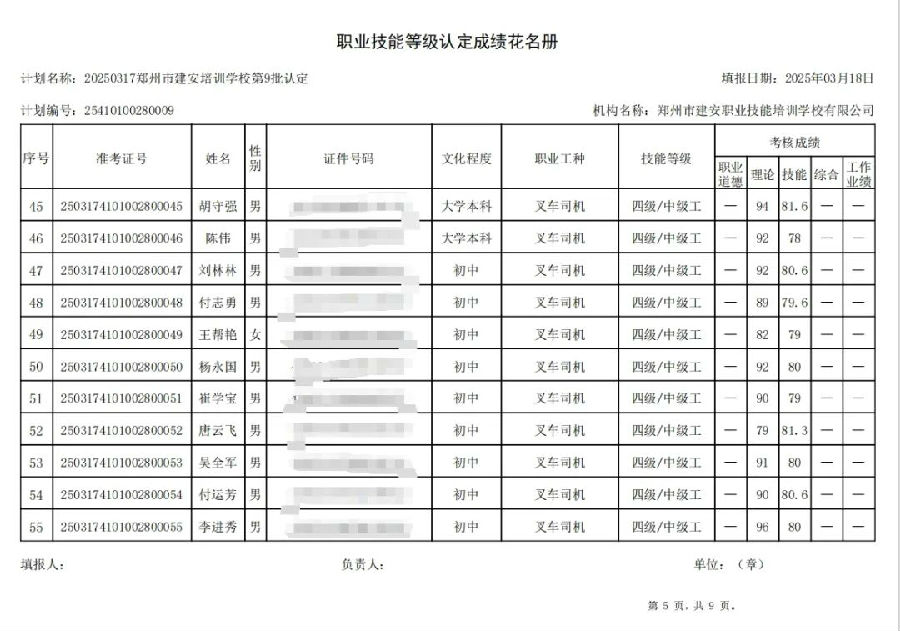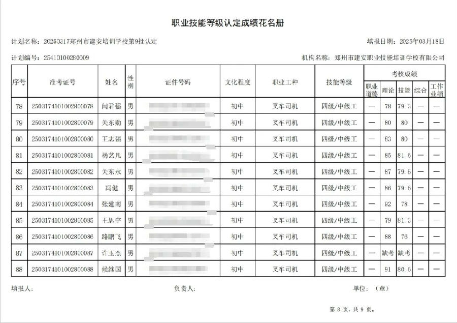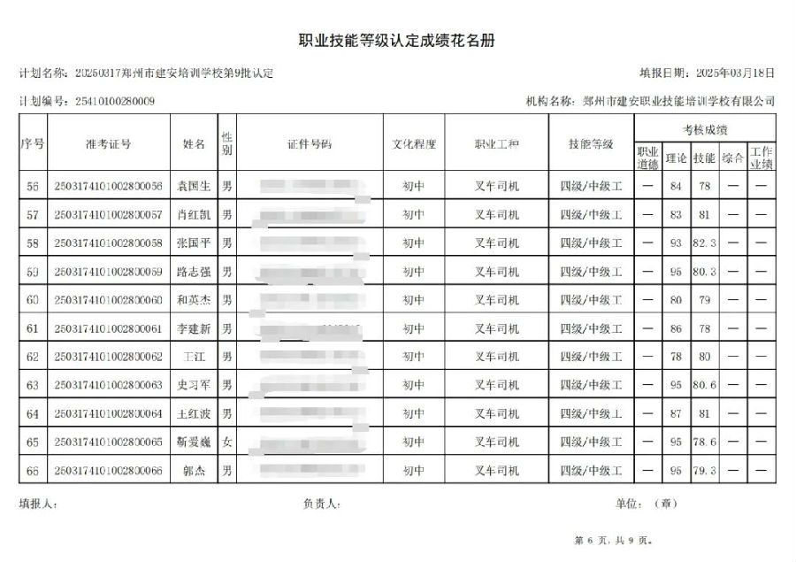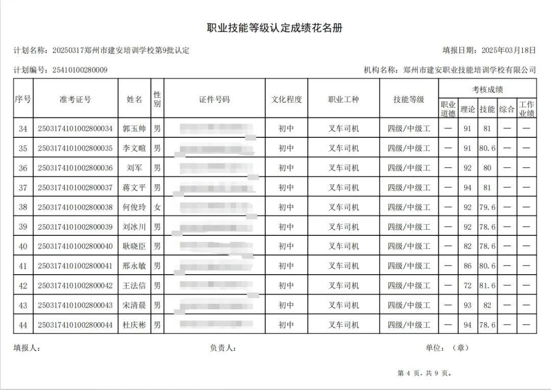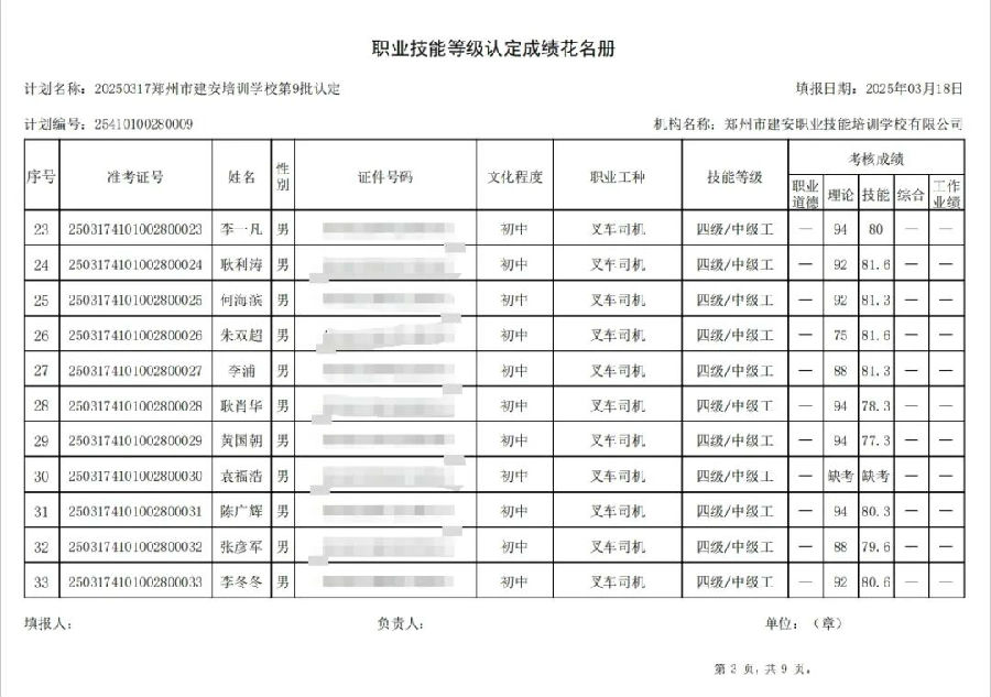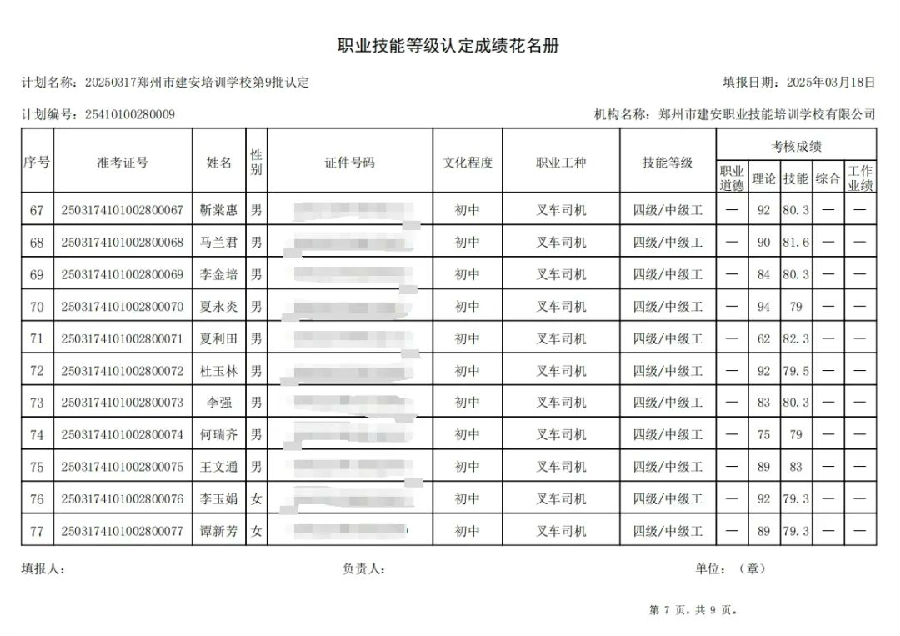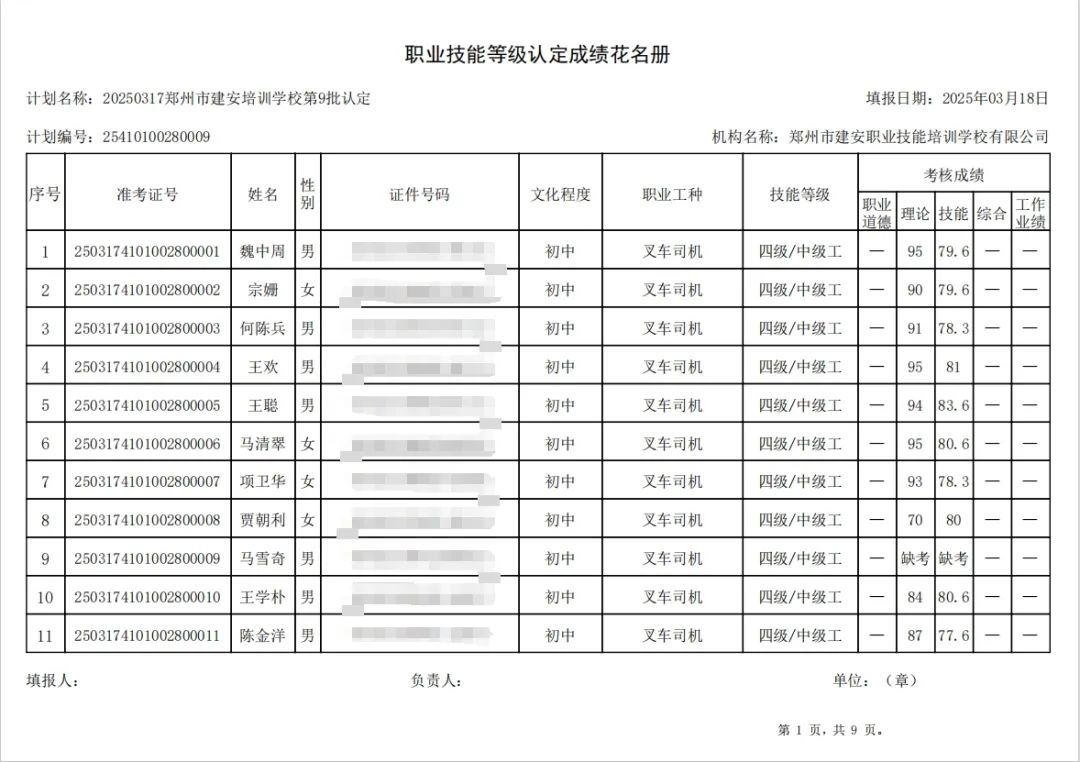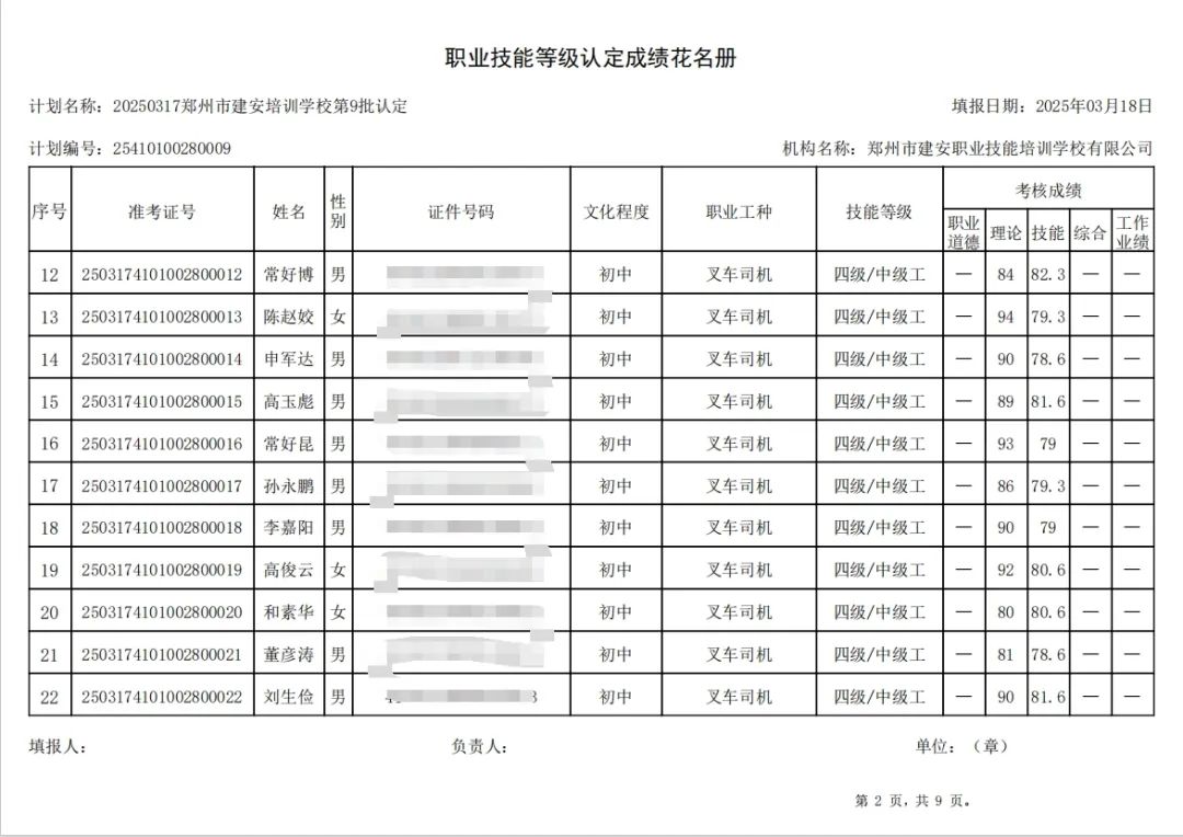 2025年3月17日,在郑州市建安职业技能培训学校进行的第9批次【叉车司机】职业技能等级认定考试,阅卷工作已结束,现将各位考生成绩予以公示,公示期为5天,公示期限为:2025年3月19日至2025年3月23日。