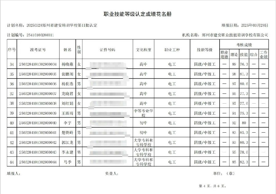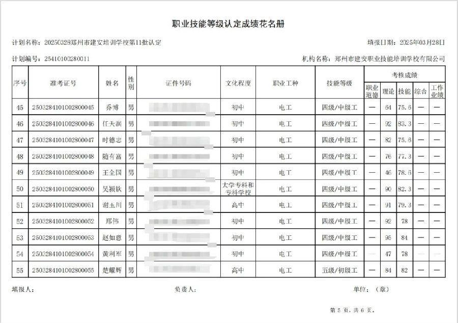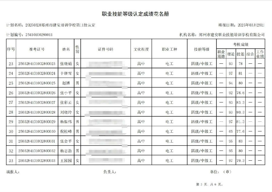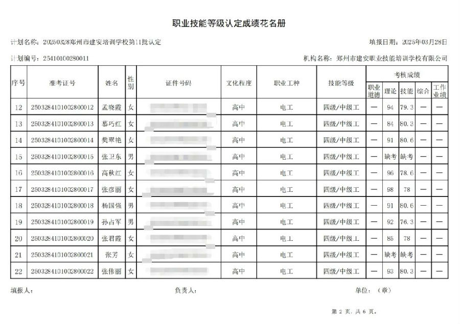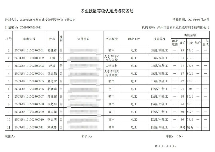2025年3月28日,在郑州市建安职业技能培训学校进行的第11批次【电工】职业技能等级认定考试,阅卷工作已结束,现将各位考生成绩予以公示,公示期为5天,公示期限为:2025年3月29日至2025年4月2日。