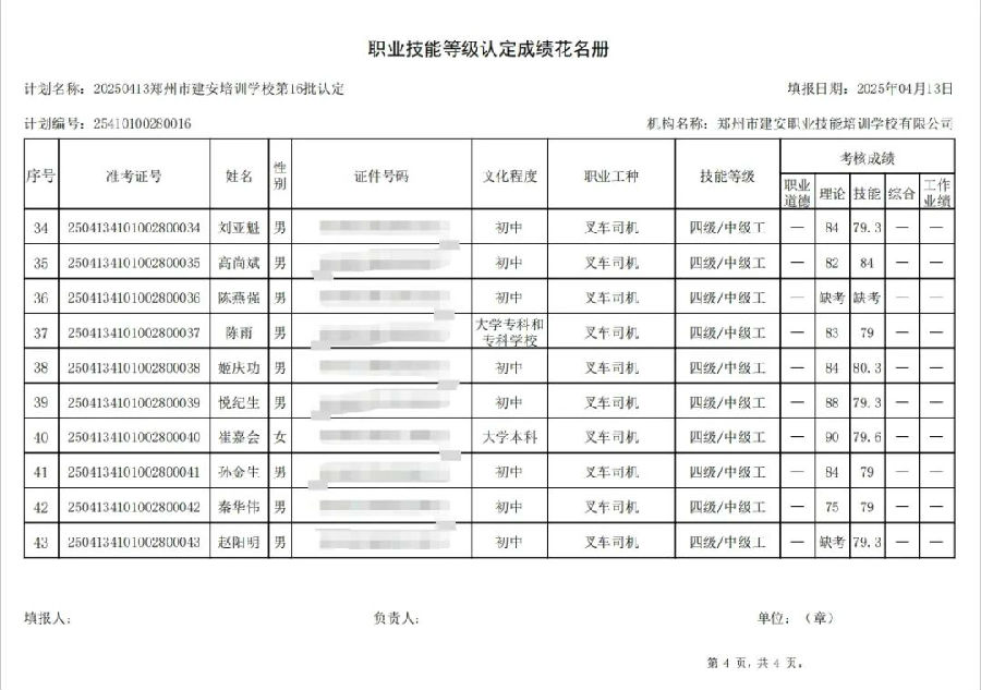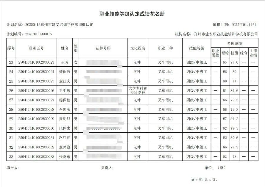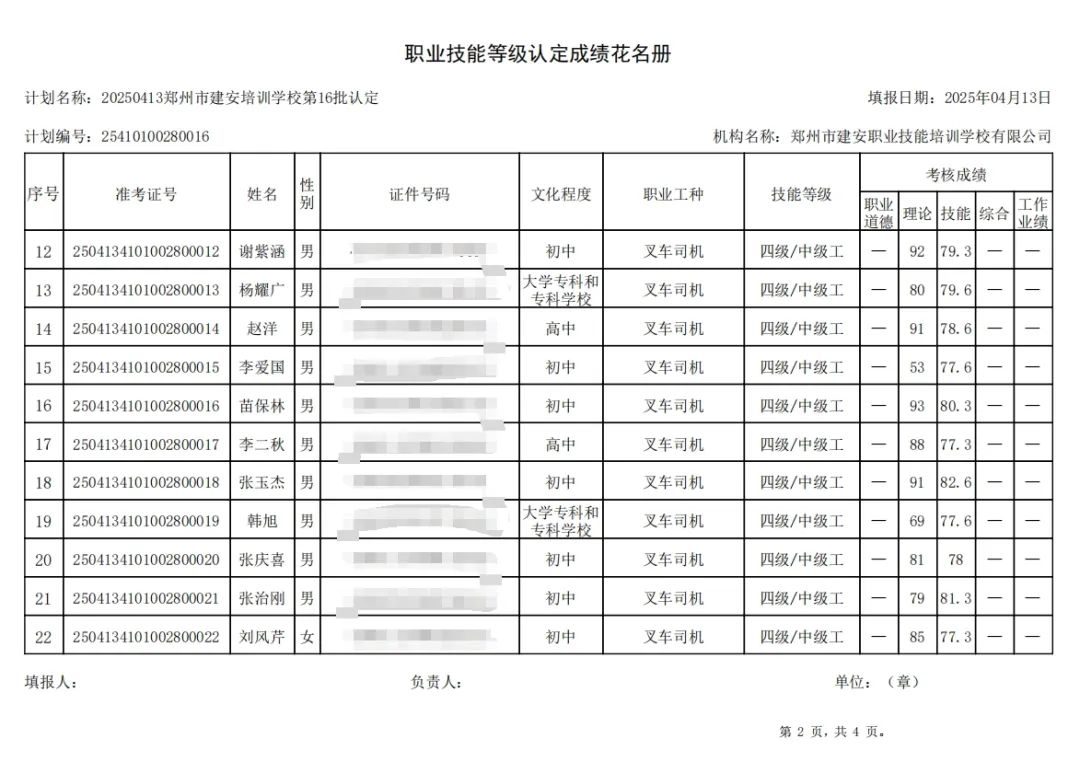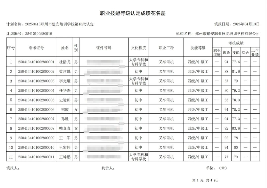 2025年4月13日,在郑州市建安职业技能培训学校进行的第16批次【叉车司机】职业技能等级认定考试,阅卷工作已结束,现将各位考生成绩予以公示,公示期为5天,公示期限为:2025年4月14日至2025年4月18日。