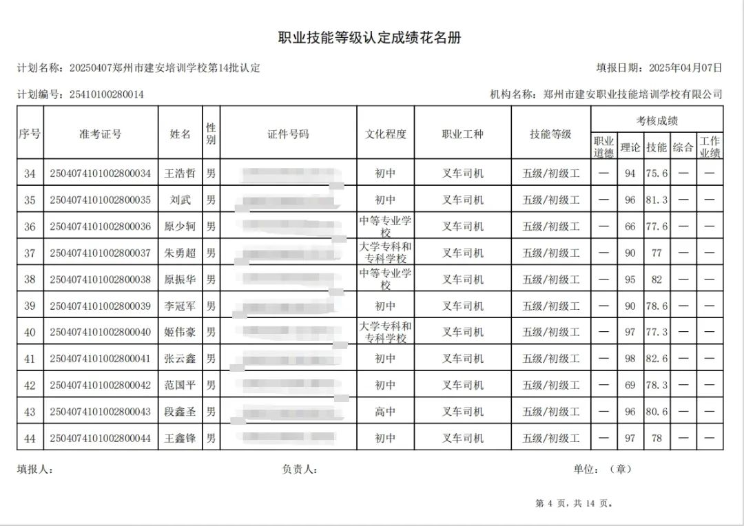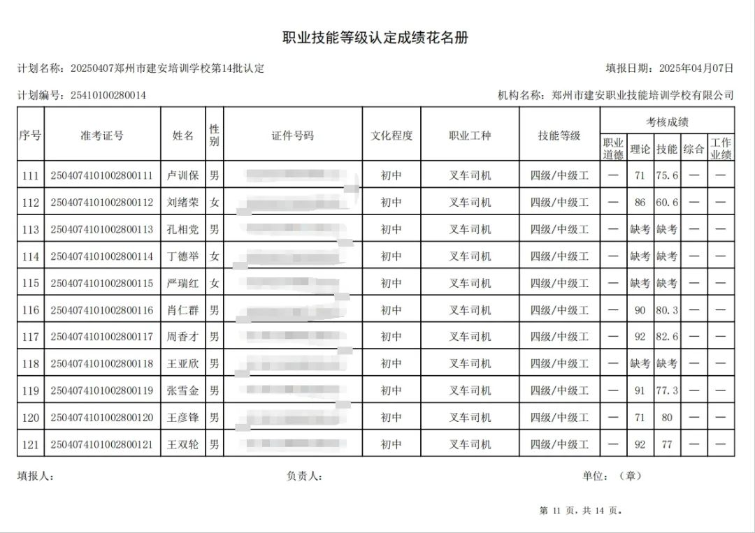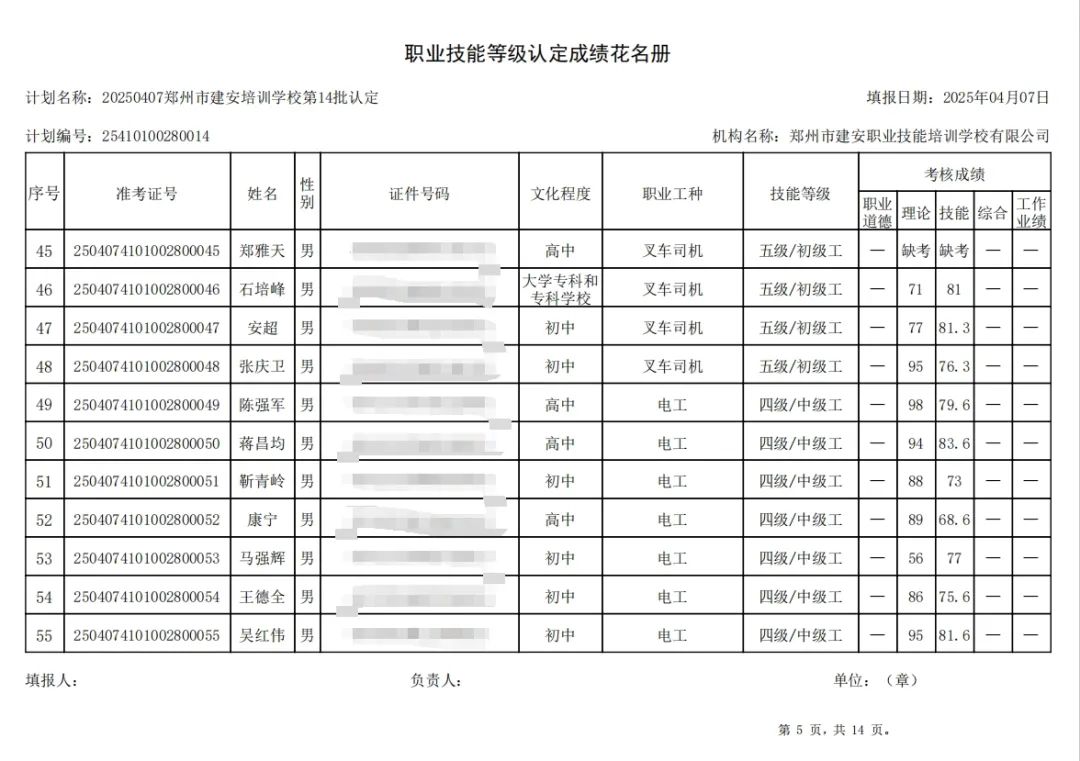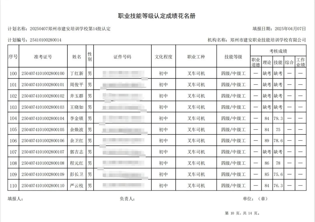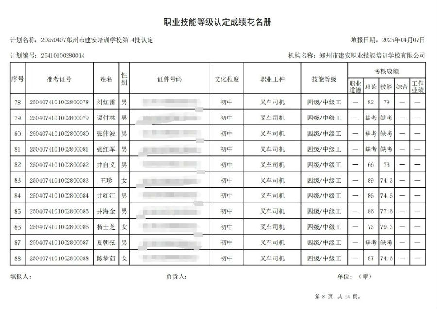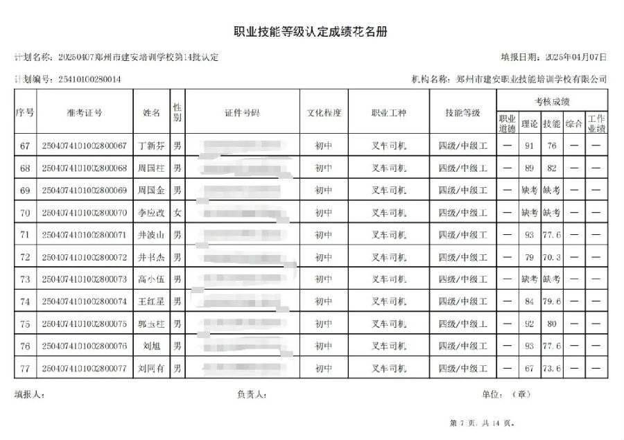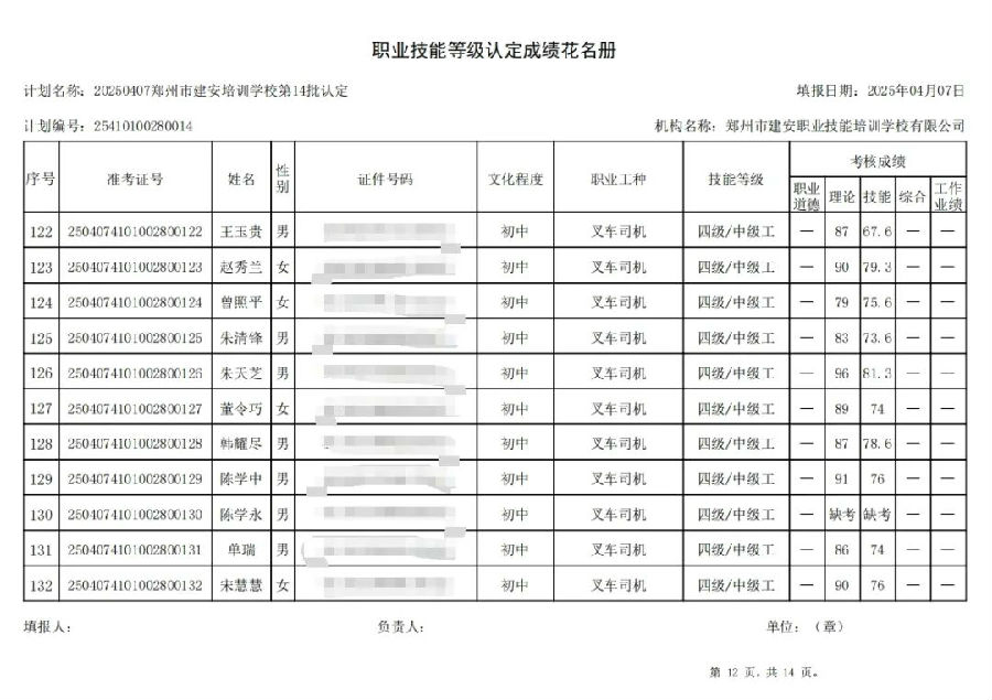 2025年4月7日,在郑州市建安职业技能培训学校进行的第14批次【叉车司机】【电工】职业技能等级认定考试,阅卷工作已结束,现将各位考生成绩予以公示,公示期为5天,公示期限为:2025年4月8日至2025年4月12日。