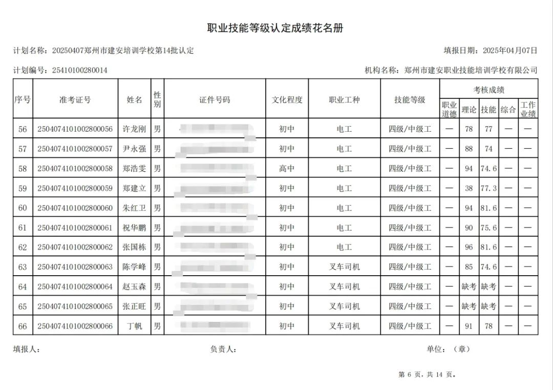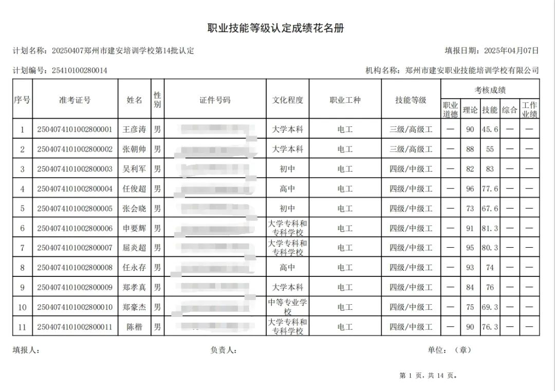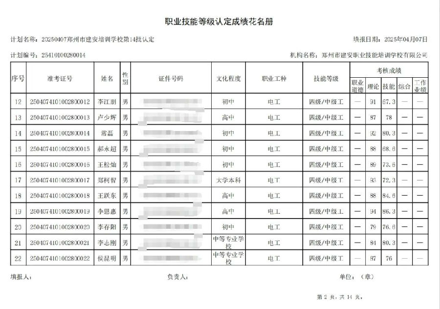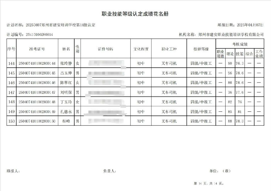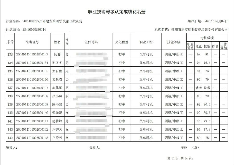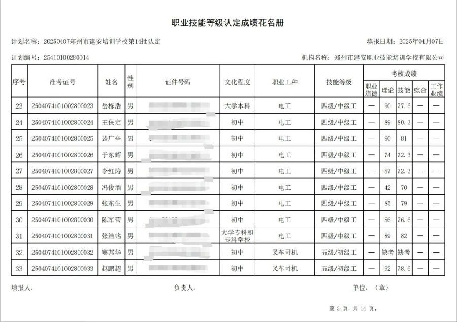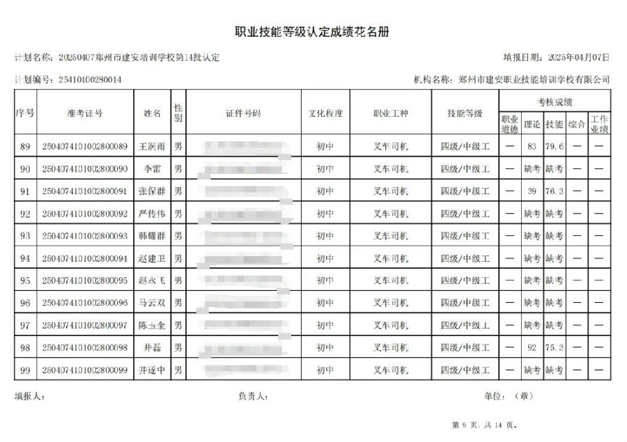 2025年4月7日,在郑州市建安职业技能培训学校进行的第14批次【叉车司机】【电工】职业技能等级认定考试,阅卷工作已结束,现将各位考生成绩予以公示,公示期为5天,公示期限为:2025年4月8日至2025年4月12日。