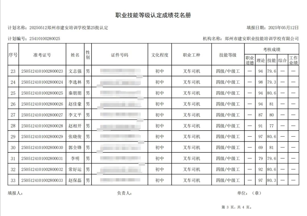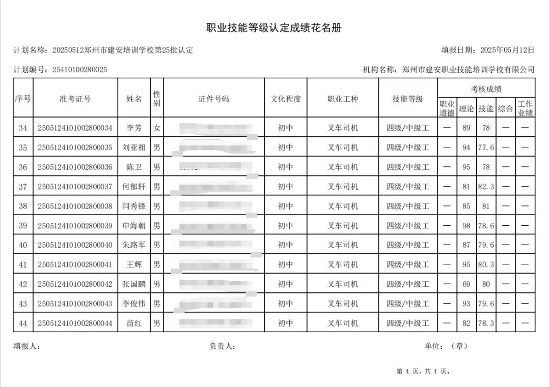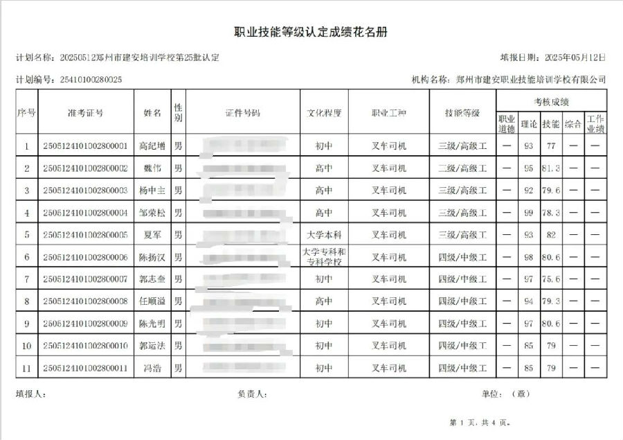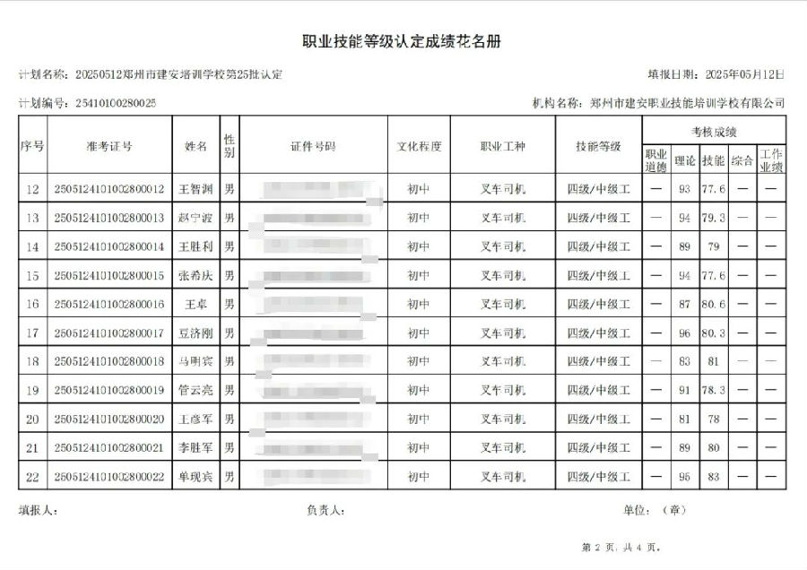 2025年5月12日,在郑州市建安职业技能培训学校进行的第25批次【叉车司机】职业技能等级认定考试,阅卷工作已结束,现将各位考生成绩予以公示,公示期为5天,公示期限为:2025年5月15日至2025年5月19日。