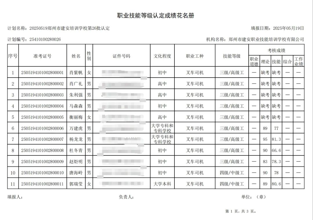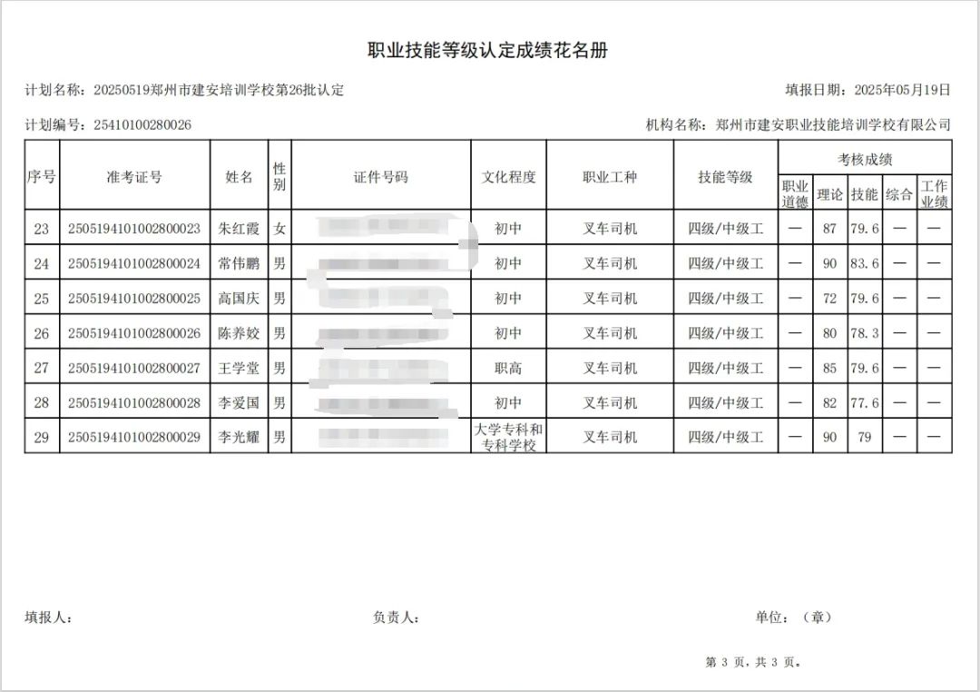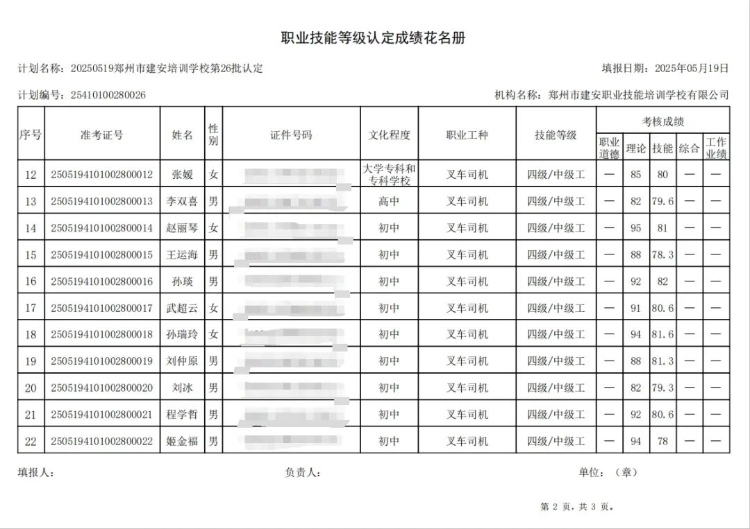 2025年5月19日,在郑州市建安职业技能培训学校进行的第26批次【叉车司机】职业技能等级认定考试,阅卷工作已结束,现将各位考生成绩予以公示,公示期为5天,公示期限为:2025年5月20日至2025年5月24日。