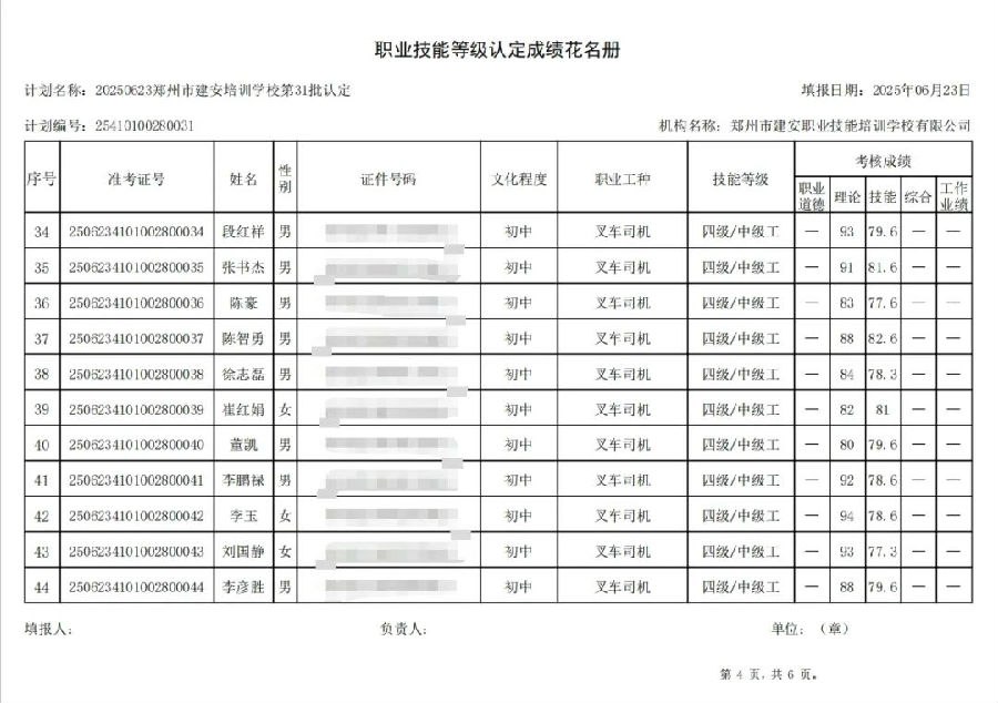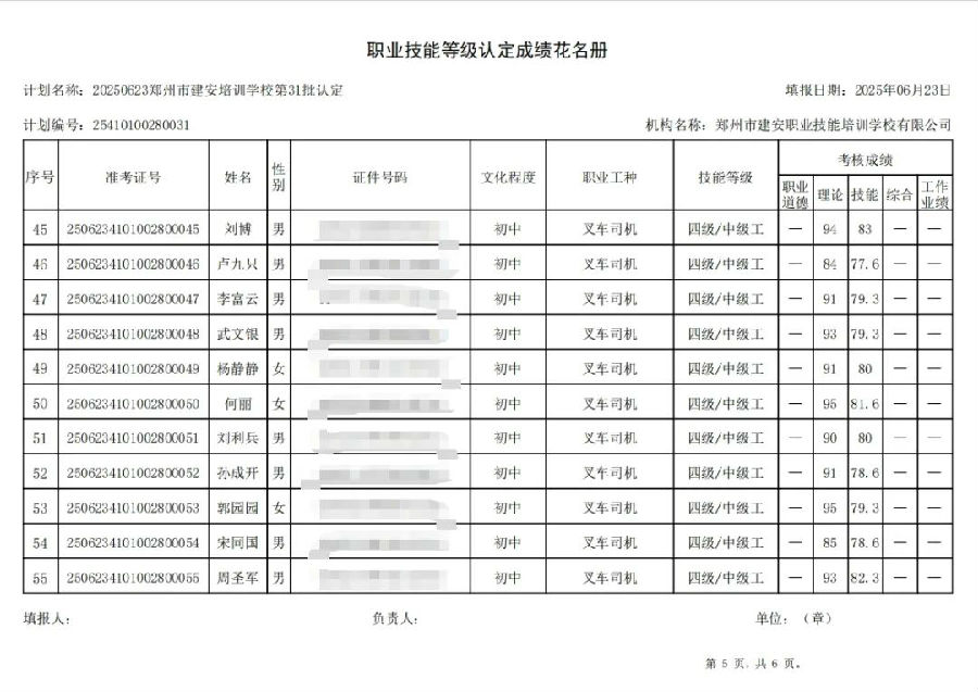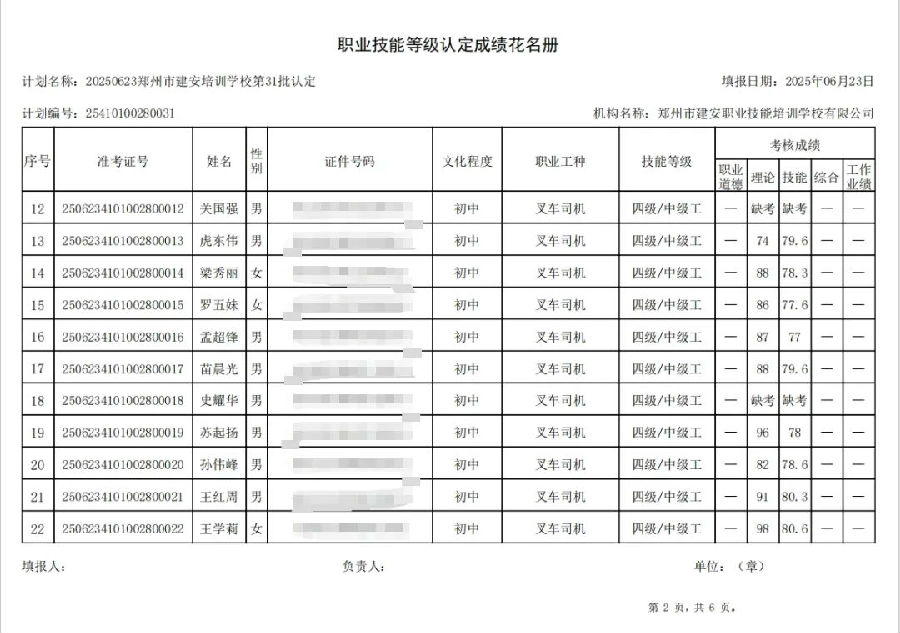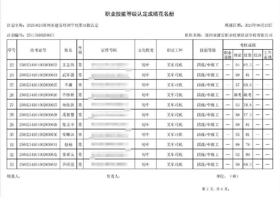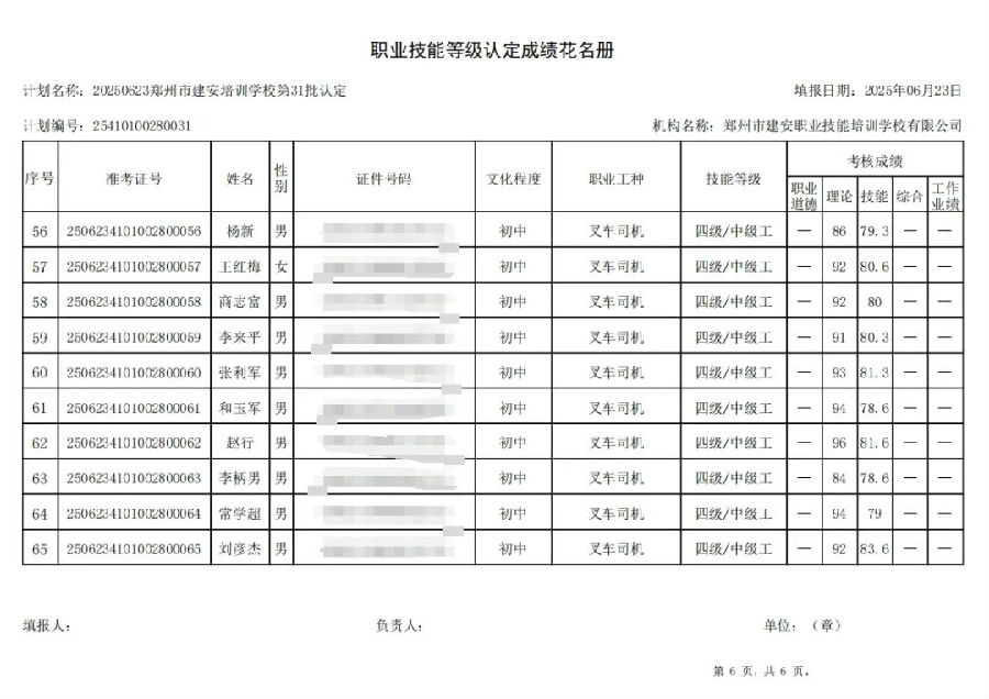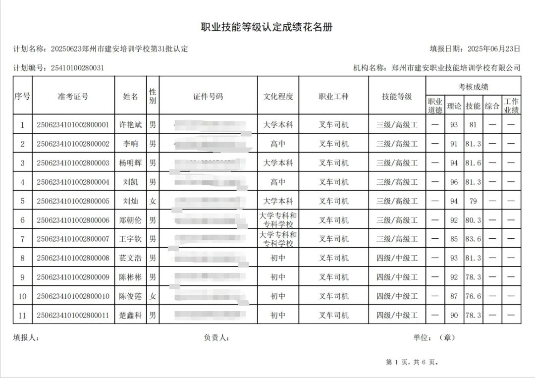2025年6月23日,在郑州市建安职业技能培训学校进行的第31批次【叉车司机】职业技能等级认定考试,阅卷工作已结束,现将各位考生成绩予以公示,公示期为5天,公示期限为:2025年6月27日至2025年6月31日。