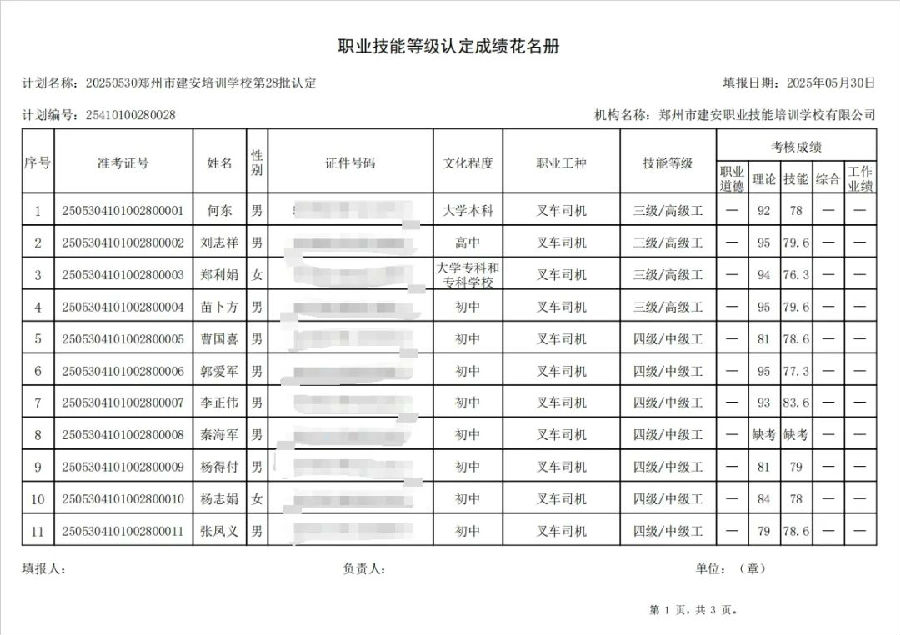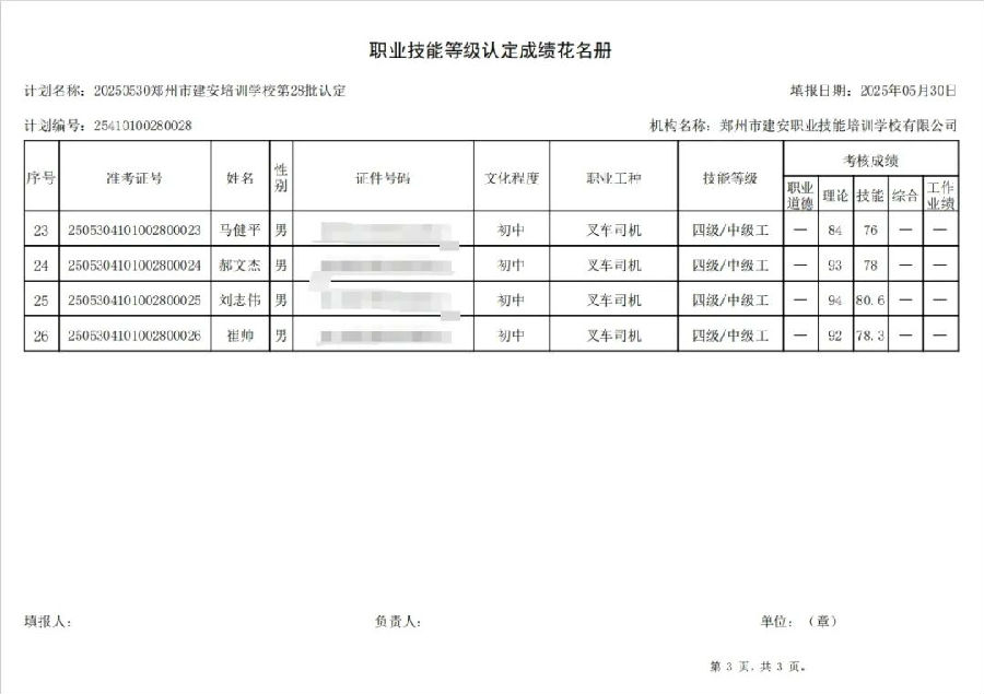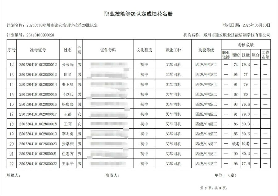 2025年5月30日,在郑州市建安职业技能培训学校进行的第28批次【叉车司机】职业技能等级认定考试,阅卷工作已结束,现将各位考生成绩予以公示,公示期为5天,公示期限为:2025年6月4日至2025年6月8日。