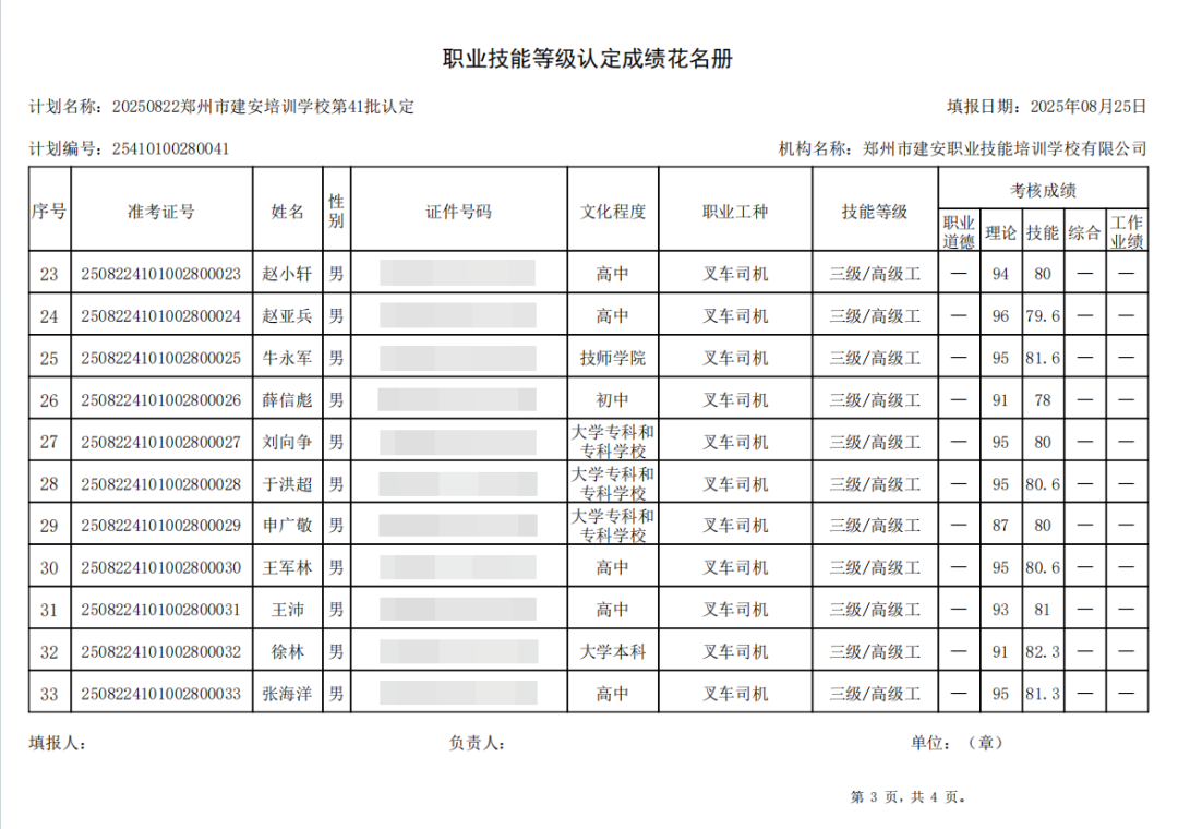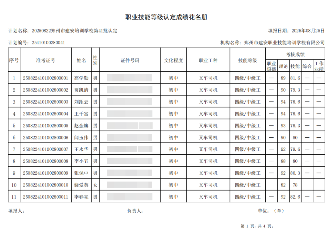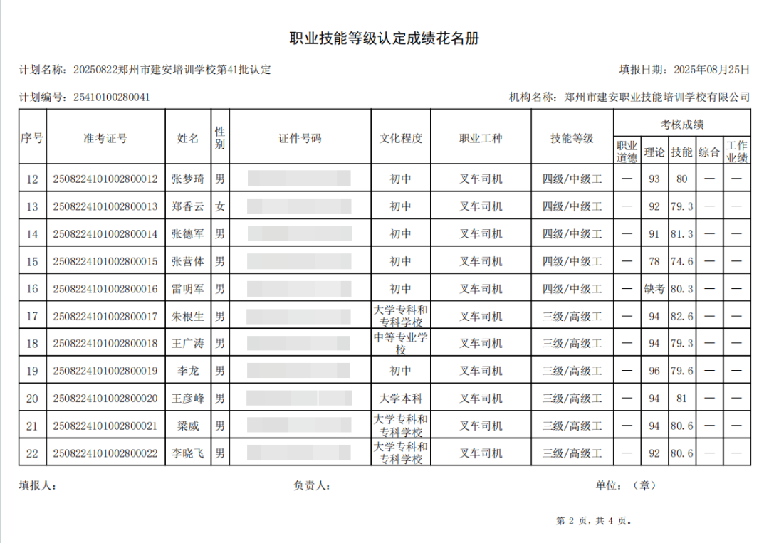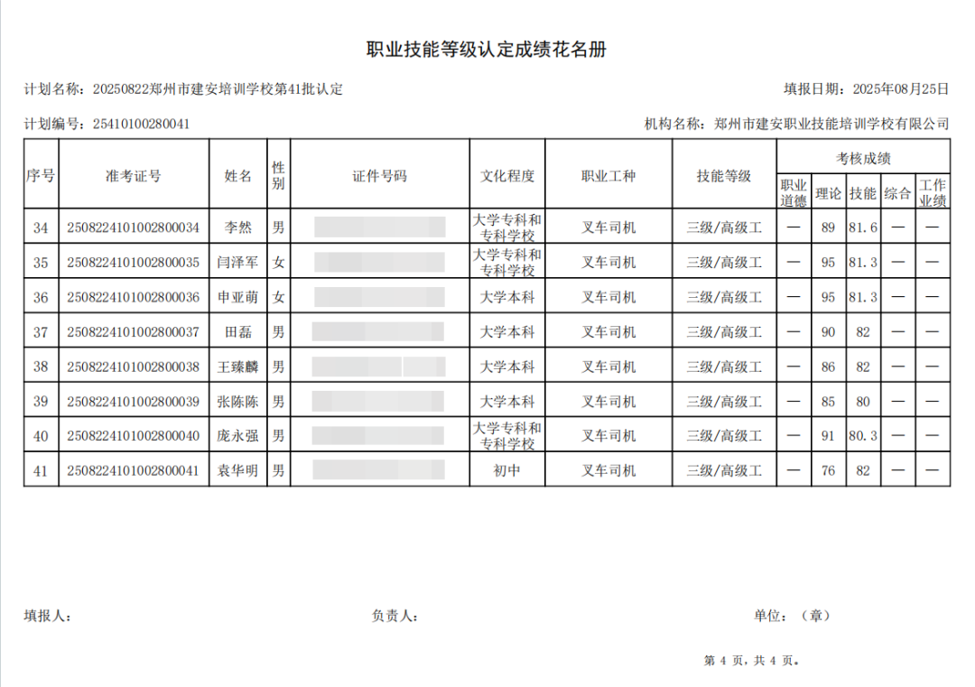 2025年8月22日,在郑州市建安职业技能培训学校进行的第41批【叉车司机】职业技能等级认定考试,阅卷工作已结束,现将各位考生成绩予以公示,公示期为5天,公示期限为:2025年8月28日至2025年9月1日。