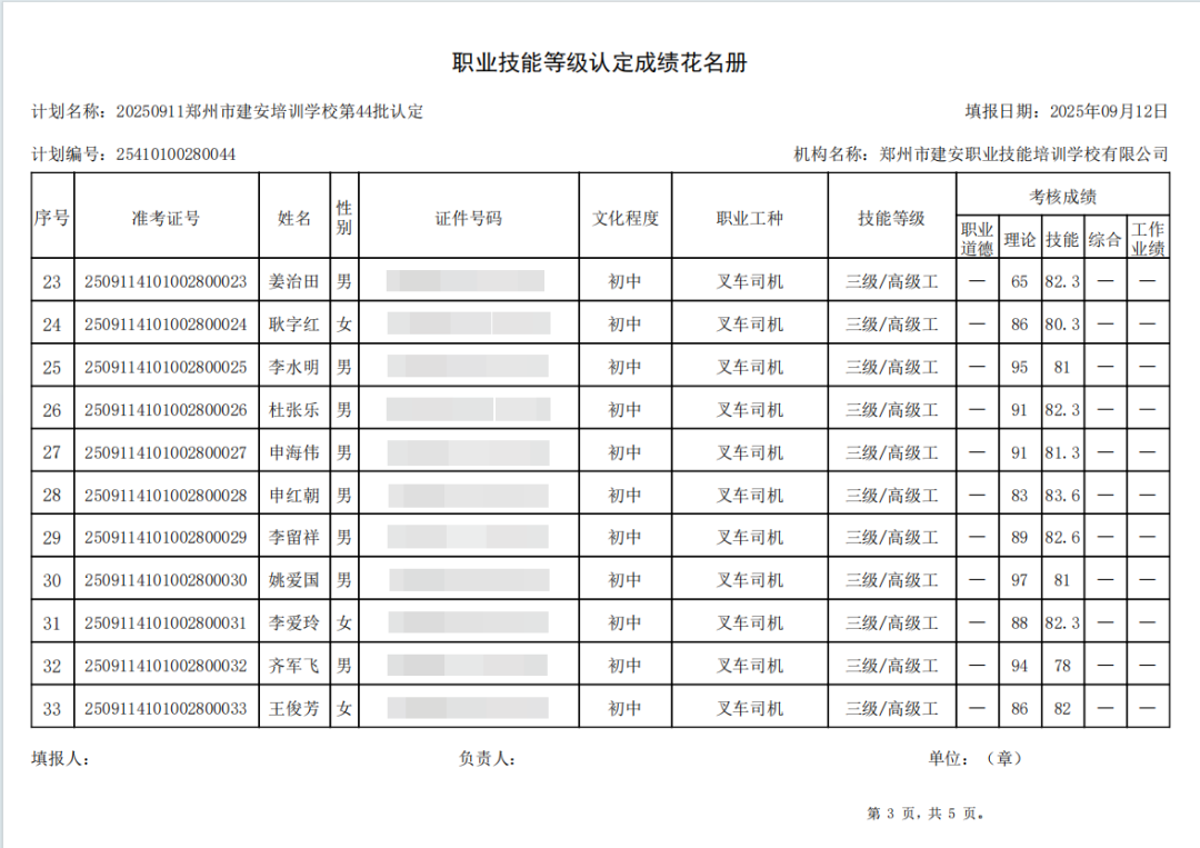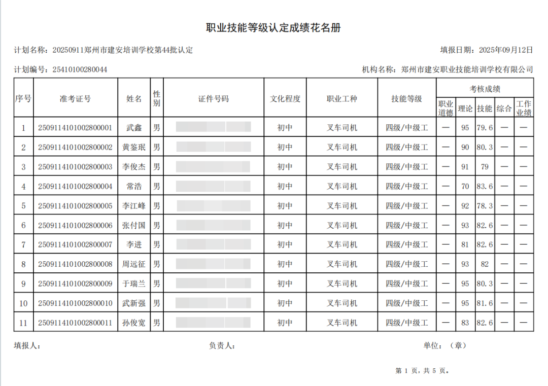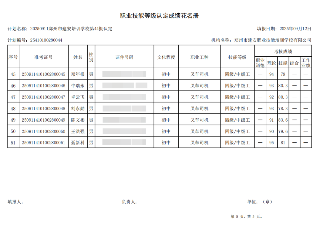 2025年9月11日,在郑州市建安职业技能培训学校进行的第44批【叉车司机】职业技能等级认定考试,阅卷工作已结束,现将各位考生成绩予以公示,公示期为5天,公示期限为:2025年9月15日至2025年9月19日。