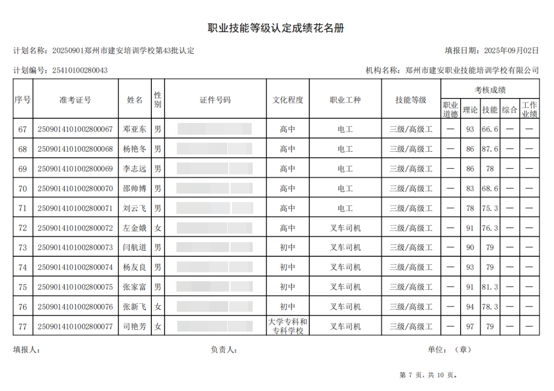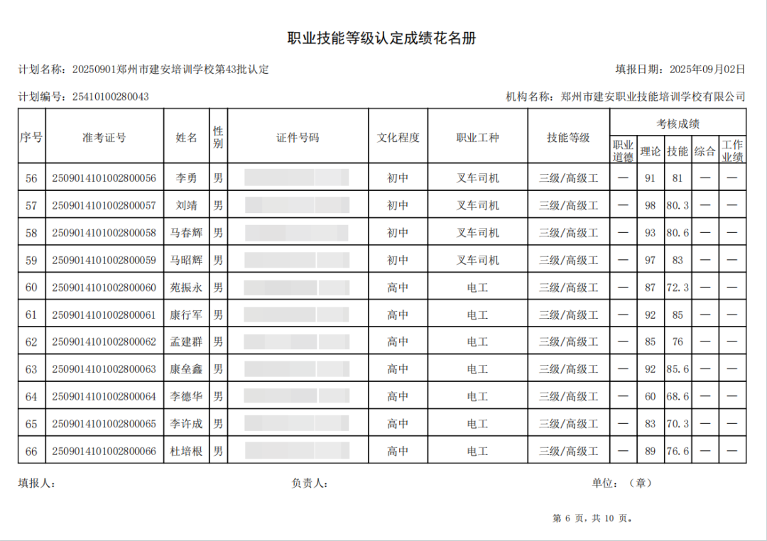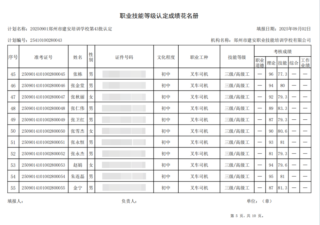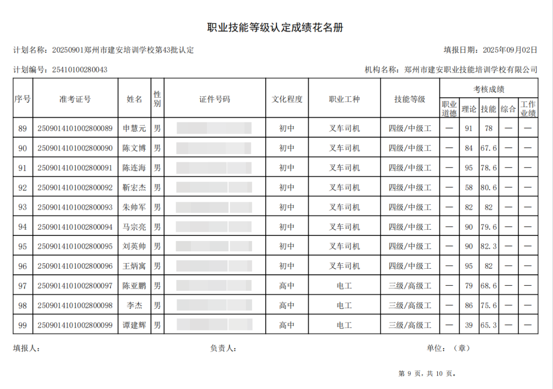 2025年9月1日,在郑州市建安职业技能培训学校进行的第43批【叉车司机】【电工】职业技能等级认定考试,阅卷工作已结束,现将各位考生成绩予以公示,公示期为5天,公示期限为:2025年9月2日至2025年9月6日。