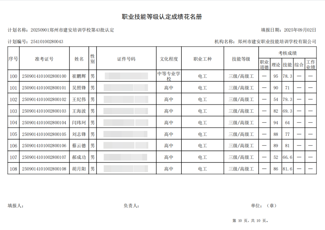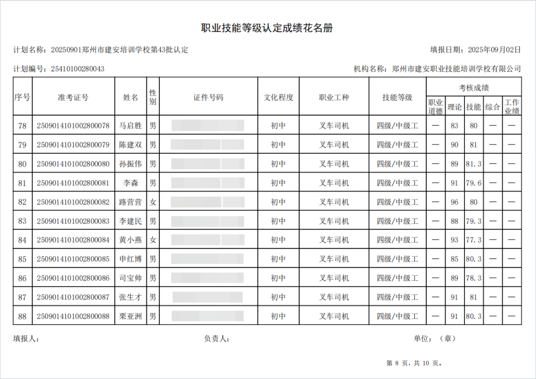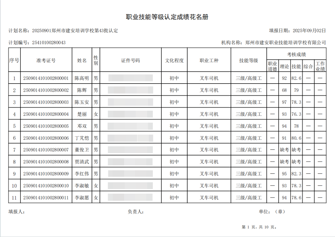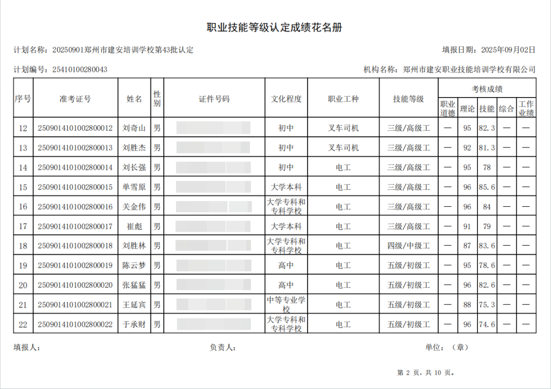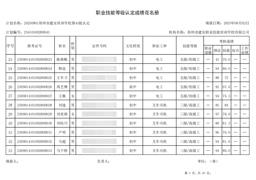 2025年9月1日,在郑州市建安职业技能培训学校进行的第43批【叉车司机】【电工】职业技能等级认定考试,阅卷工作已结束,现将各位考生成绩予以公示,公示期为5天,公示期限为:2025年9月2日至2025年9月6日。
