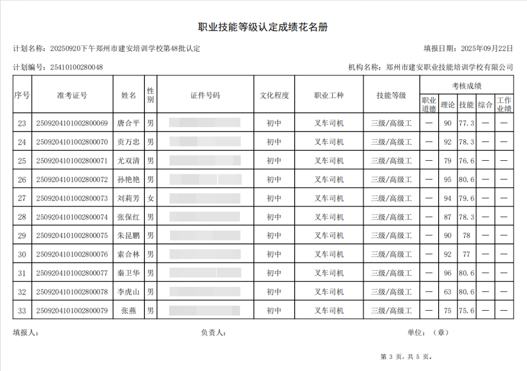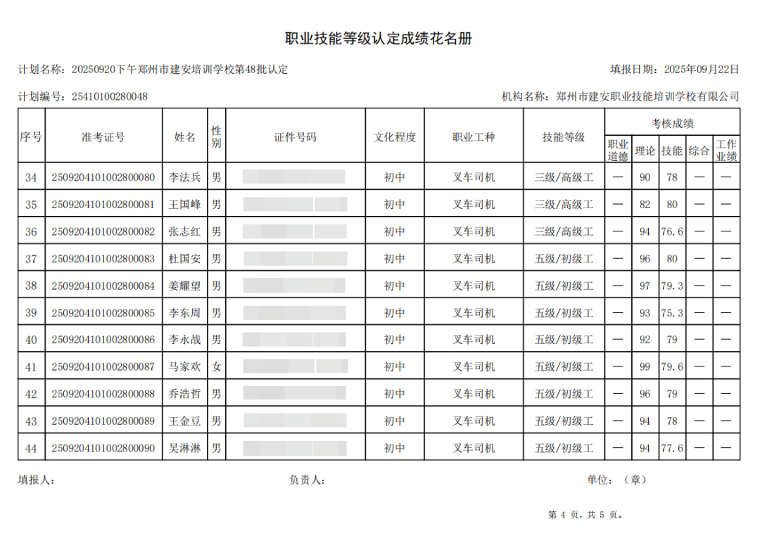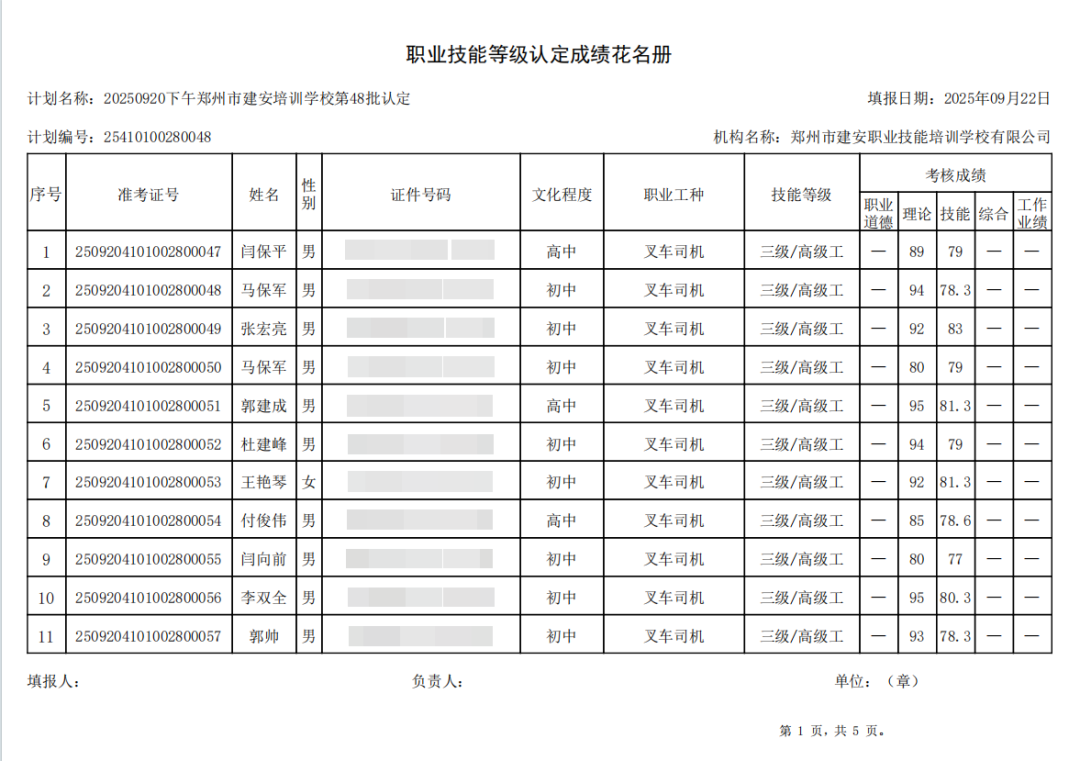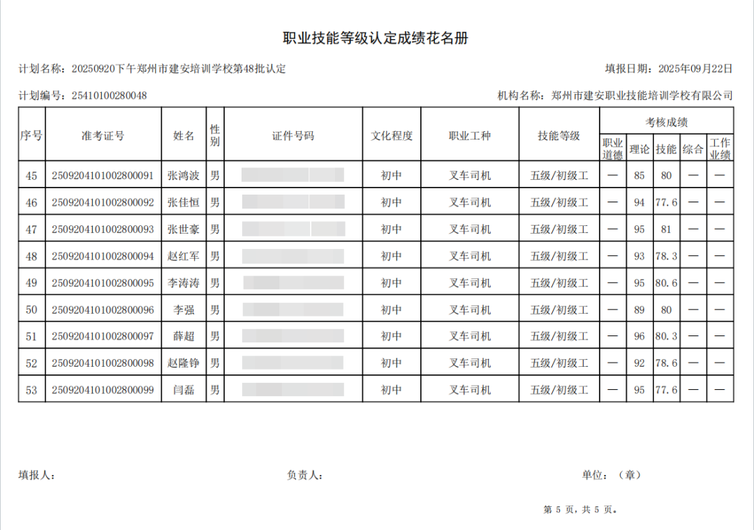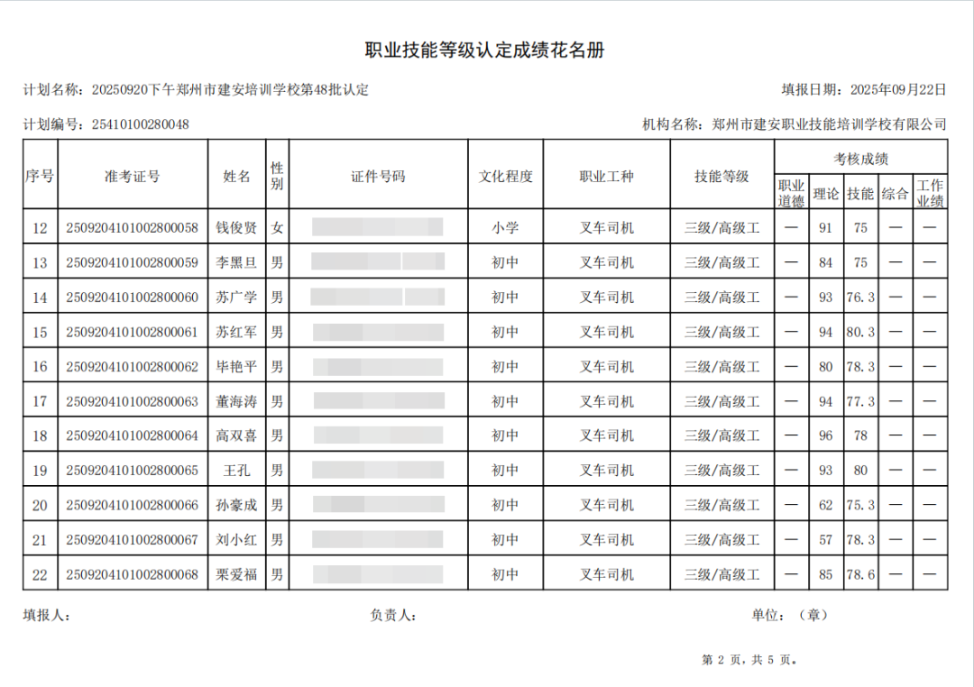 2025年9月20日下午,在郑州市建安职业技能培训学校进行的第48批【叉车司机】职业技能等级认定考试,阅卷工作已结束,现将各位考生成绩予以公示,公示期为5天,公示期限为:2025年9月28日至2025年10月2日。