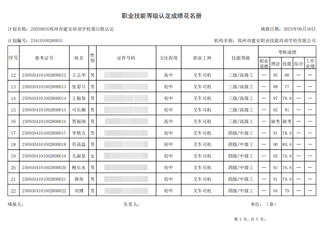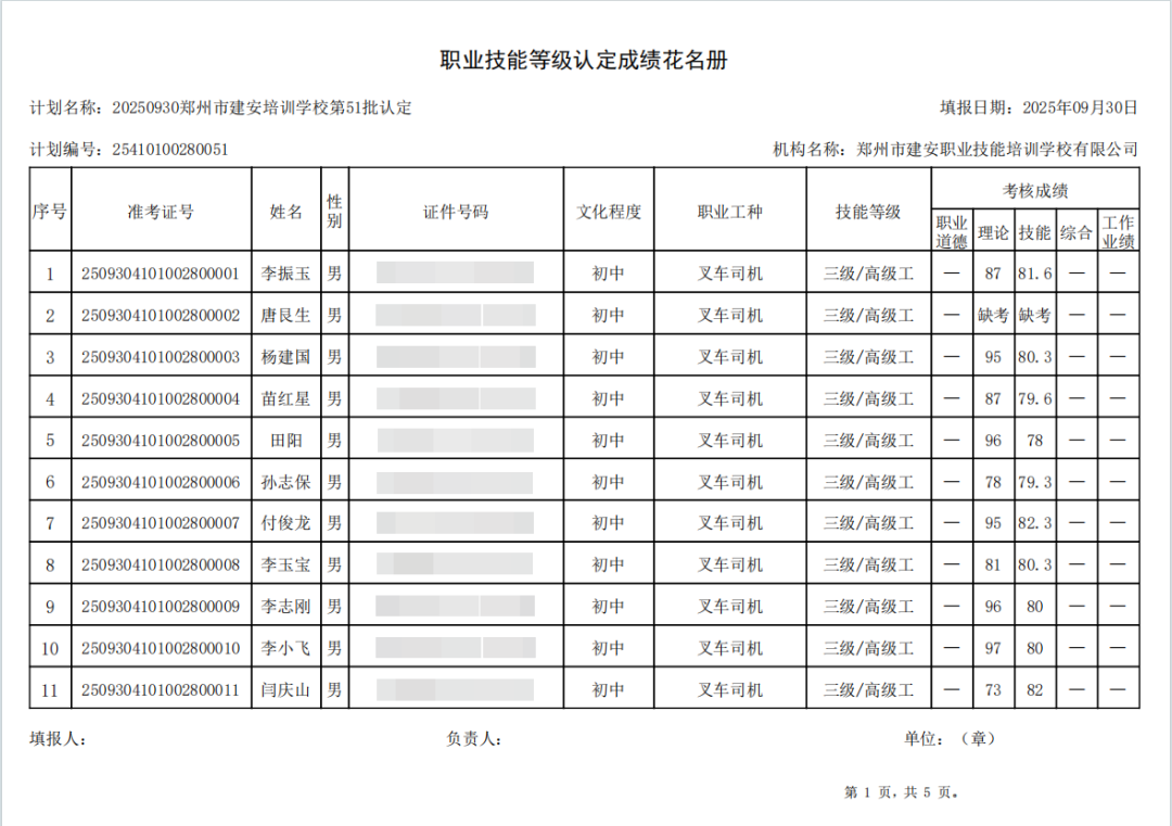 2025年9月30日,在郑州市建安职业技能培训学校进行的第51批【叉车司机】职业技能等级认定考试,阅卷工作已结束,现将各位考生成绩予以公示,公示期为5天,公示期限为:2025年9月30日至2025年10月4日。