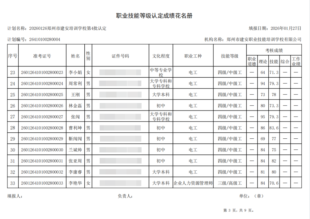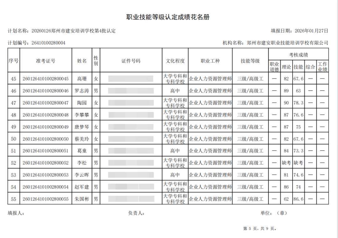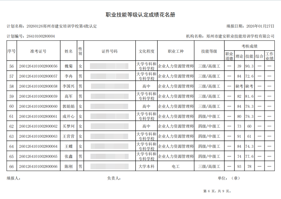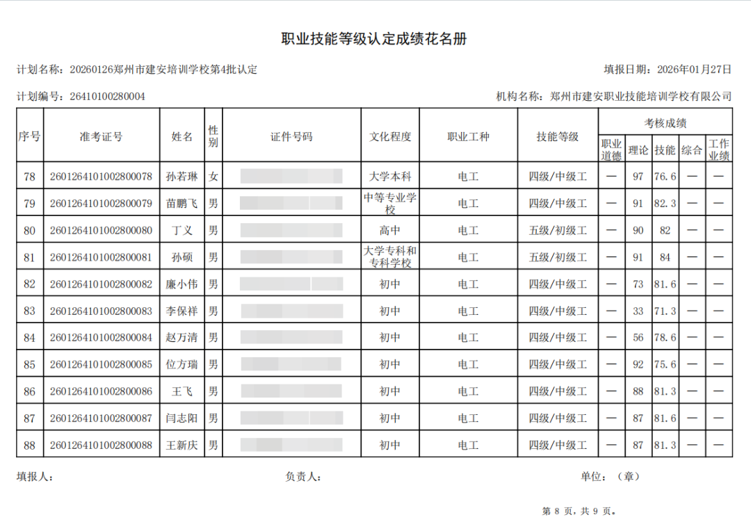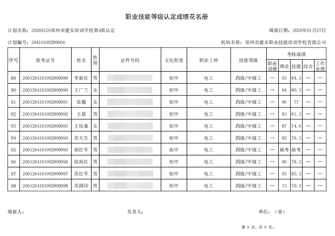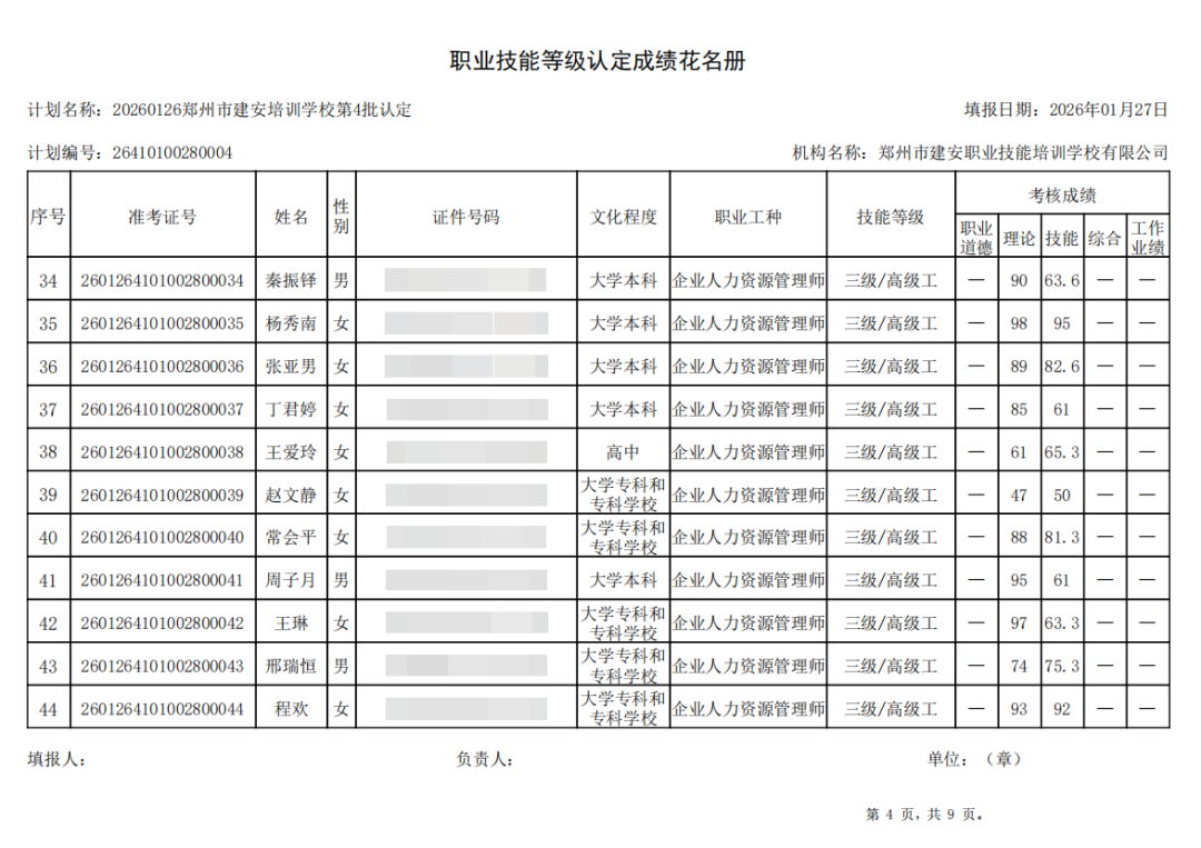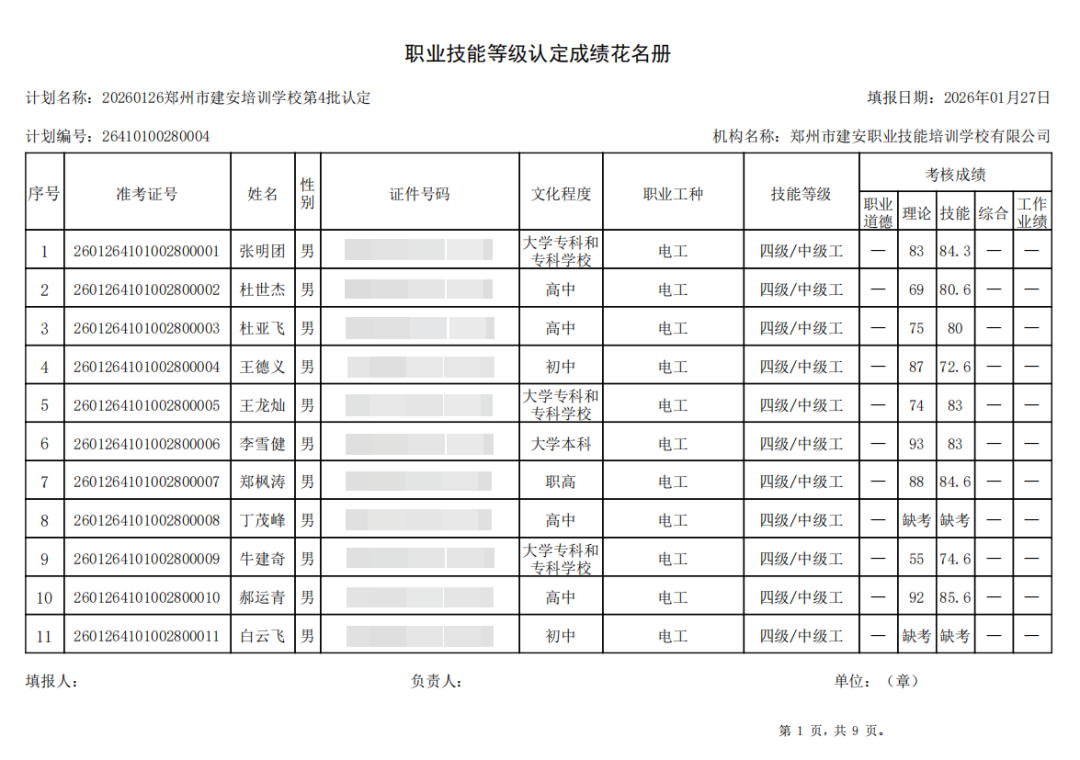 2026年1月26日,在郑州市建安职业技能培训学校进行的2026年第4批【电工】【企业人力资源管理师】职业技能等级认定考试,阅卷工作已结束,现将各位考生成绩予以公示,公示期为5天,公示期限为:2026年1月29日至2026年2月2日。