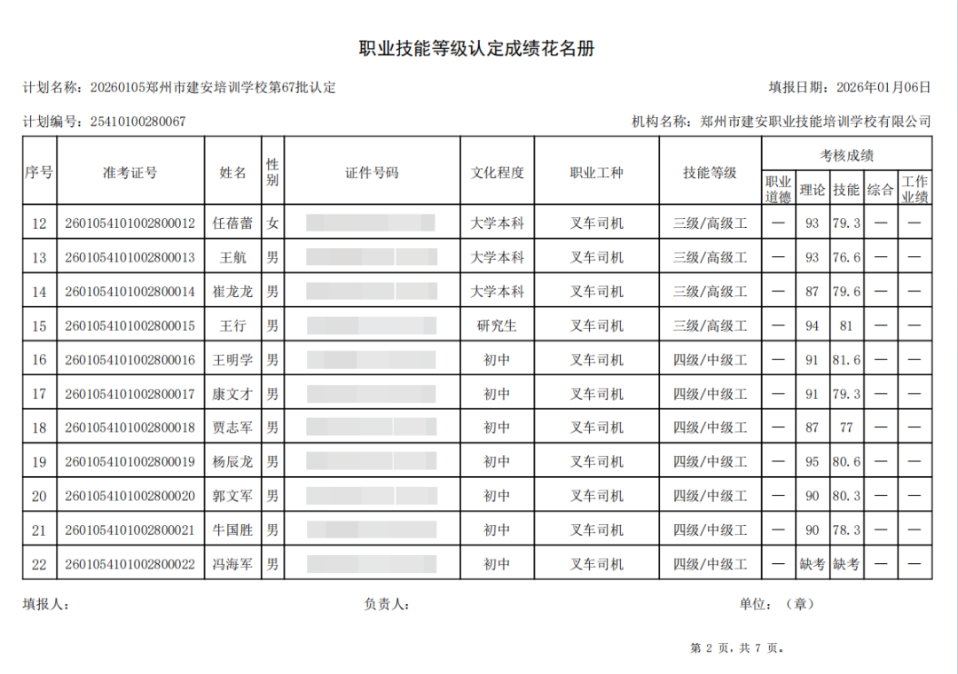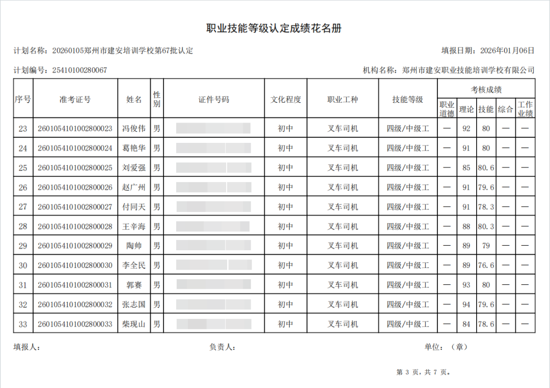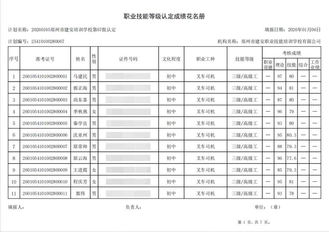 2026年1月5日,在郑州市建安职业技能培训学校进行的第67批【叉车司机】职业技能等级认定考试,阅卷工作已结束,现将各位考生成绩予以公示,公示期为5天,公示期限为:2026年1月6日至2026年1月10日。