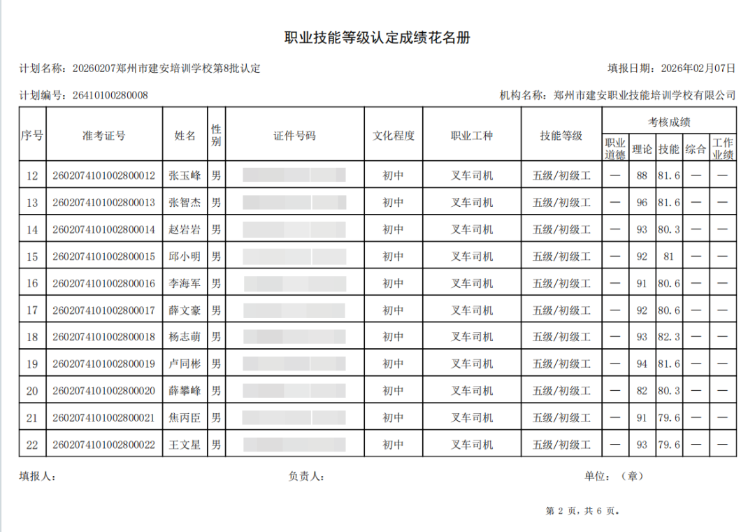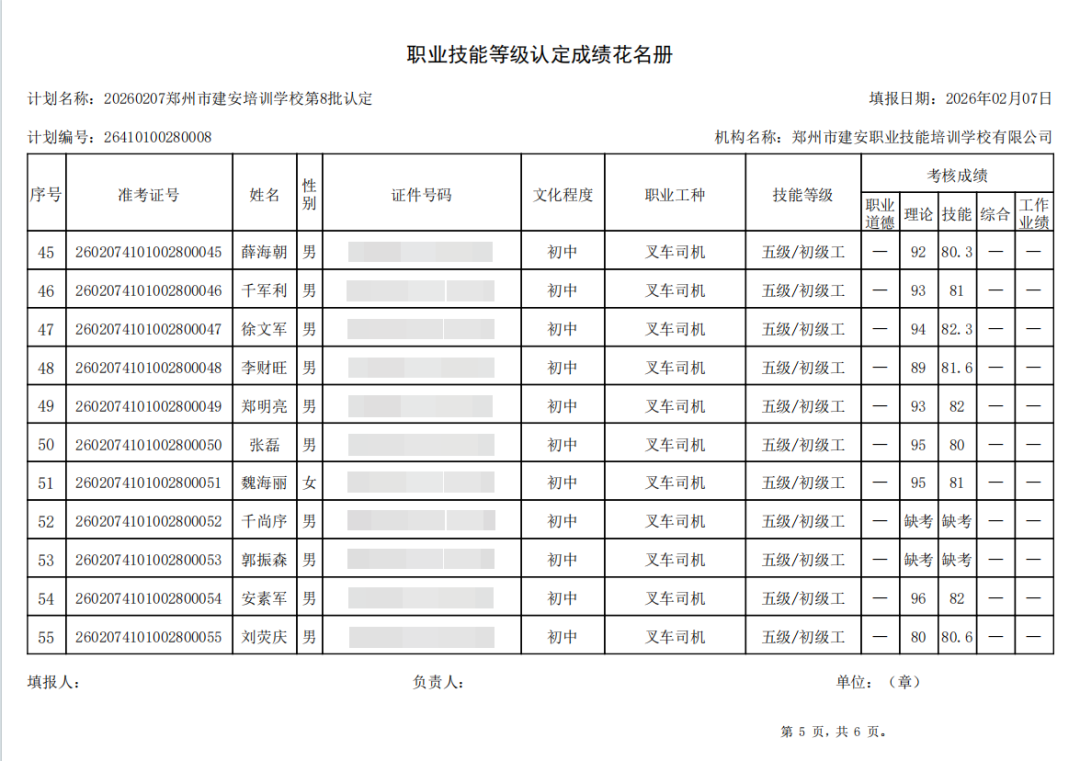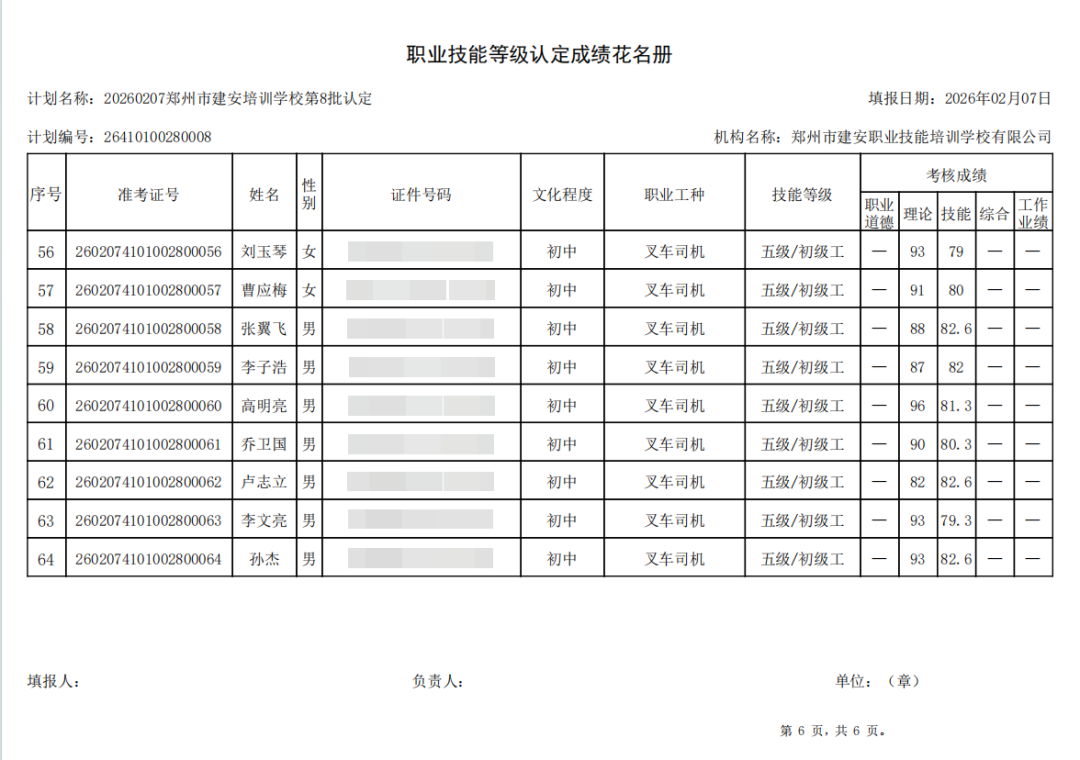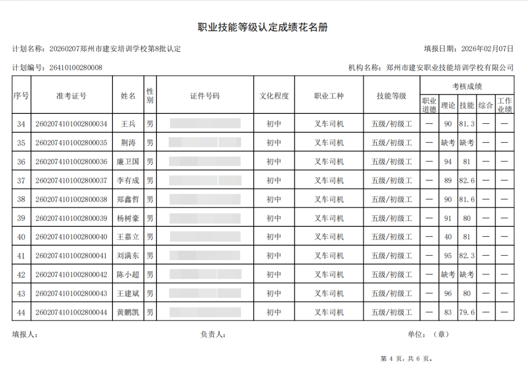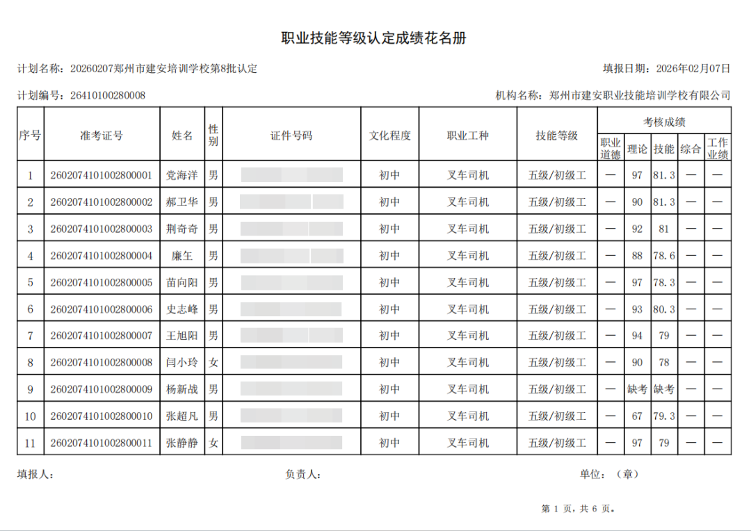 2026年2月7日,在郑州市建安职业技能培训学校进行的2026年第8批【叉车司机】职业技能等级认定考试,阅卷工作已结束,现将各位考生成绩予以公示,公示期为5天,公示期限为:2026年2月11日至2026年2月15日。