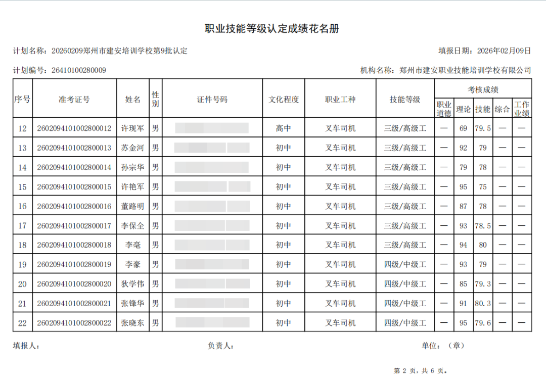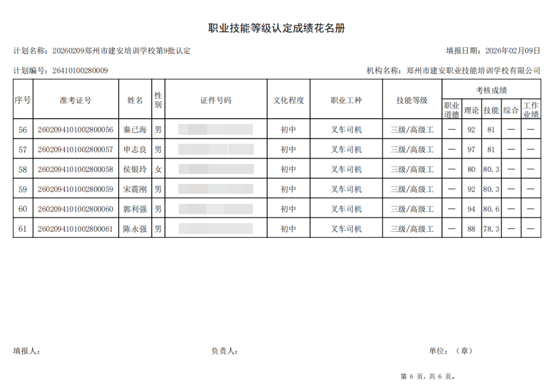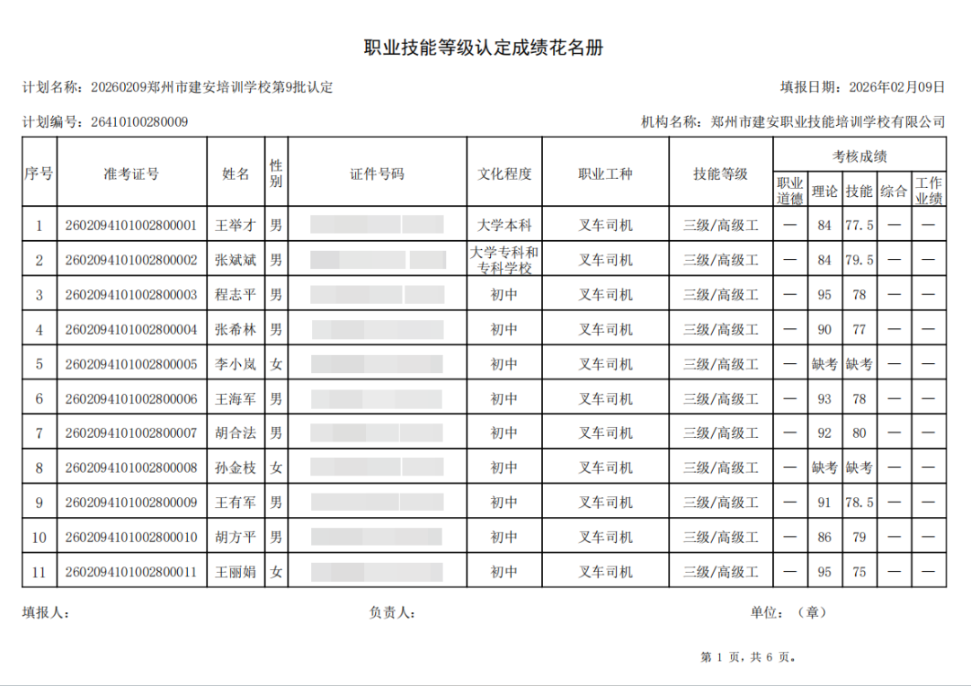2026年2月9日,在郑州市建安职业技能培训学校进行的2026年第9批【叉车司机】职业技能等级认定考试,阅卷工作已结束,现将各位考生成绩予以公示,公示期为5天,公示期限为:2026年2月11日至2026年2月15日。