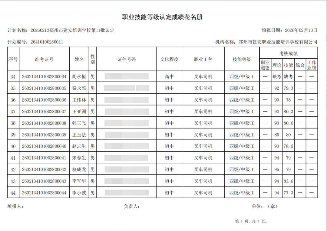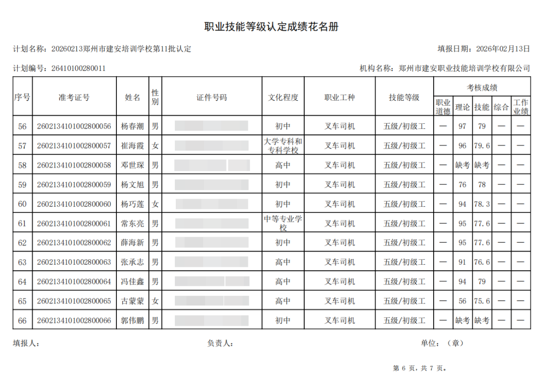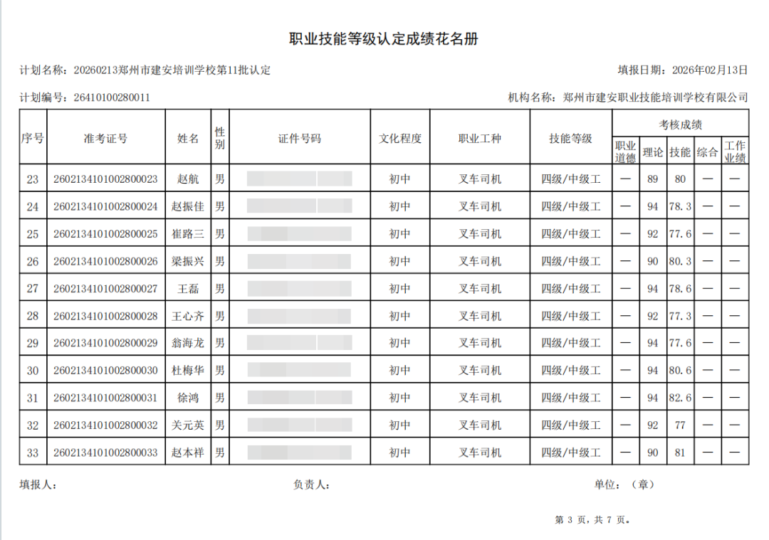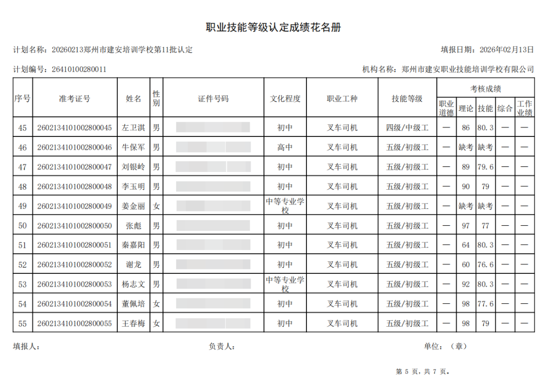2026年2月13日,在郑州市建安职业技能培训学校进行的2026年第11批【叉车司机】职业技能等级认定考试,阅卷工作已结束,现将各位考生成绩予以公示,公示期为5天,公示期限为:2026年2月14日至2026年2月18日。