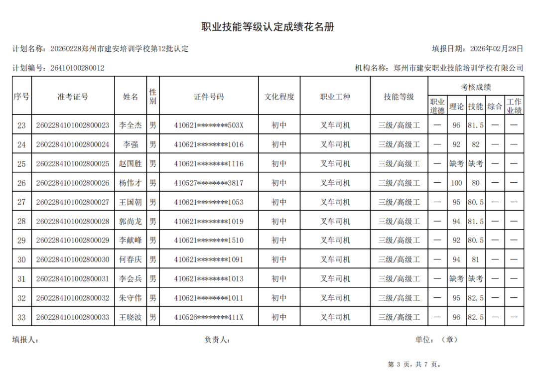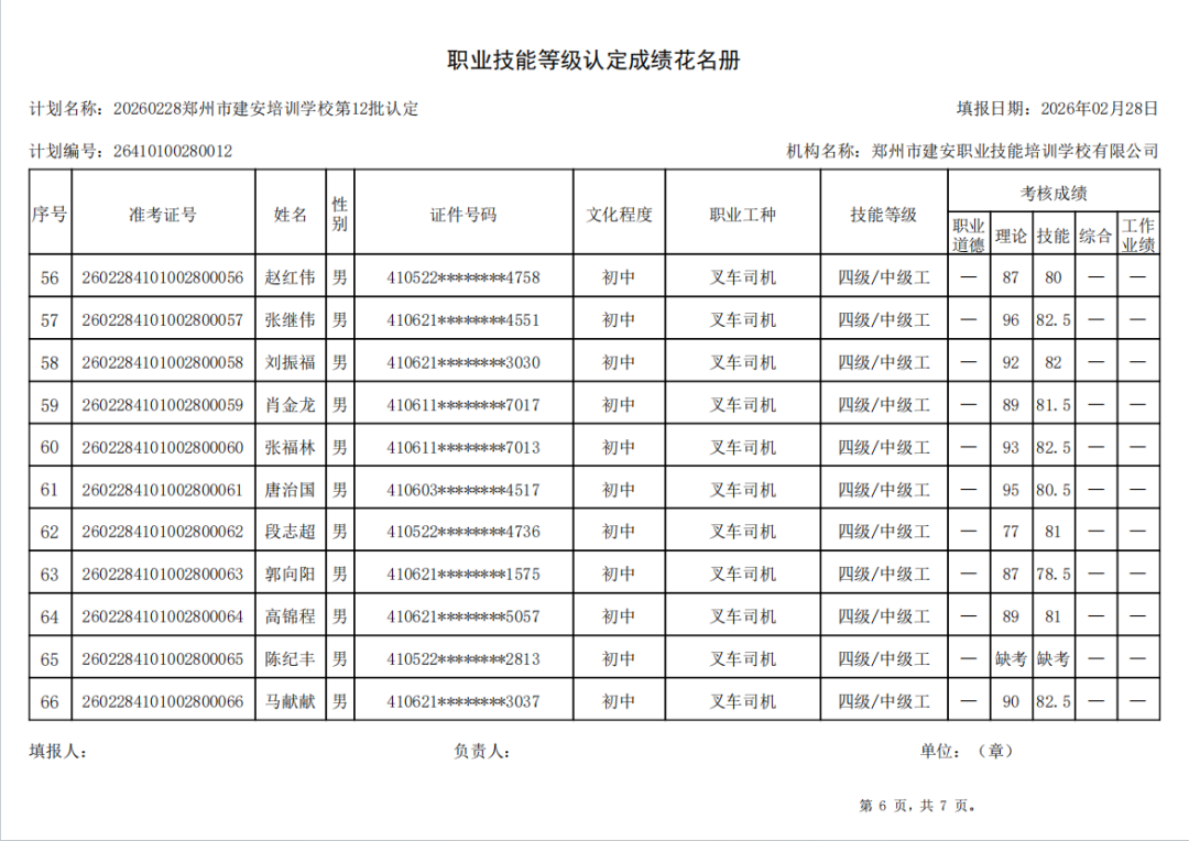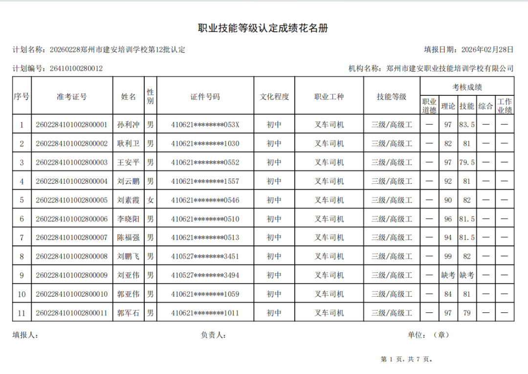 2026年2月28日,在郑州市建安职业技能培训学校进行的第12批【叉车司机】职业技能等级认定考试,阅卷工作已结束,现将各位考生成绩予以公示,公示期为5天,公示期限为:2026年2月28日至2026年3月4日。