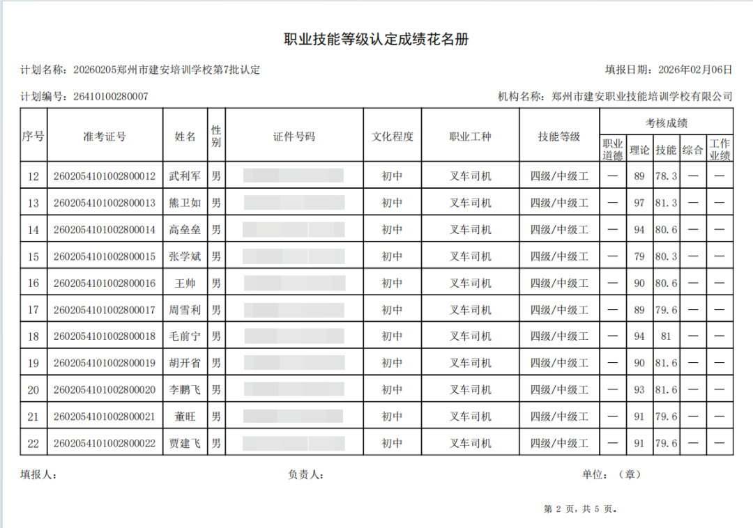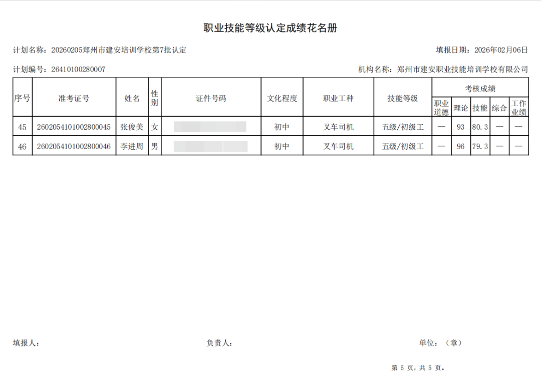 2026年2月5日,在郑州市建安职业技能培训学校进行的2026年第7批【叉车司机】职业技能等级认定考试,阅卷工作已结束,现将各位考生成绩予以公示,公示期为5天,公示期限为:2026年2月6日至2026年2月10日。
